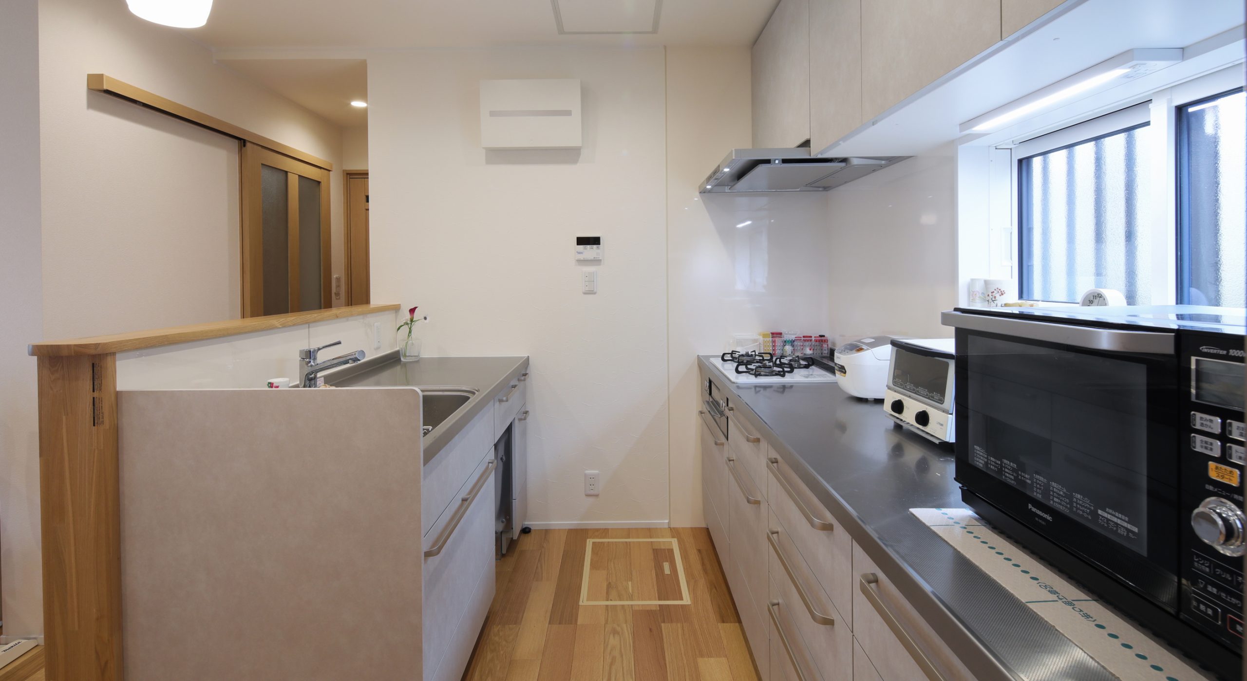 キッチンは、コンロとシンクを2列に配置することで家事動線がスムーズに。