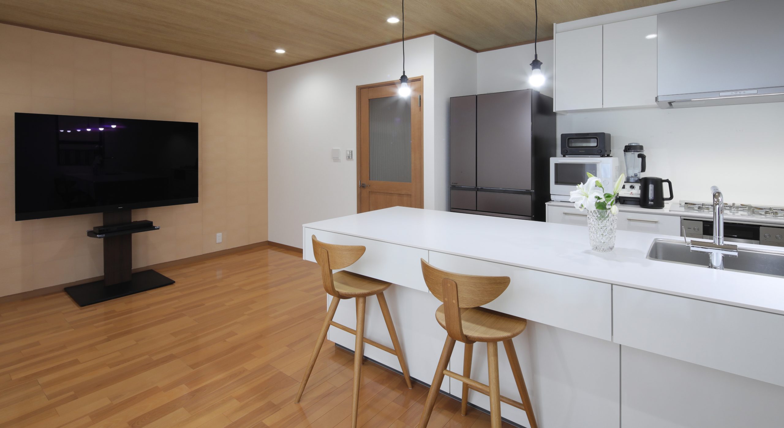 当初、お客さまからはミニキッチンを新設したいと伺っておりましたが、メーカーショールームを見学したことで思い切ってオープンキッチンを置くことに。