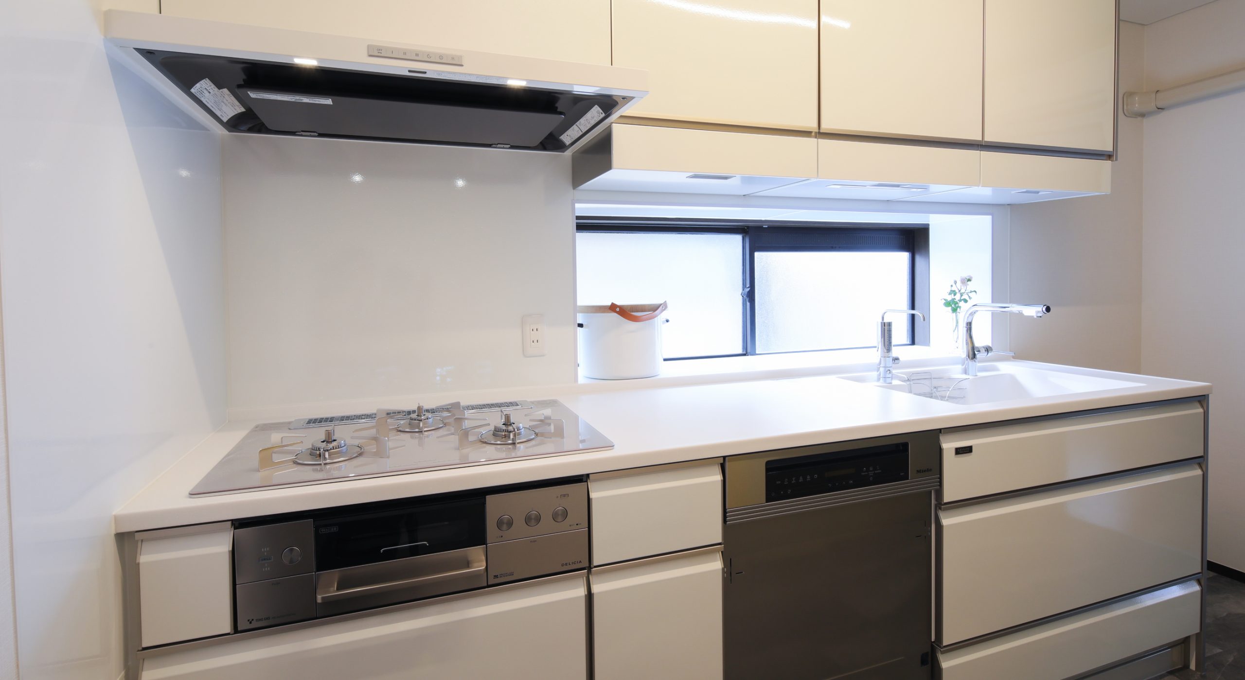キッチンは、清潔感のある白色を採用。設備は家事ラクを重視し自動料理機能付コンロのデリシアを取り入れました。