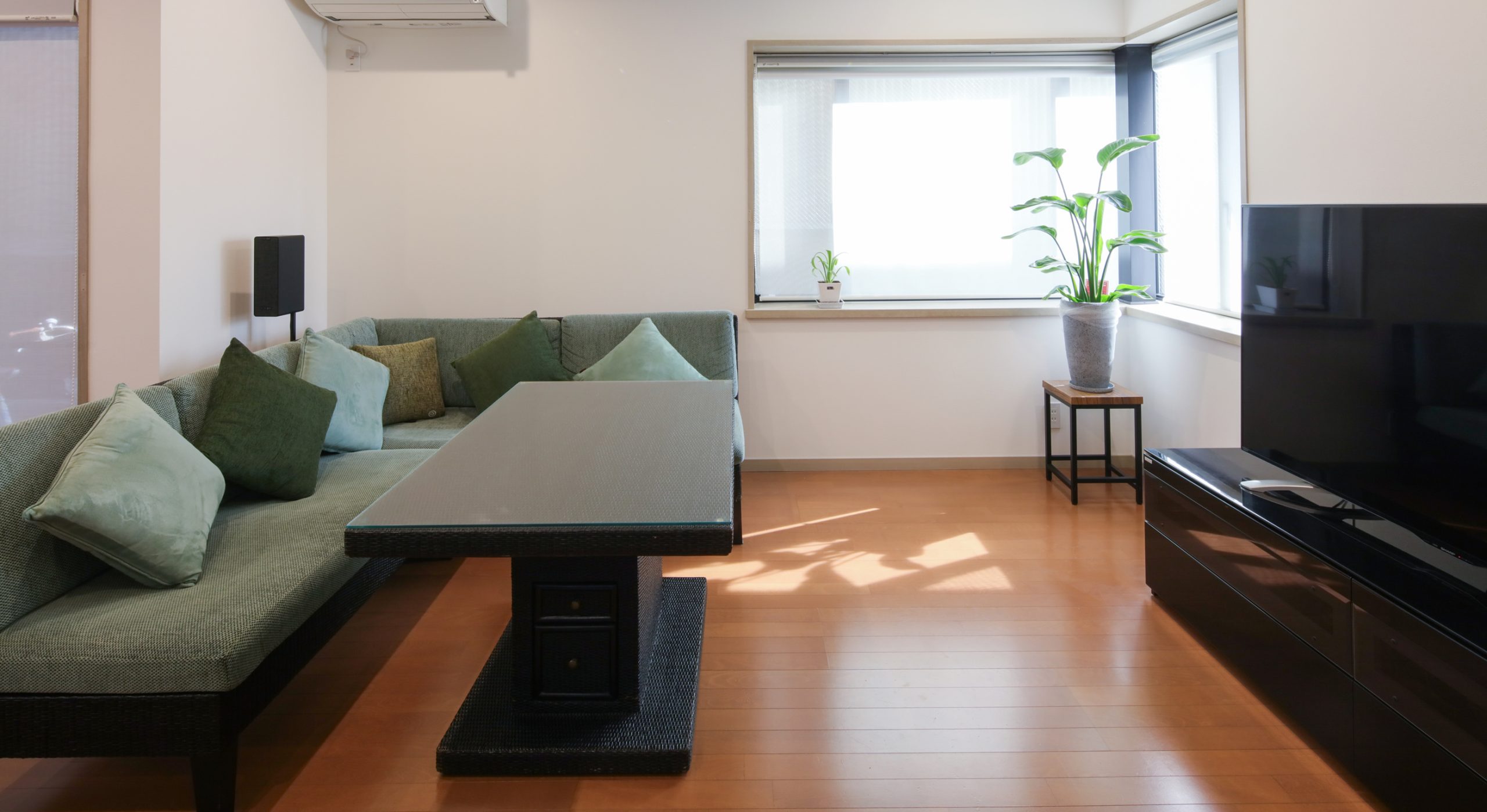 内装は、新調したリビングの家具の色味に合わせたグリーン系のアクセントカラーを採用。