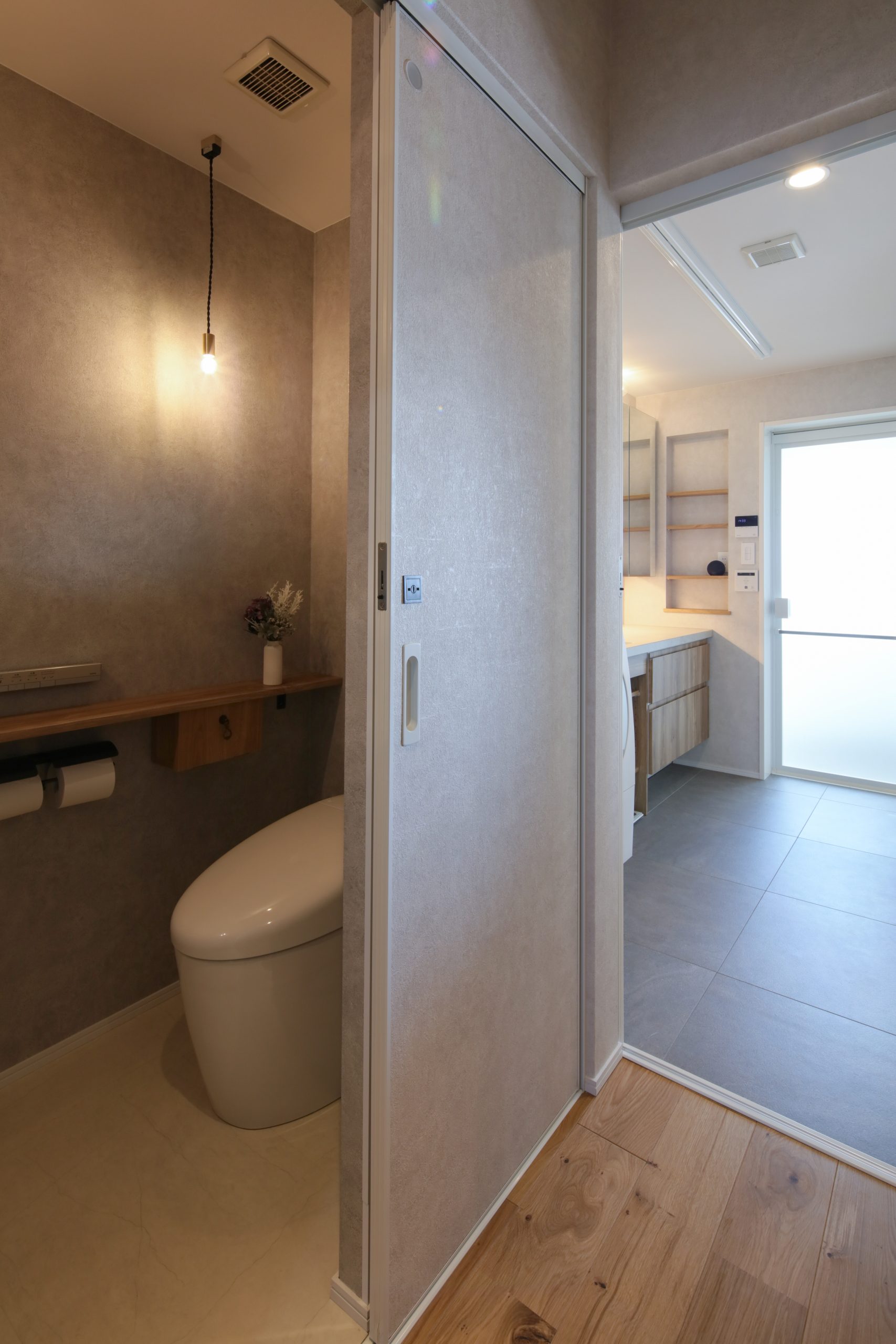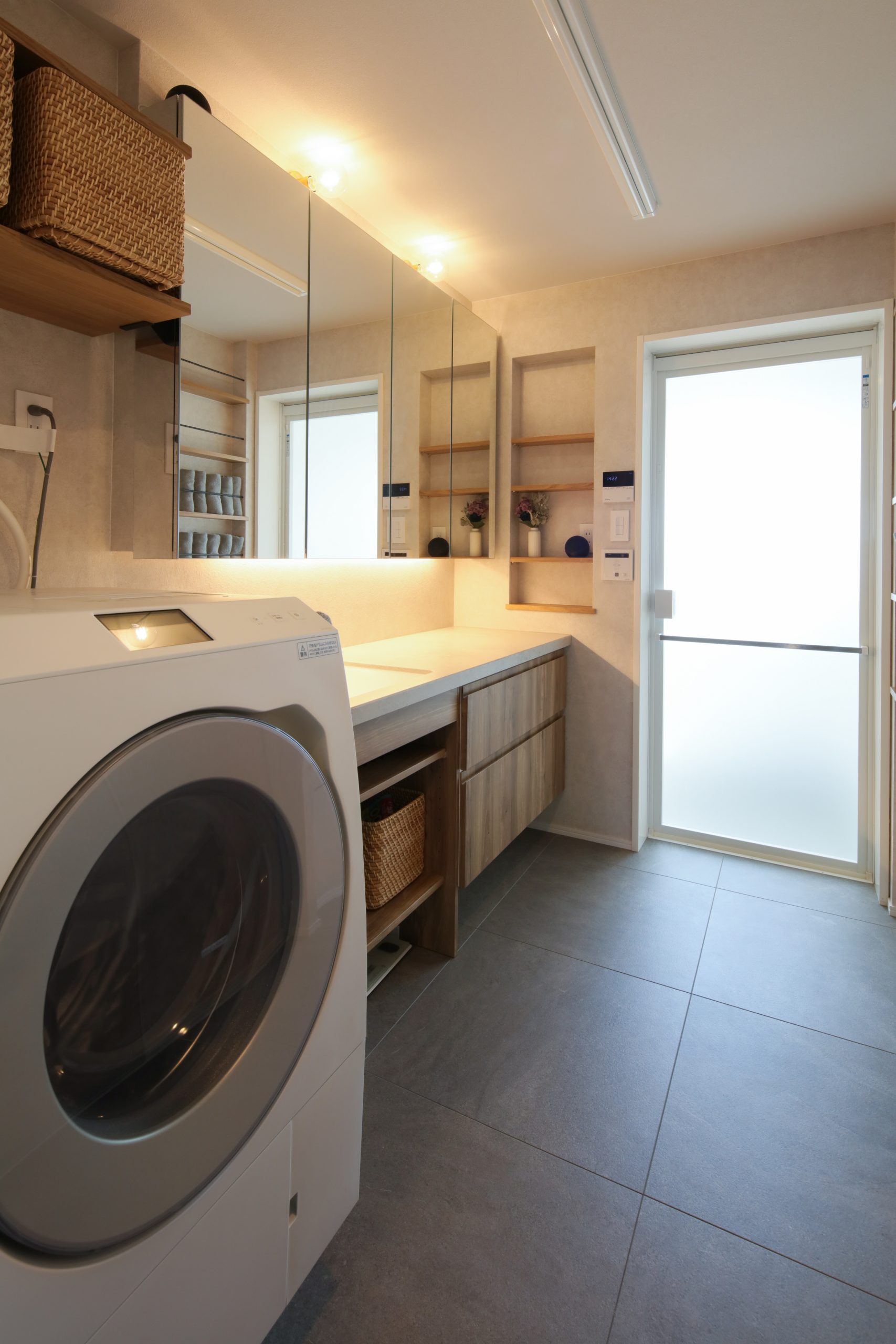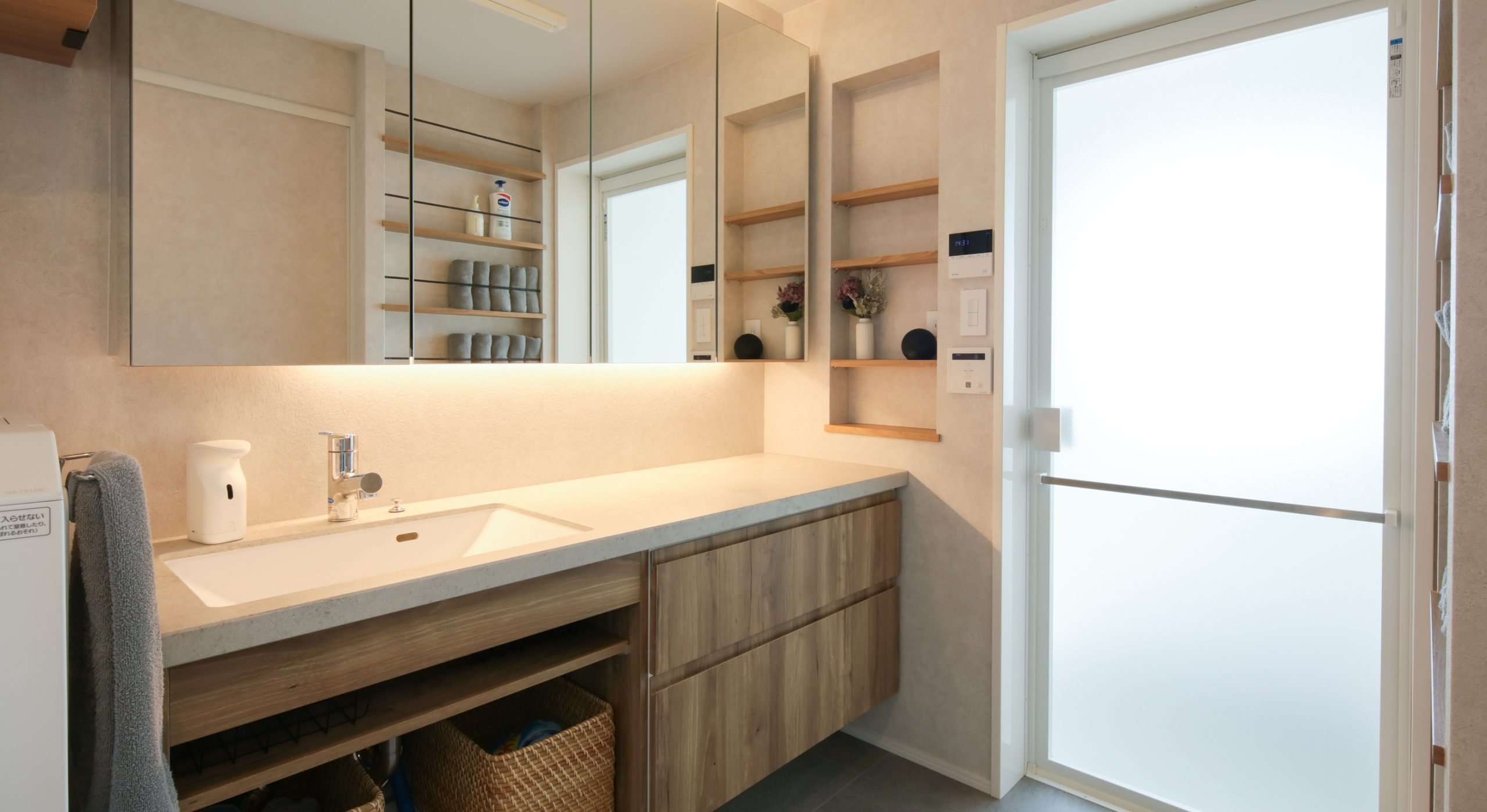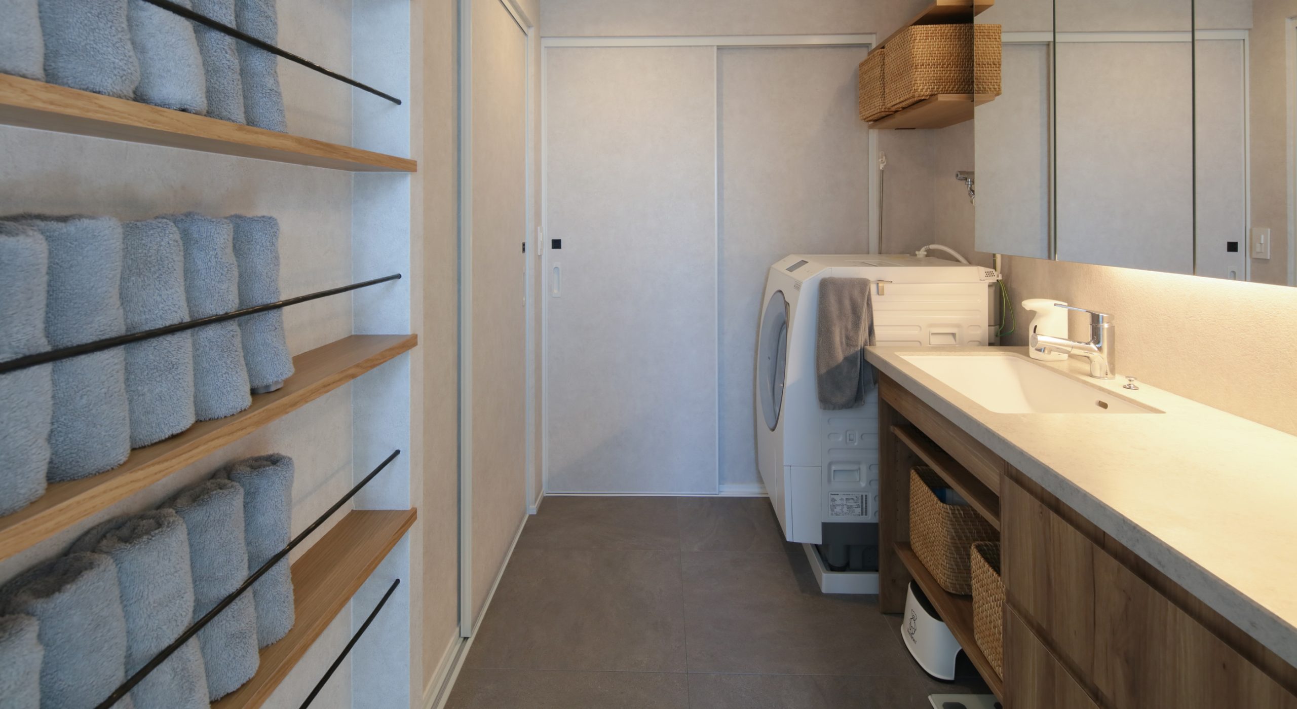 洗面脱衣室は、娘さまお二人の使いやすさを考慮した実用性と、造作洗面台×間接照明のデザイン性を兼ね備えた空間に生まれ変わりました。