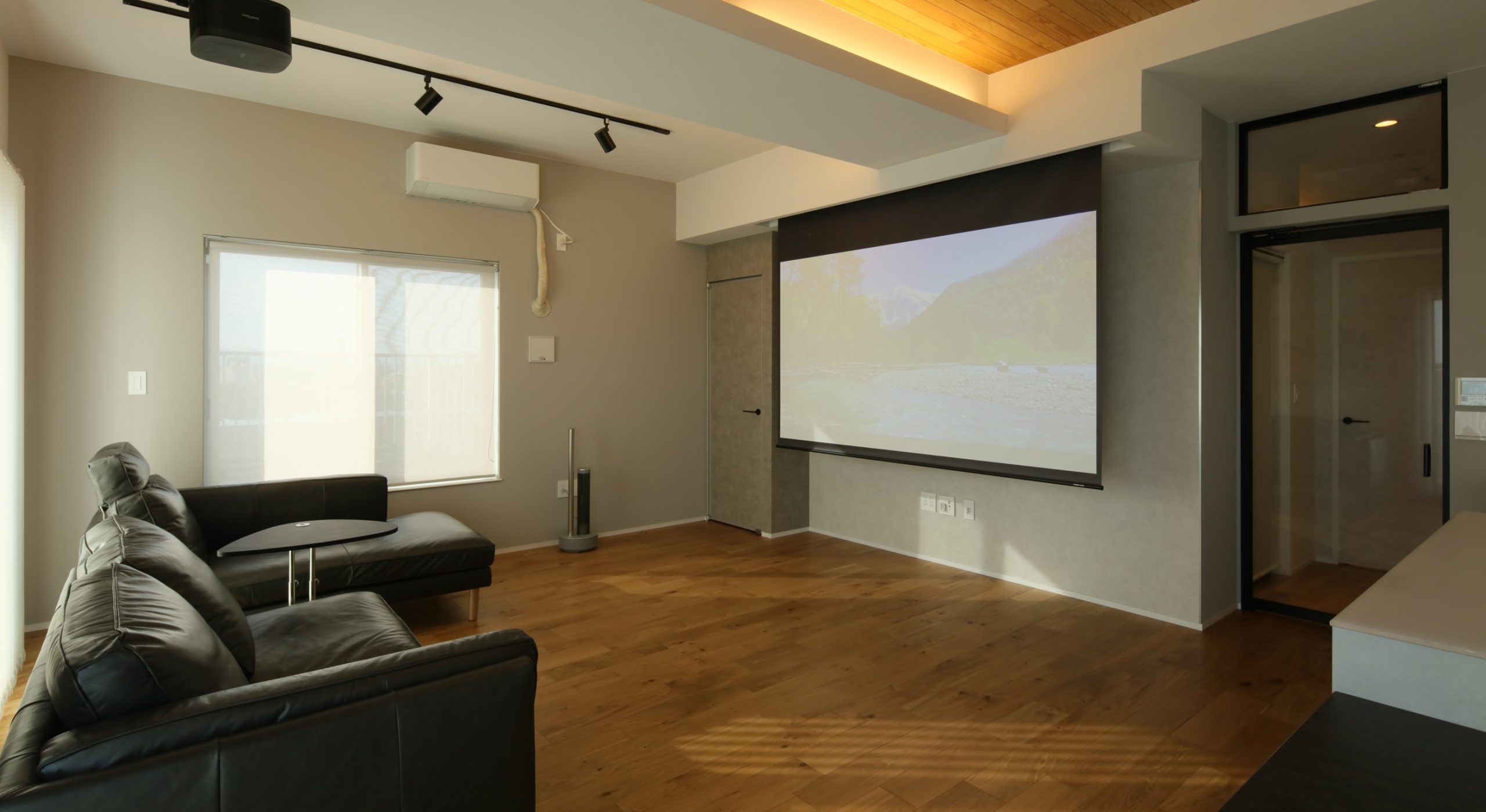クロス貼替え、フロア張替え、プロジェクター設置、スクリーン設置、ダウンライトをスポットライトに変更、間接照明設置