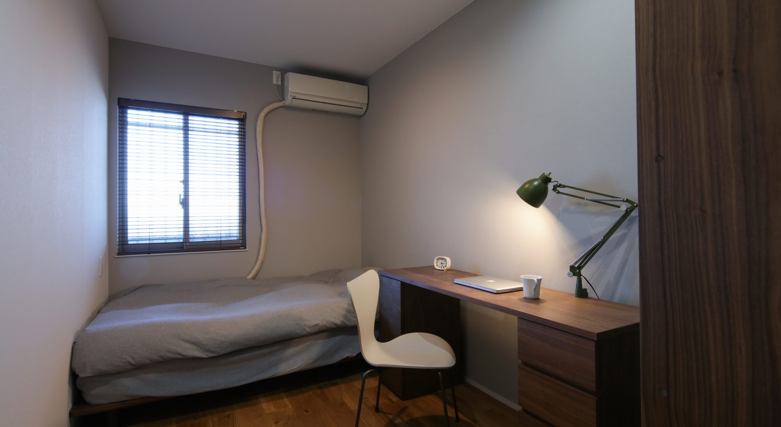 旦那さまのリモートワーク部屋も兼ねた寝室は、書籍をたっぷり収納できるスペースを確保しながら、パソコン作業しやすい広めのデスクが収まるように仕上げました。
