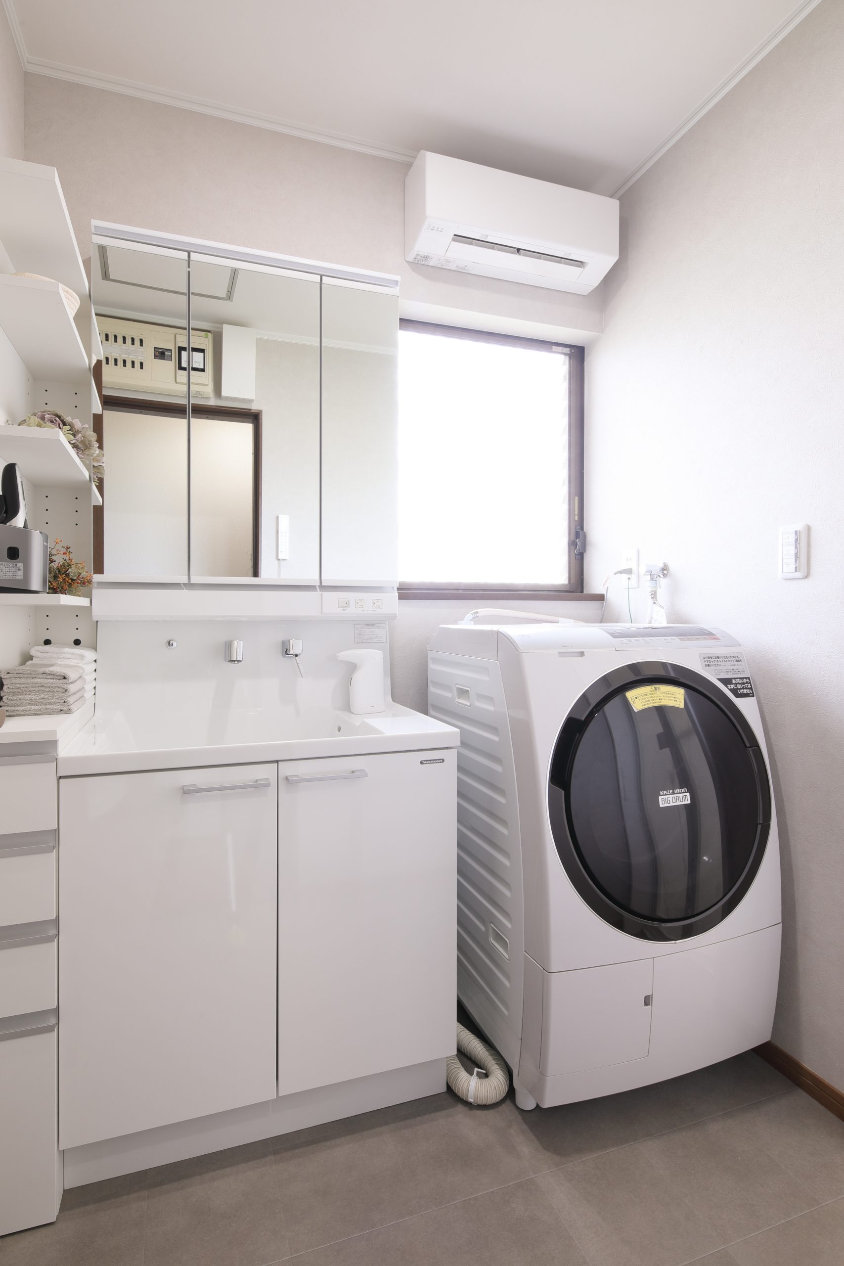 洗面化粧台取替え、脱衣室エアコン取付け、収納棚取付け、クロス貼替え、フロア張替え