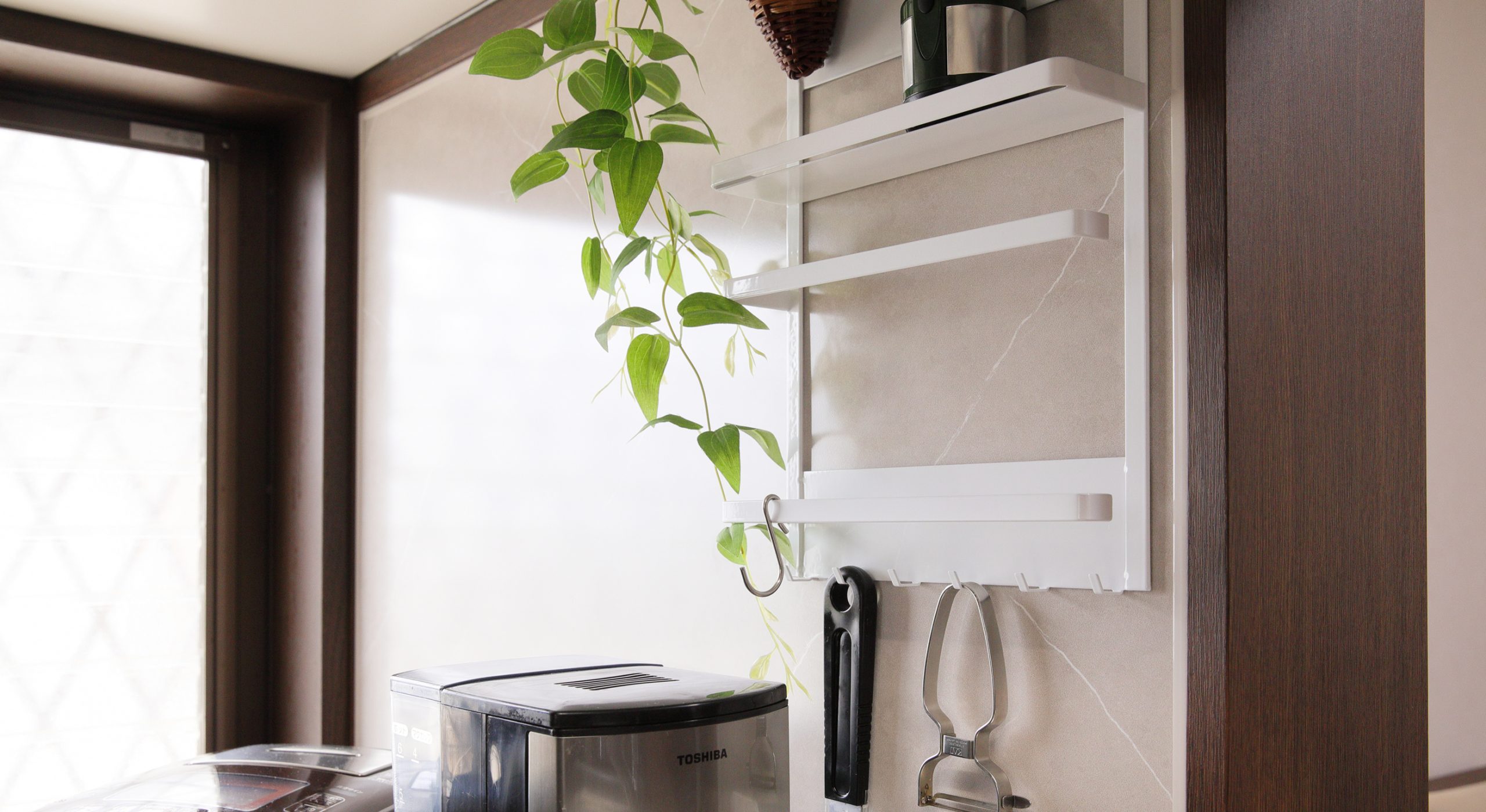 収納ラックもマグネットでお好みの位置に移動できるので使い勝手がアップ!カウンターや鏡をなくしたことでお掃除もラクラク。
