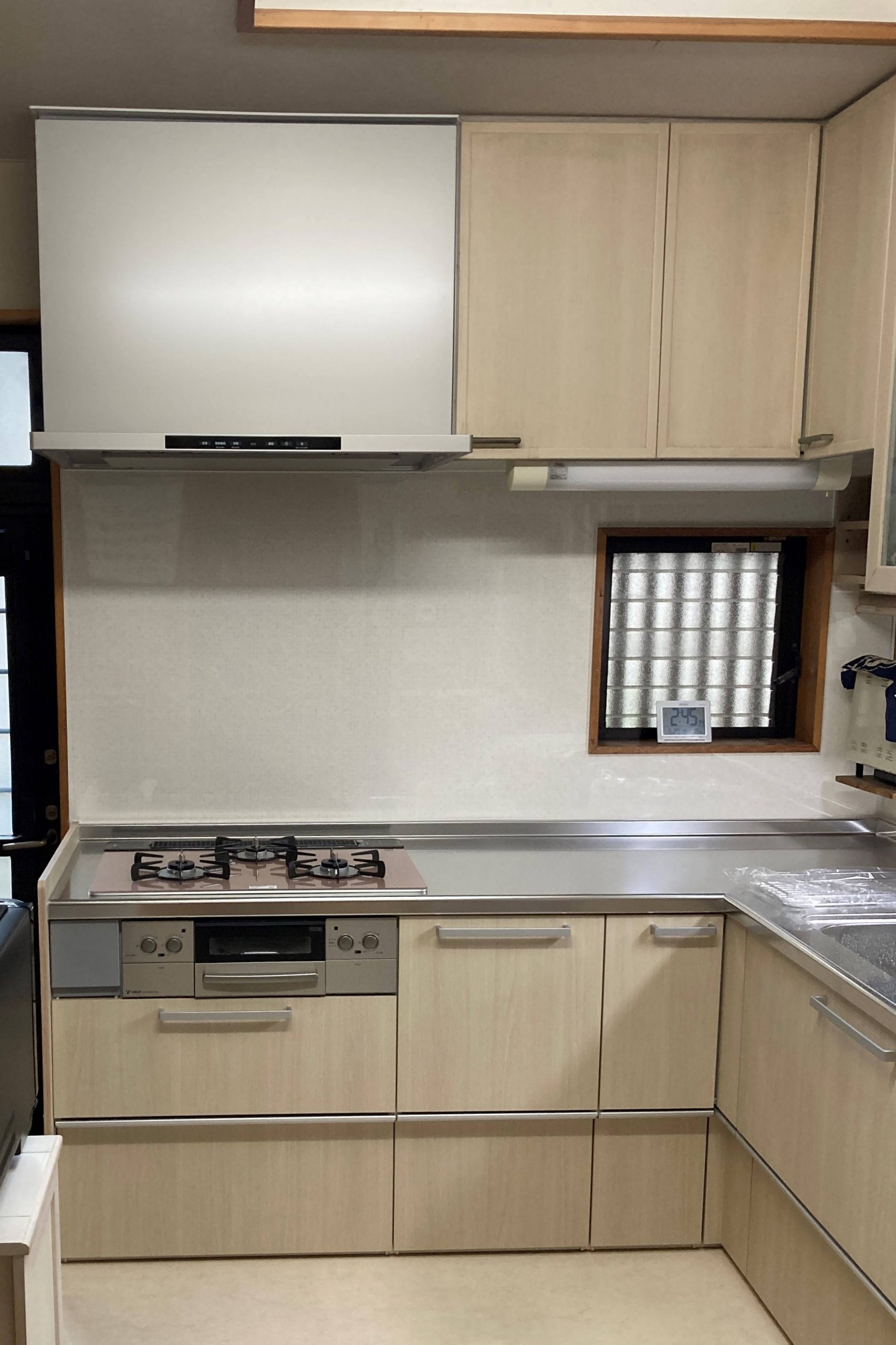 L型キッチンとコンロとの開口部が広く無駄なスペースになっていた。またレンジフードも圧迫感があり、お掃除も大変で困っていたそうです。
