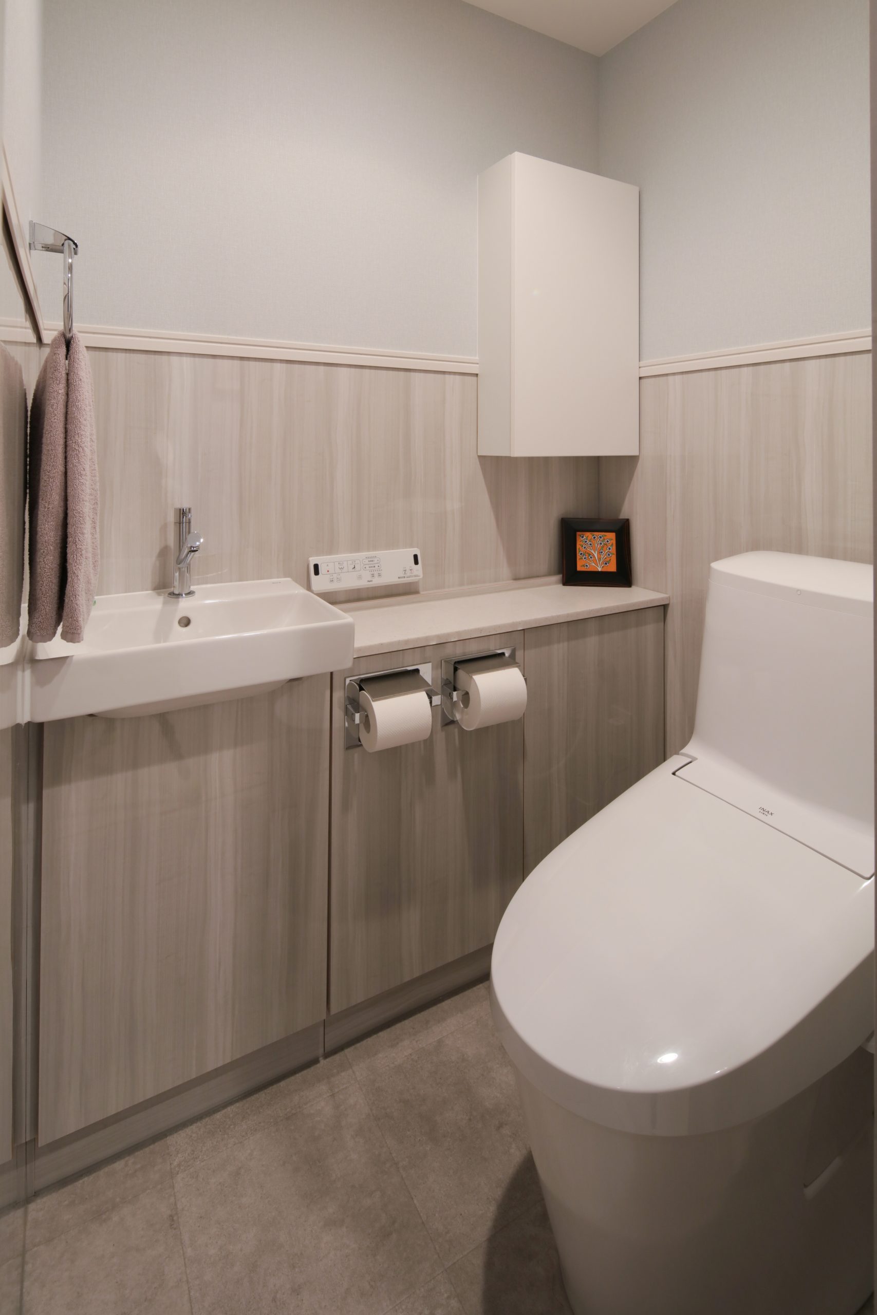 トイレ取替え、クロス貼替え、フロア張替え、手洗い器取替え、キャビネット収納取替え、収納BOX新設