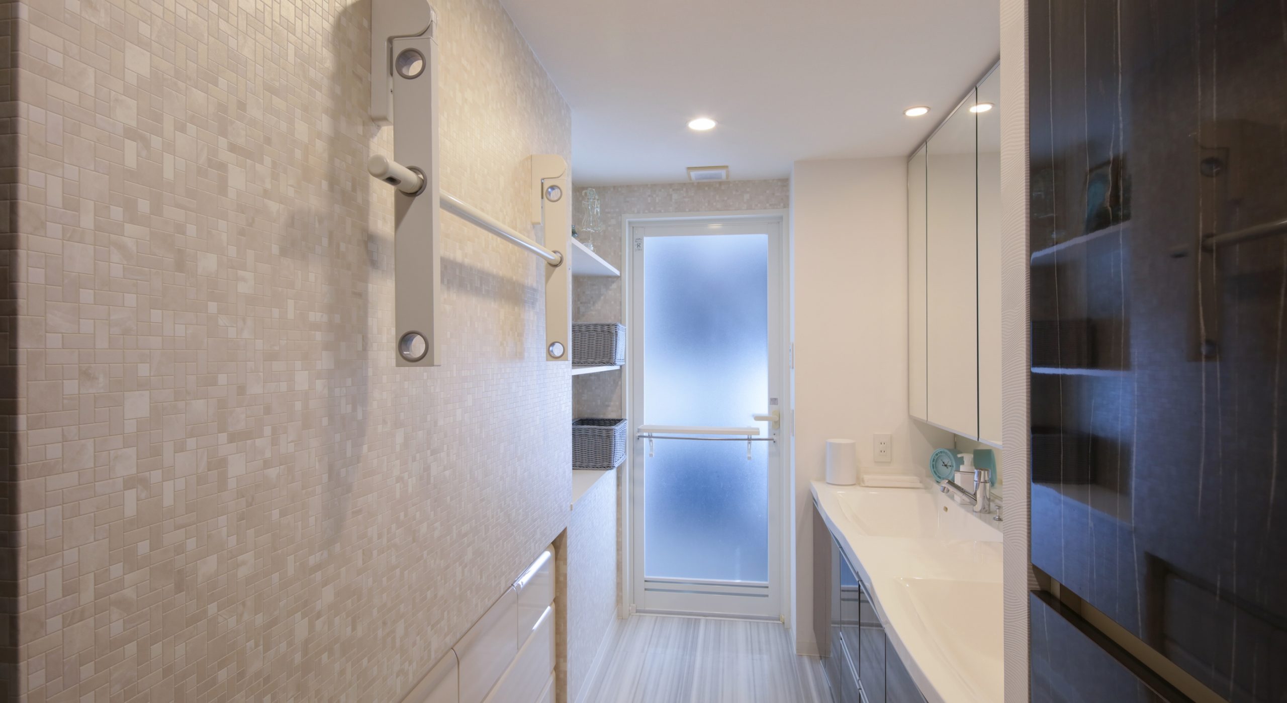 洗面脱衣室には壁付けのランドリーパイプを設置。
