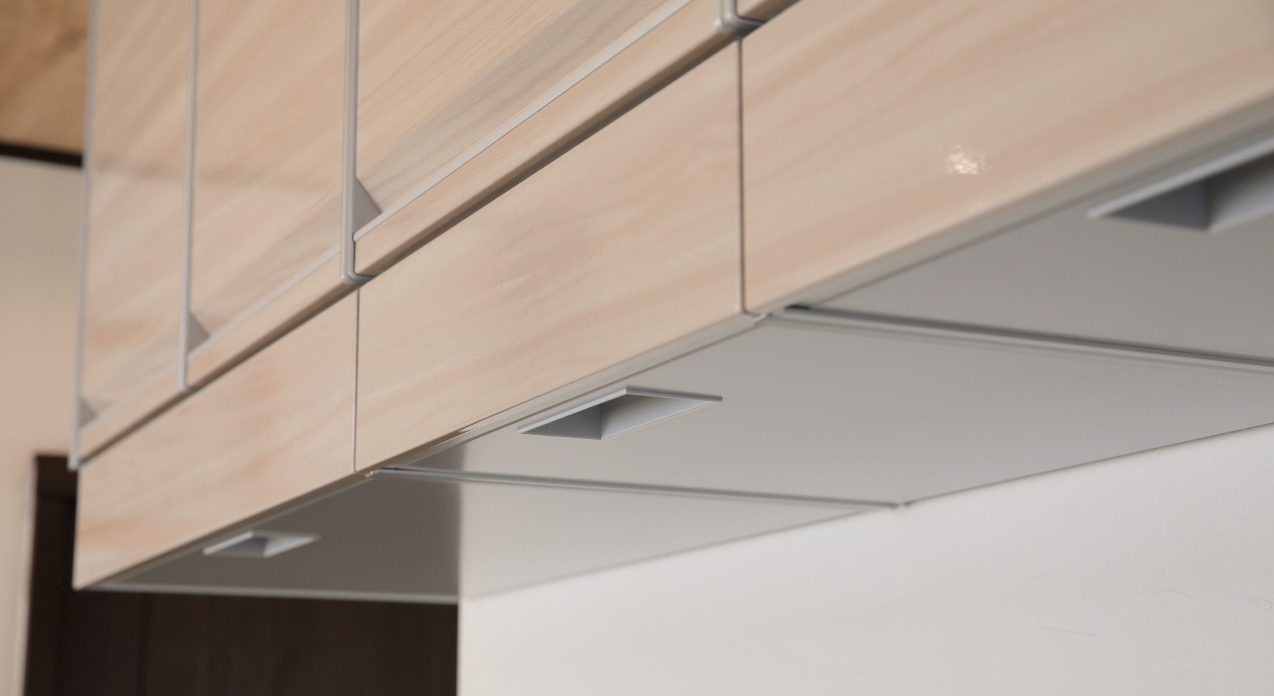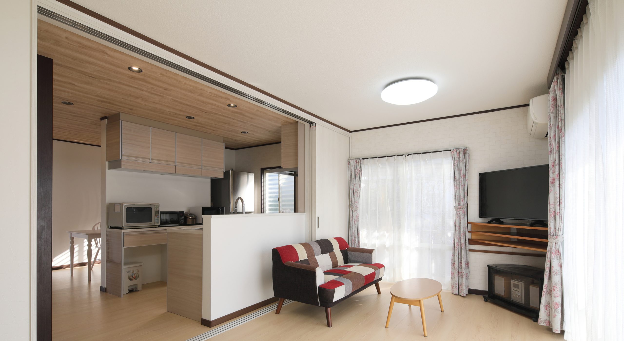 キッチンとメインリビングとの間仕切り位置を変えて、可動間仕切り戸を新設することで自由にレイアウトできるように仕上げました。