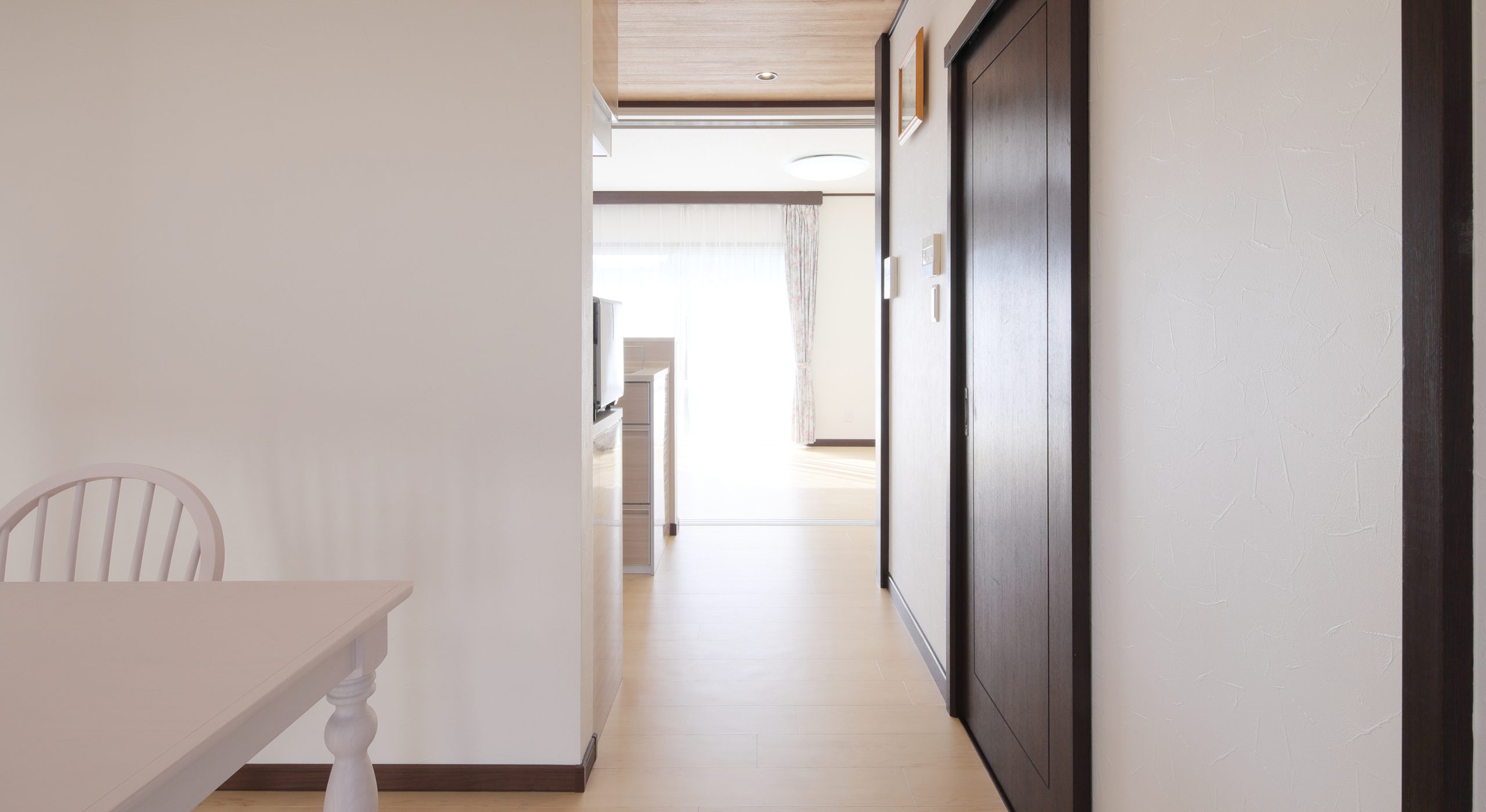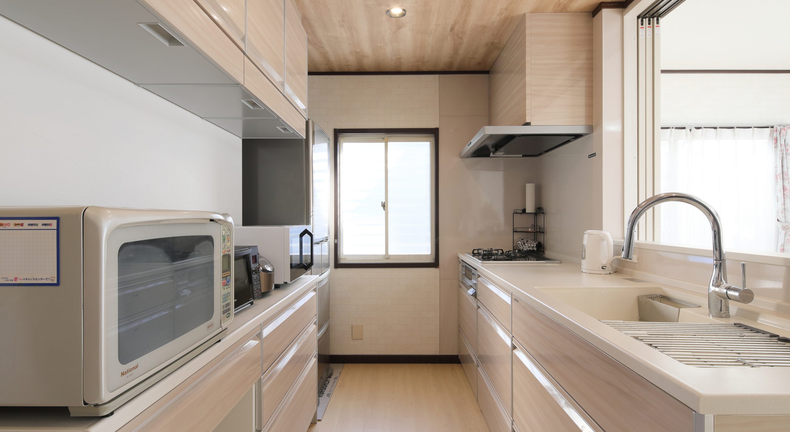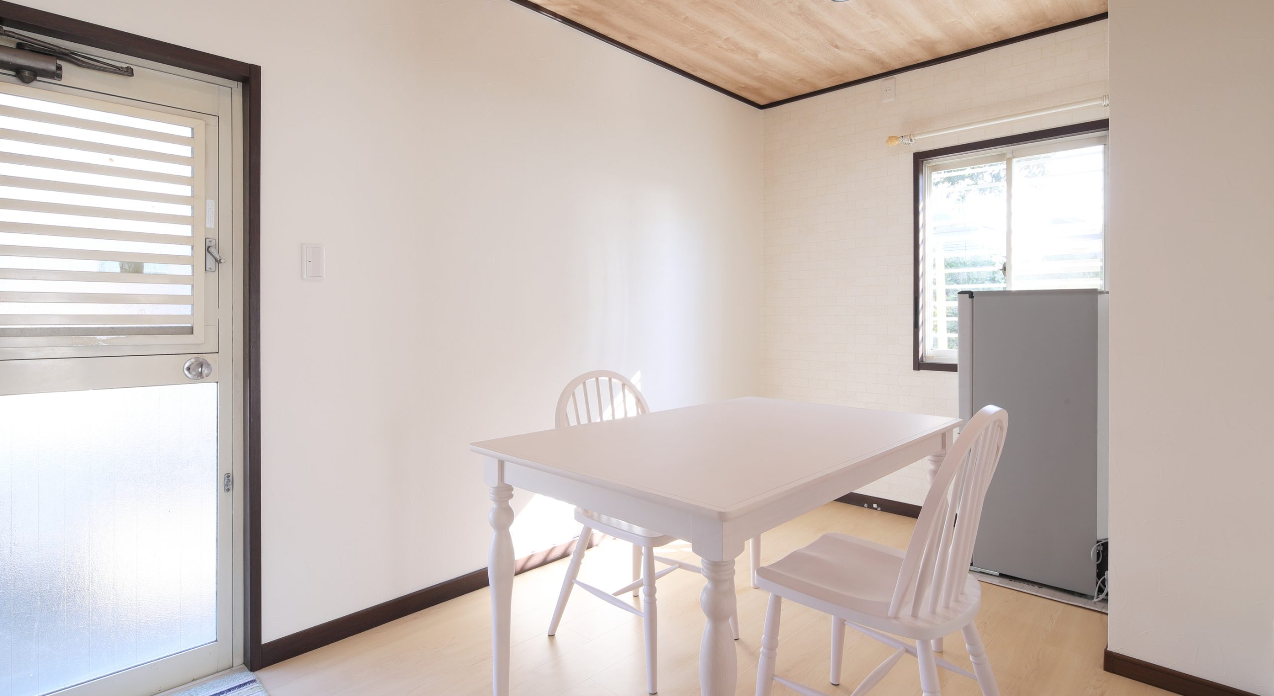 やさしい色味のフロアに、木目調の天井クロスを合わせることで、ナチュラルテイストの明るいLDKに生まれ変わりました。
