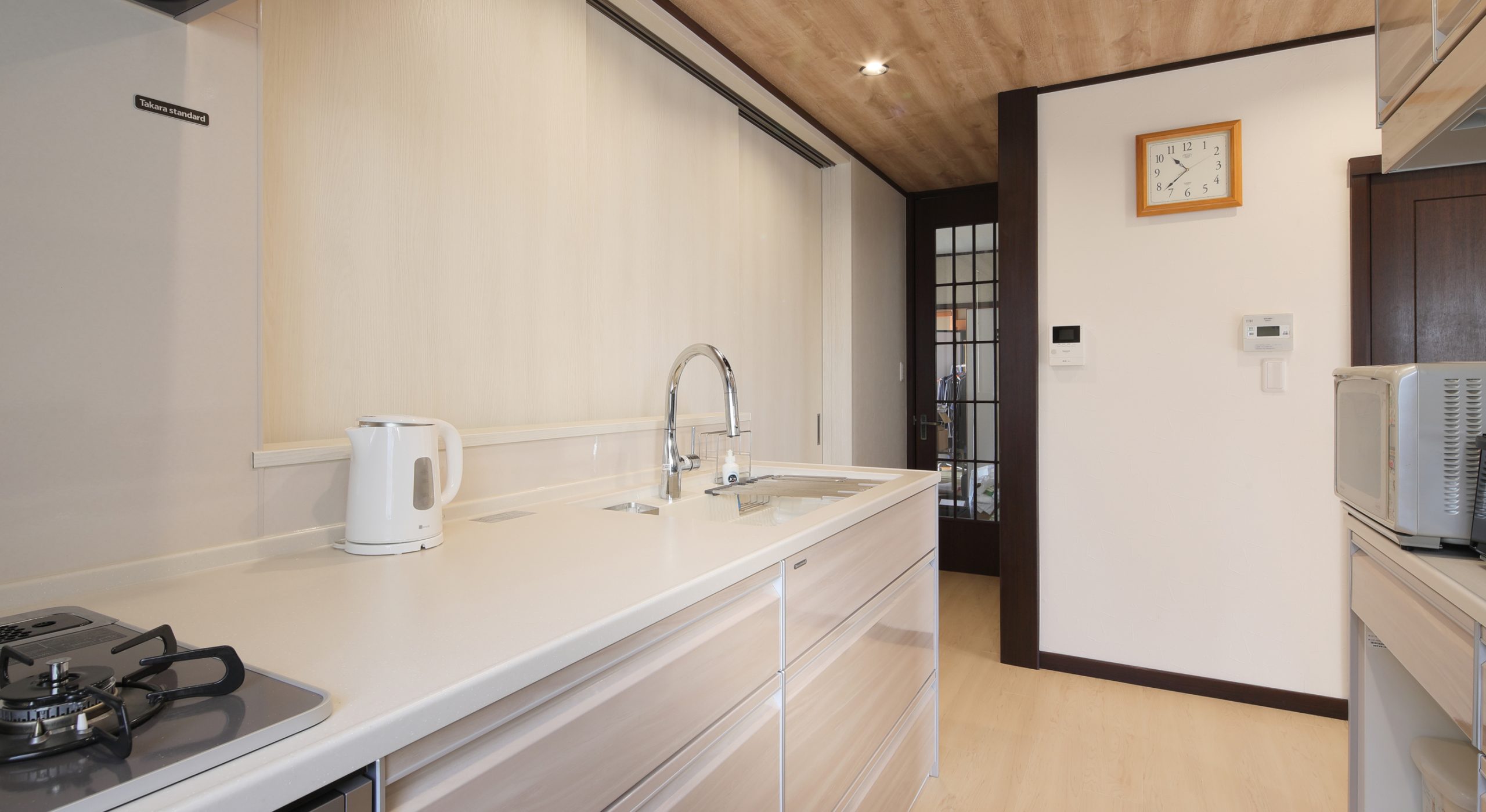 | 施工内容 | 間取り変更、システムキッチン取替え、カップボード設置、レンジフード取替え、吊り戸棚撤去、クロス貼替え、フロア張替え、可動間仕切り戸設置、照明取替え |