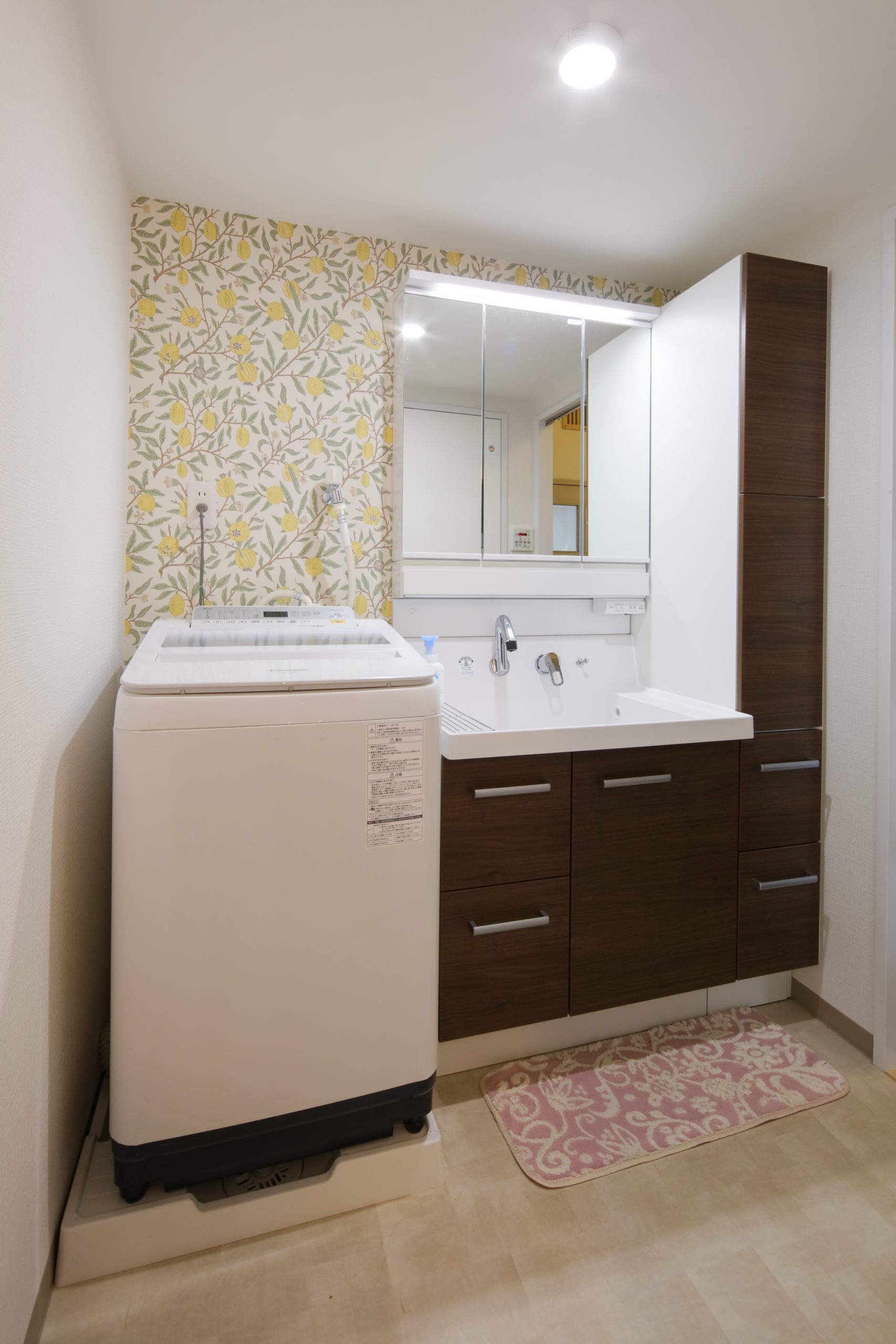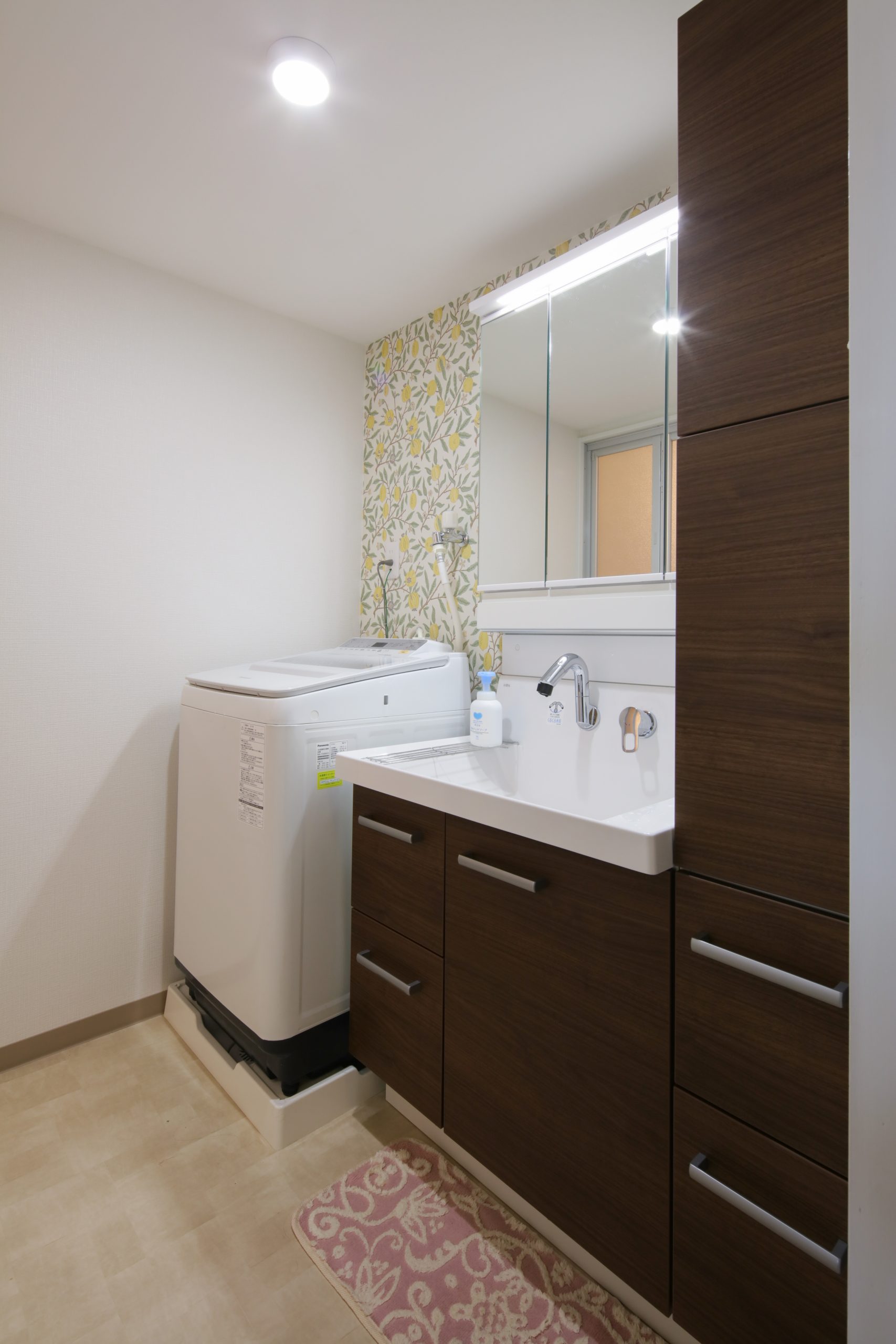 明るくかわいらしい印象の洗面空間に シンプルなデザインのトールキャビネットでたっぷり収納