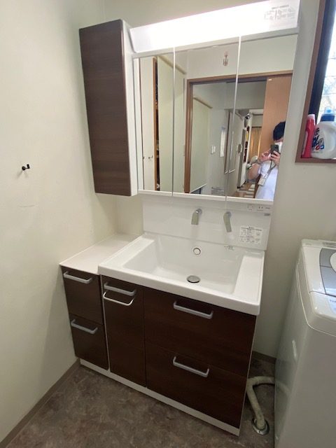 新しい洗面化粧台にあわせて おしゃれなクッションフロアに貼替え
