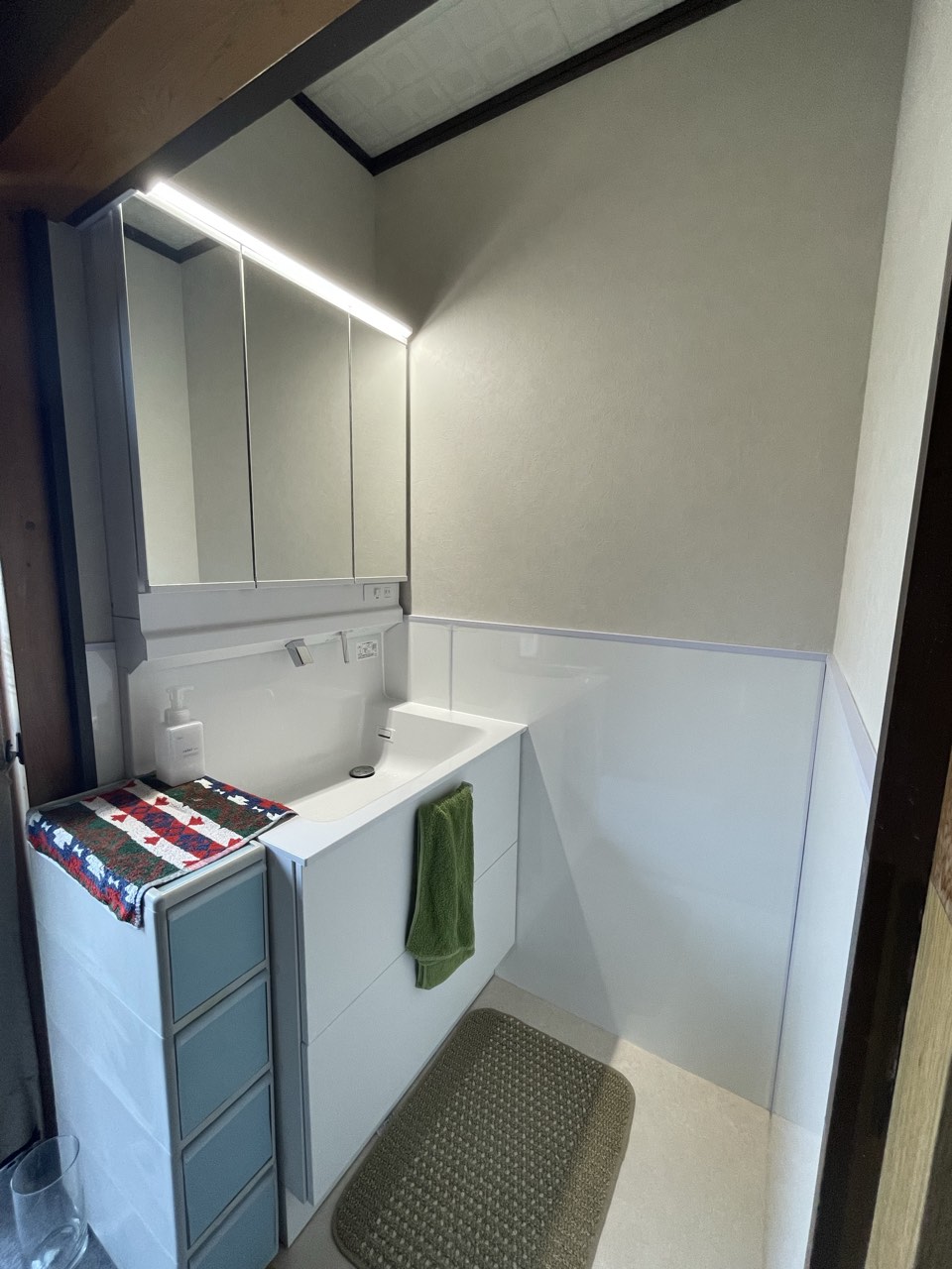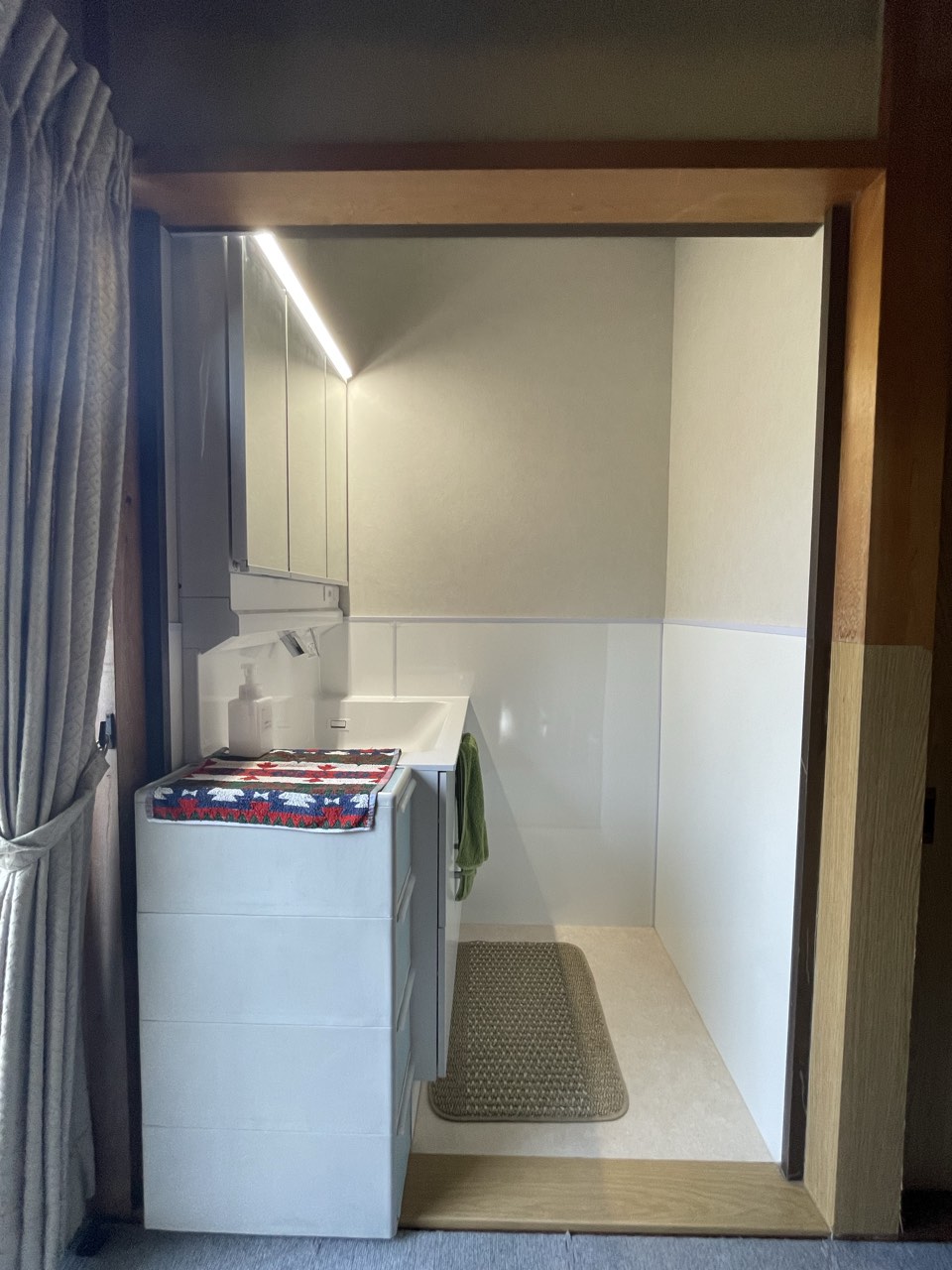洗面脱衣室の壁タイルはパネルに貼替えて、清掃性がアップして見た目もすっきりと生まれ変わりました。