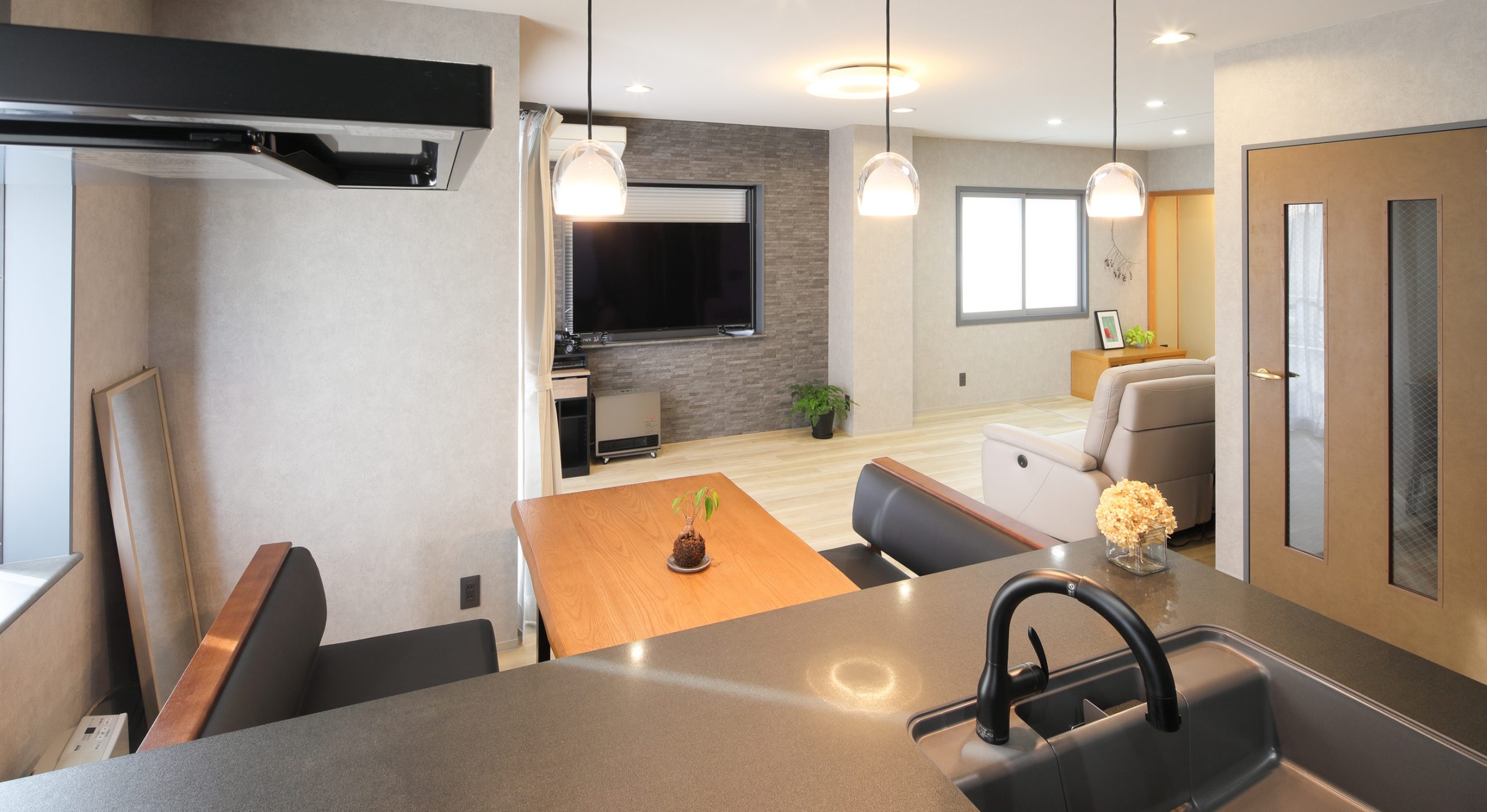 お客さまからは「キッチンの壁がなくなったので、ガスファンヒーター1台でLDK全体が温まるようになった」とお喜びの声をいただけました。