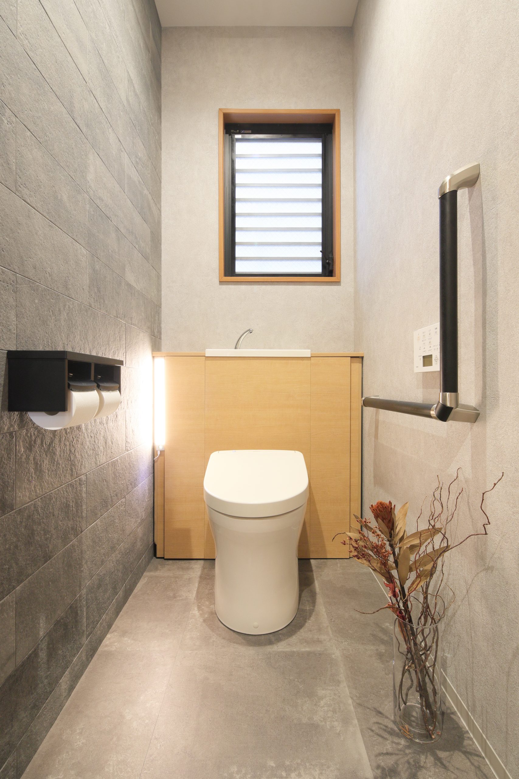 トイレは、既設の収納を使いづらくしていた手すり・コンセントの位置を調整することで、使いやすく見た目もすっきりした空間に仕上げました。