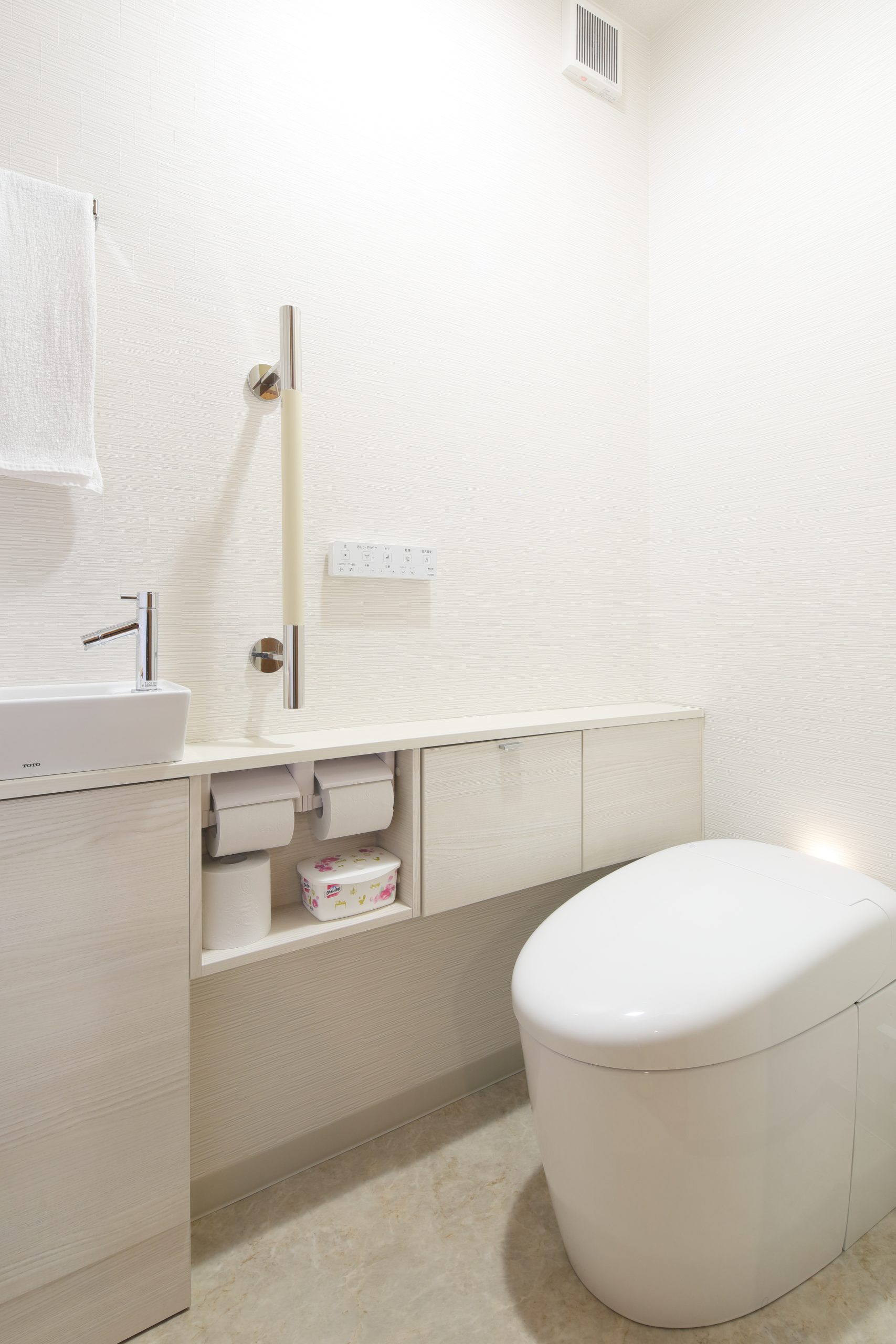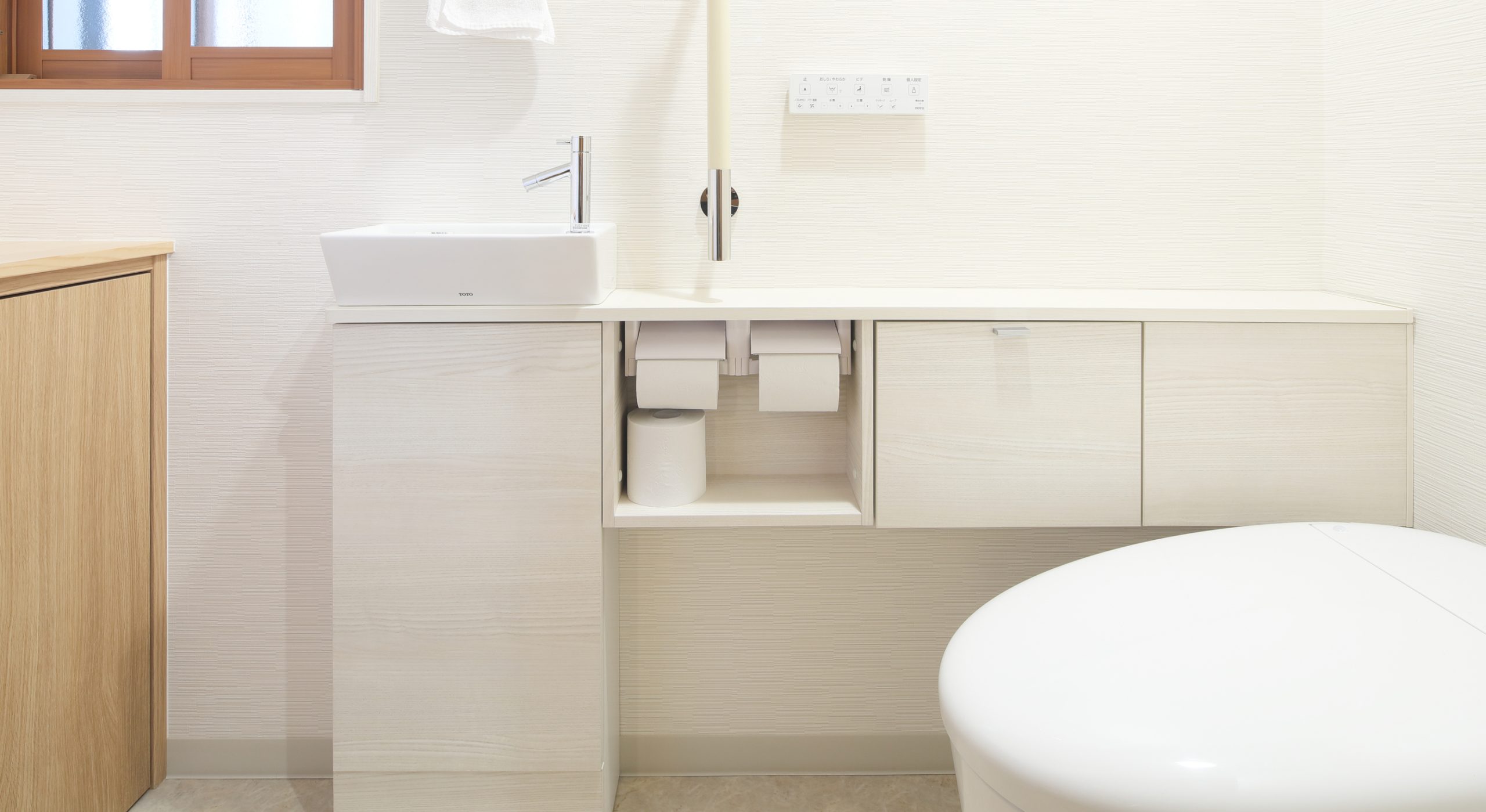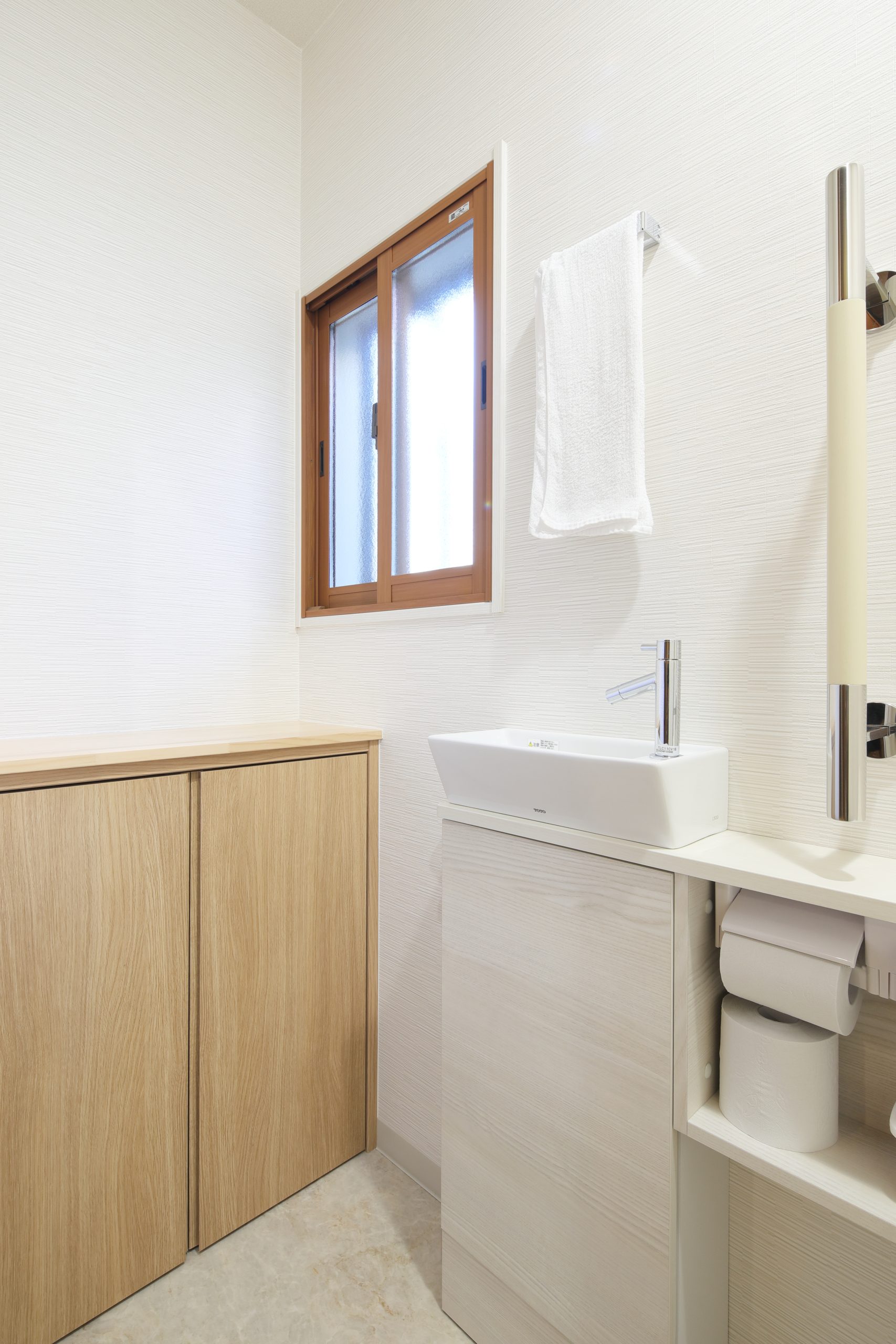トイレは、もともと収納室だったスペースに移動。タンクレストイレに変更することで、見た目がすっきりし、空間も広がりました。トイレと収納の位置を入れ替える際には、図面だけでなく現場で何度も動線や広さを確認し、ご納得いただけるレイアウトに仕上げました。