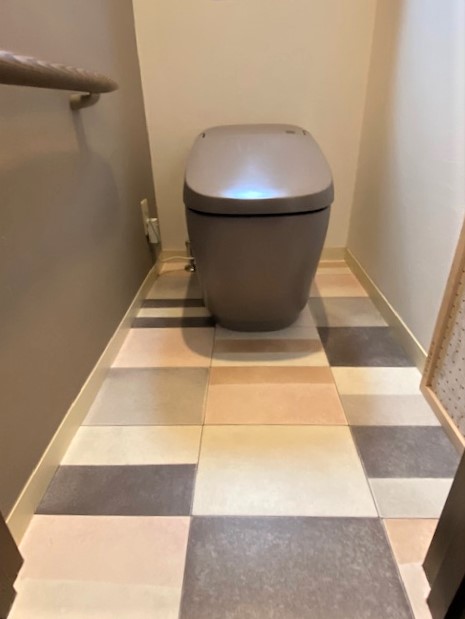 オシャレな色のタンクレストイレに取替えさせていただきました。また、床はタイル柄、側壁にはアクセントカラーの壁紙をお選びいただき、モダンで落ち着きのある空間に仕上げました。