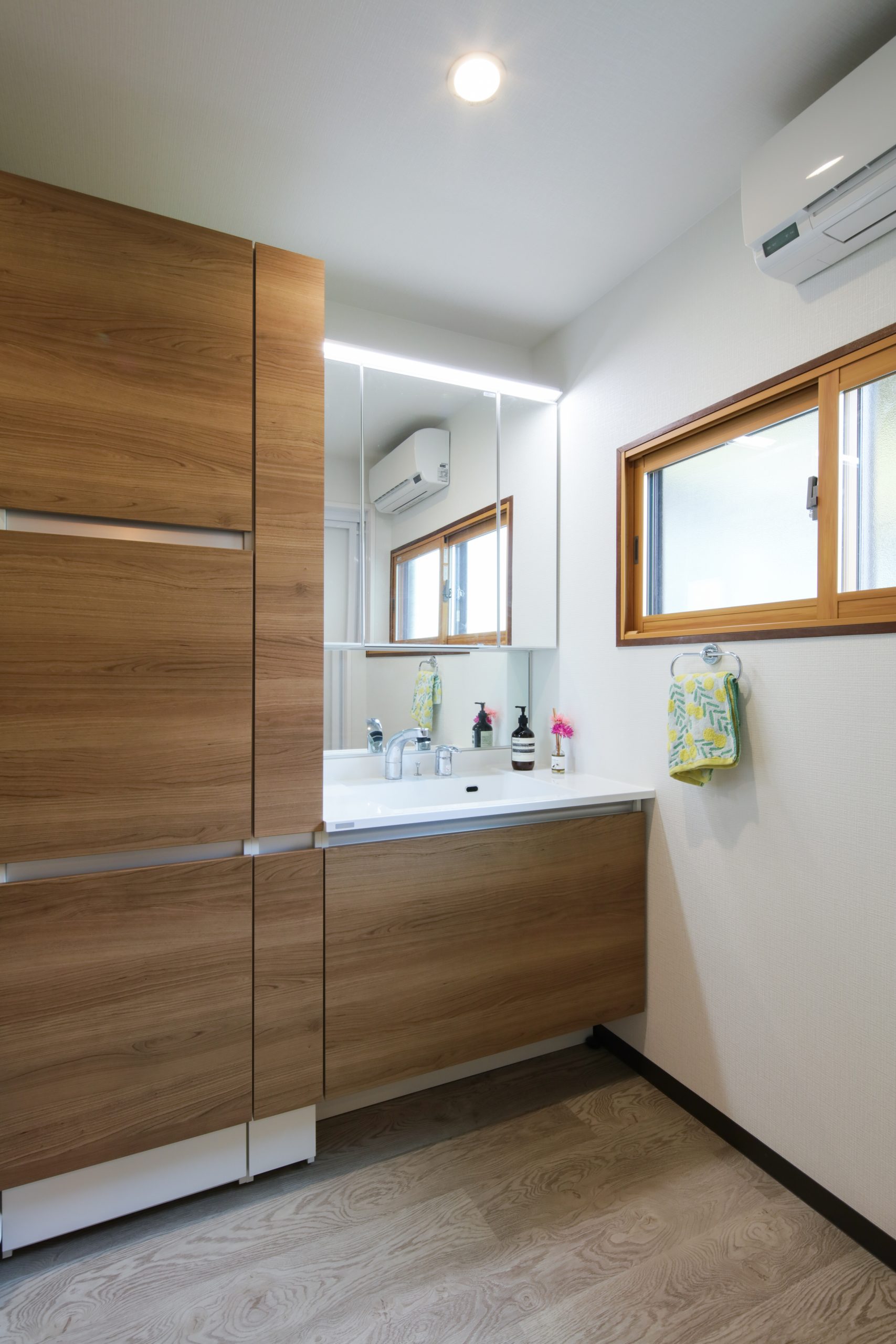 洗面化粧台取替え、収納棚からトールキャビネットに取替え、内窓設置、クロス貼替え、フロア張替え、エアコン設置、照明取替え