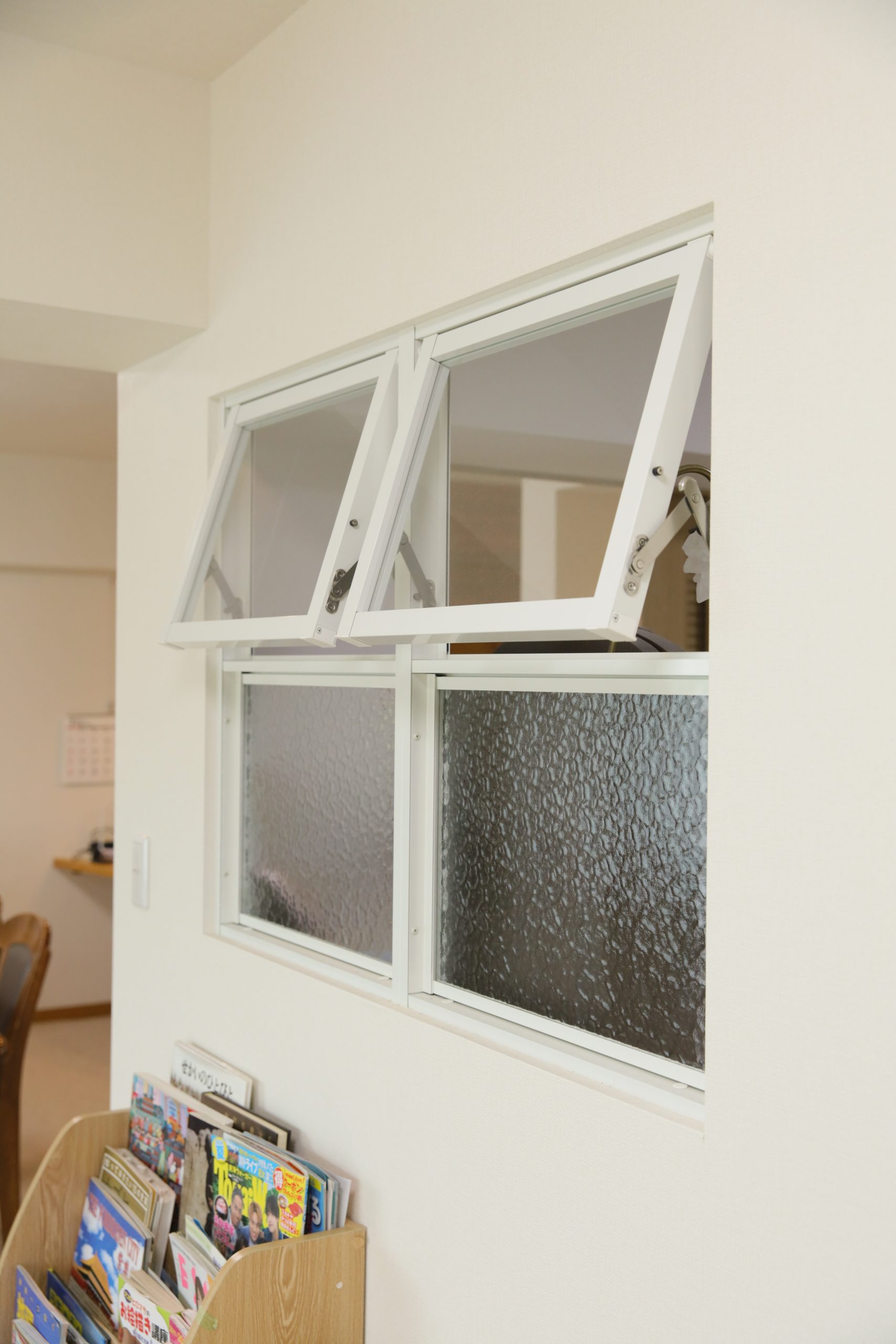 また、南側からの自然光を取り入れたいとのご希望に沿い、LIXILのデコ窓を採用。下部はすりガラス、上部は透明ガラスにすることで、プライバシーと開放感を両立させています。ドアには採風タイプを選び、空気がこもらない工夫もしています。