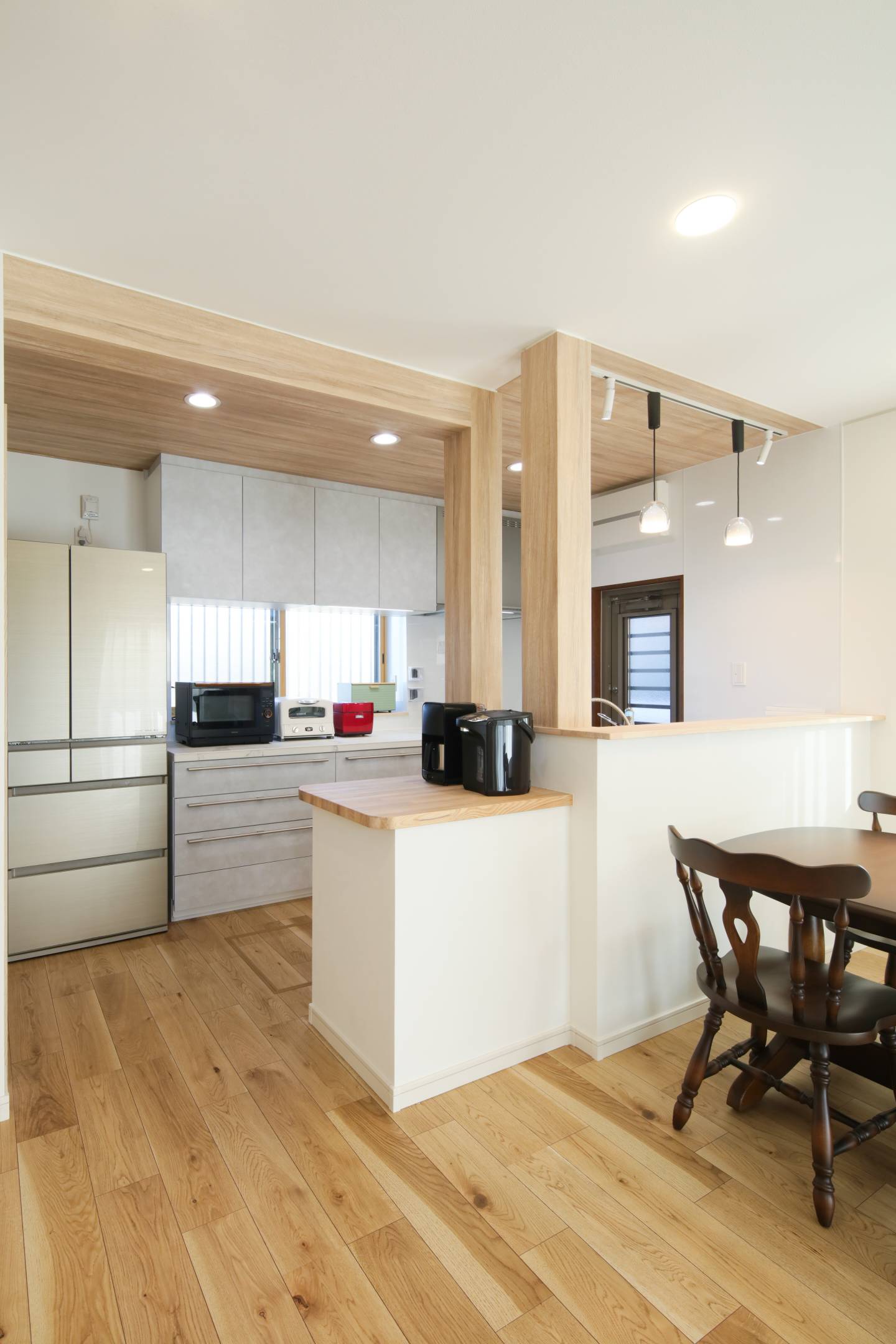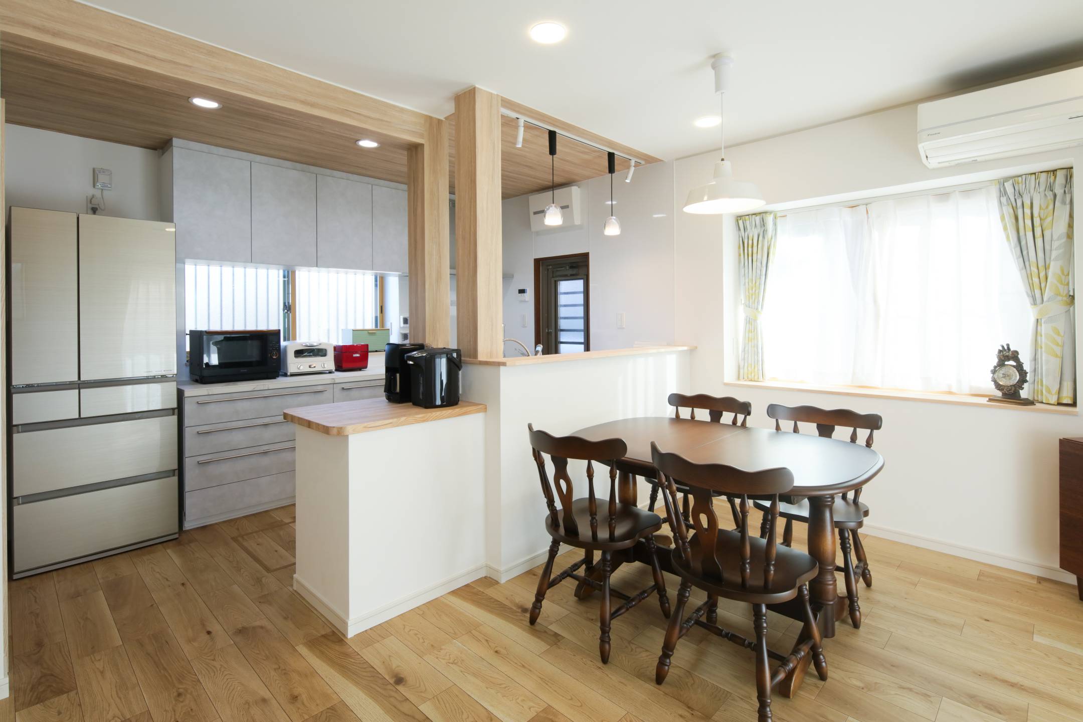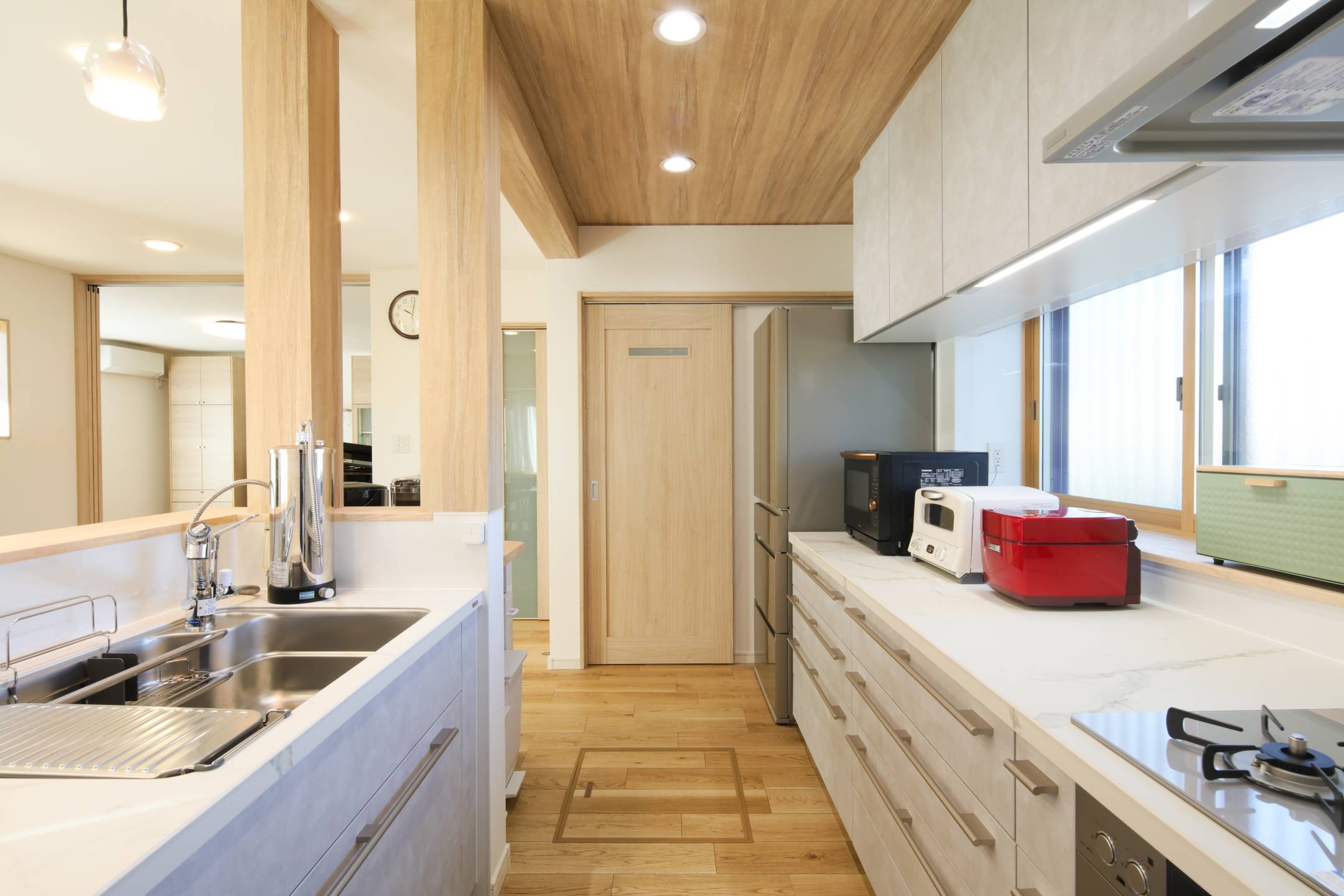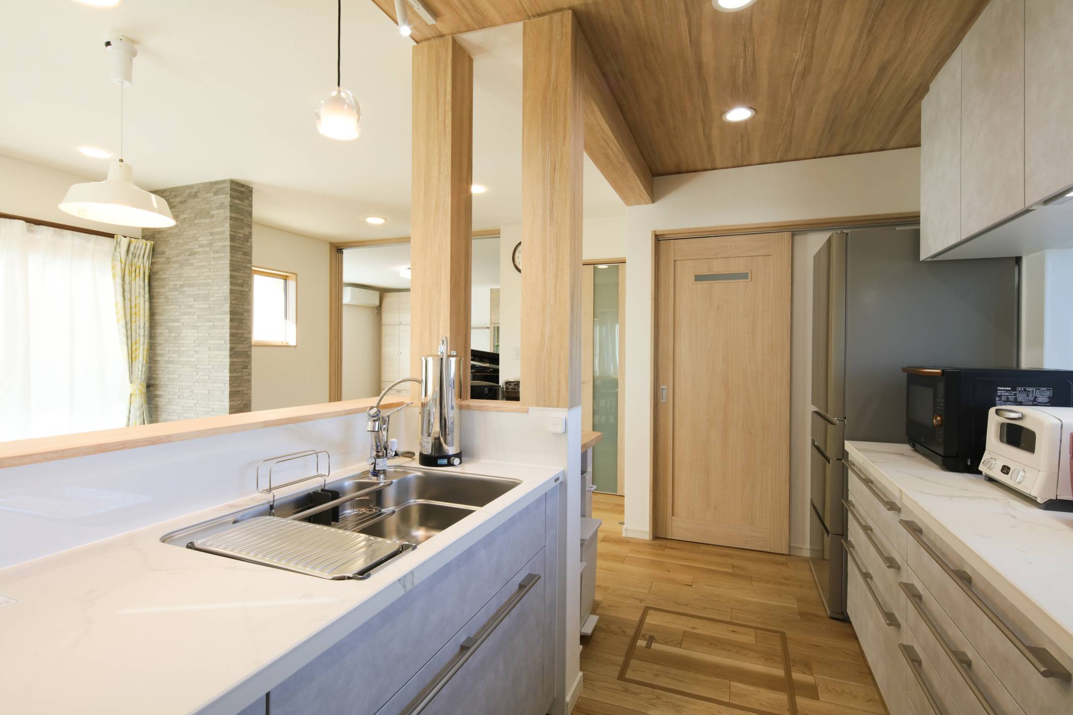 キッチンは壁付けから対面式の二列型に変更し、ご夫婦で作業しやすいよう寸法や動線を細かく調整。3Dパースを活用しながら、空間全体の色味バランスにも配慮しました。