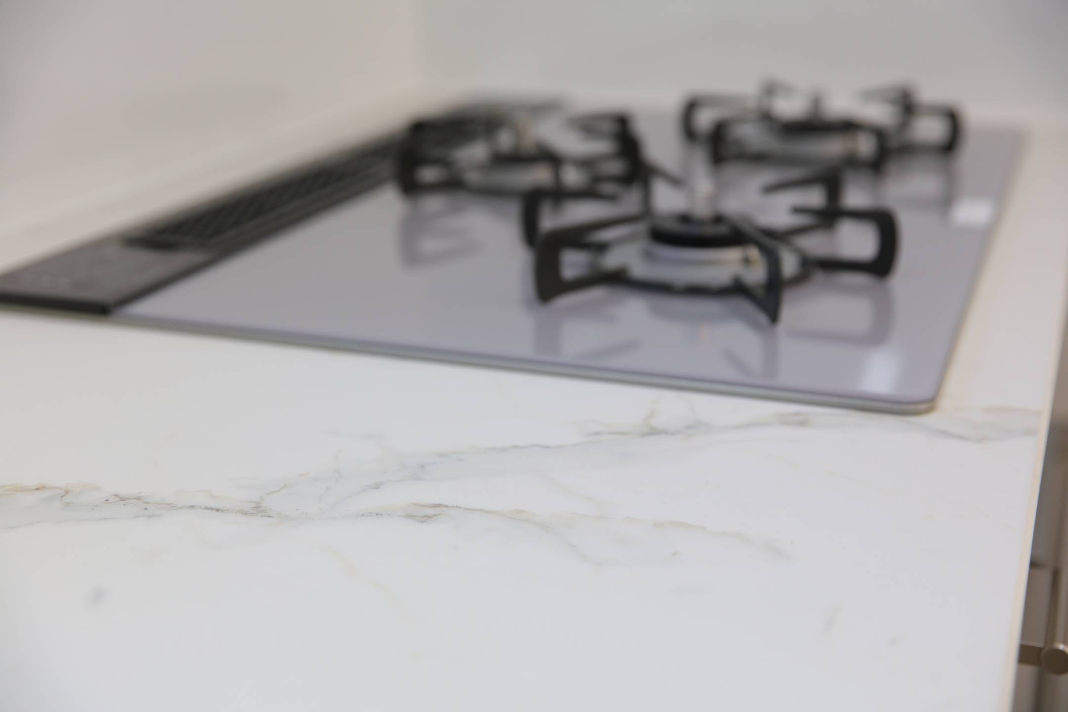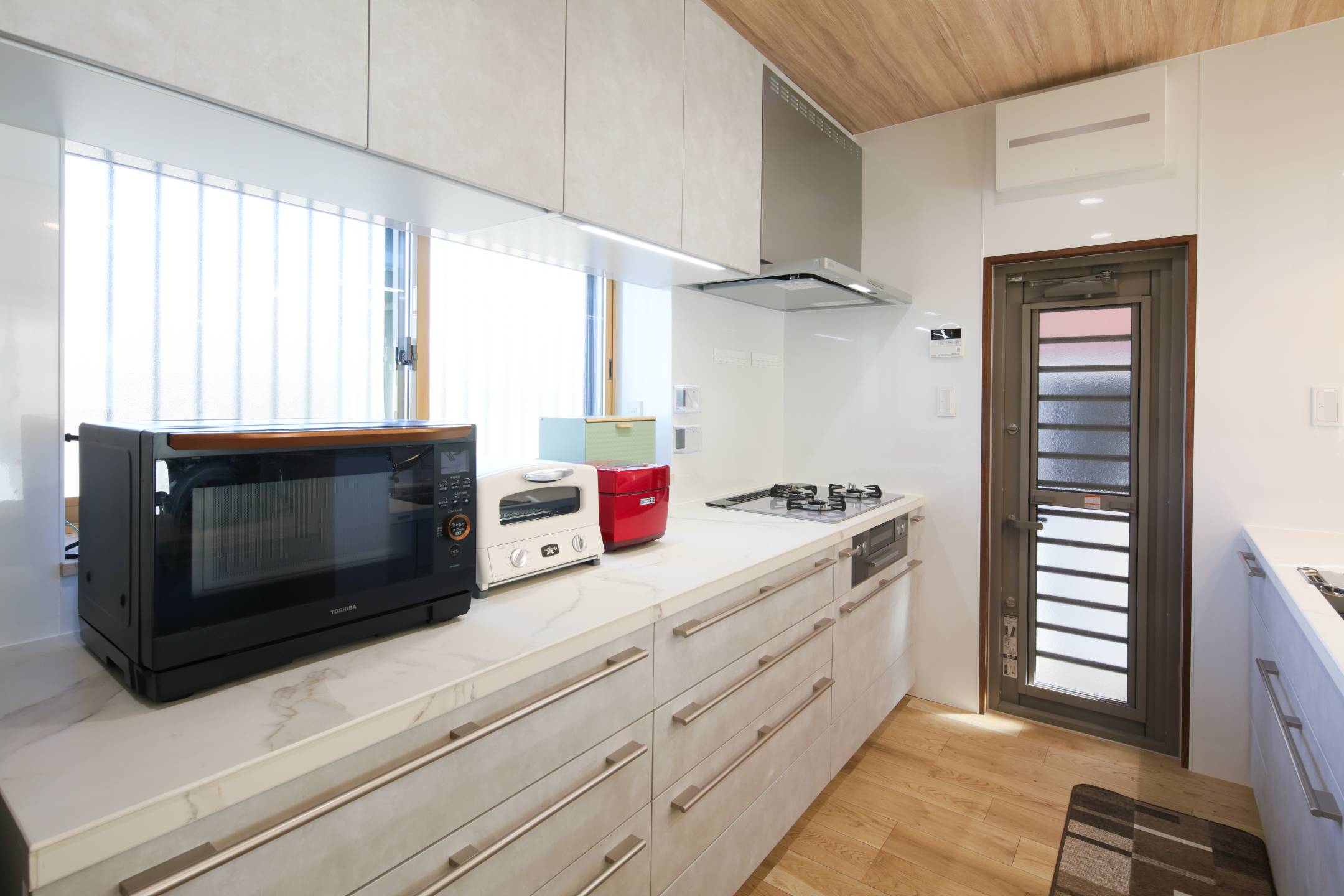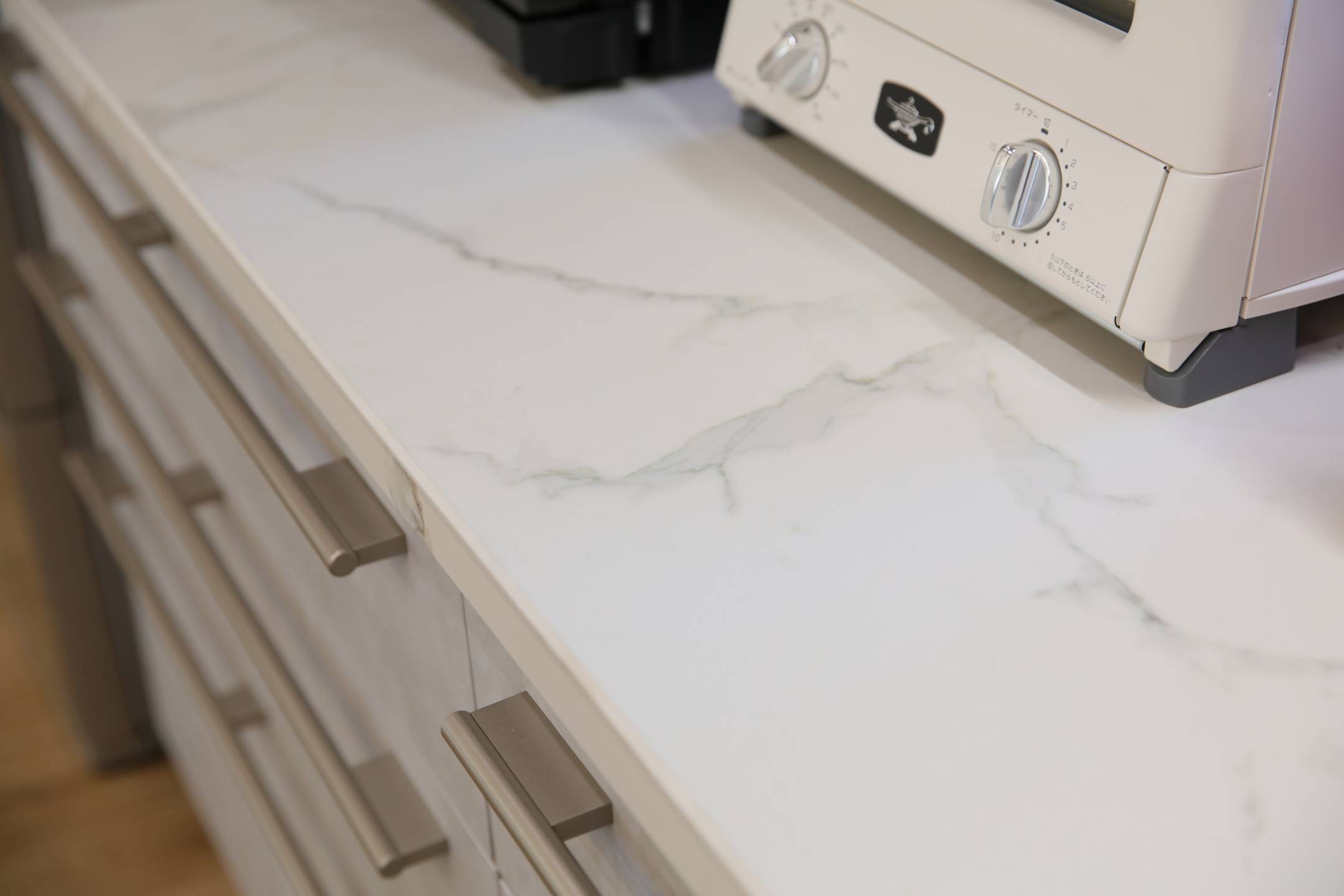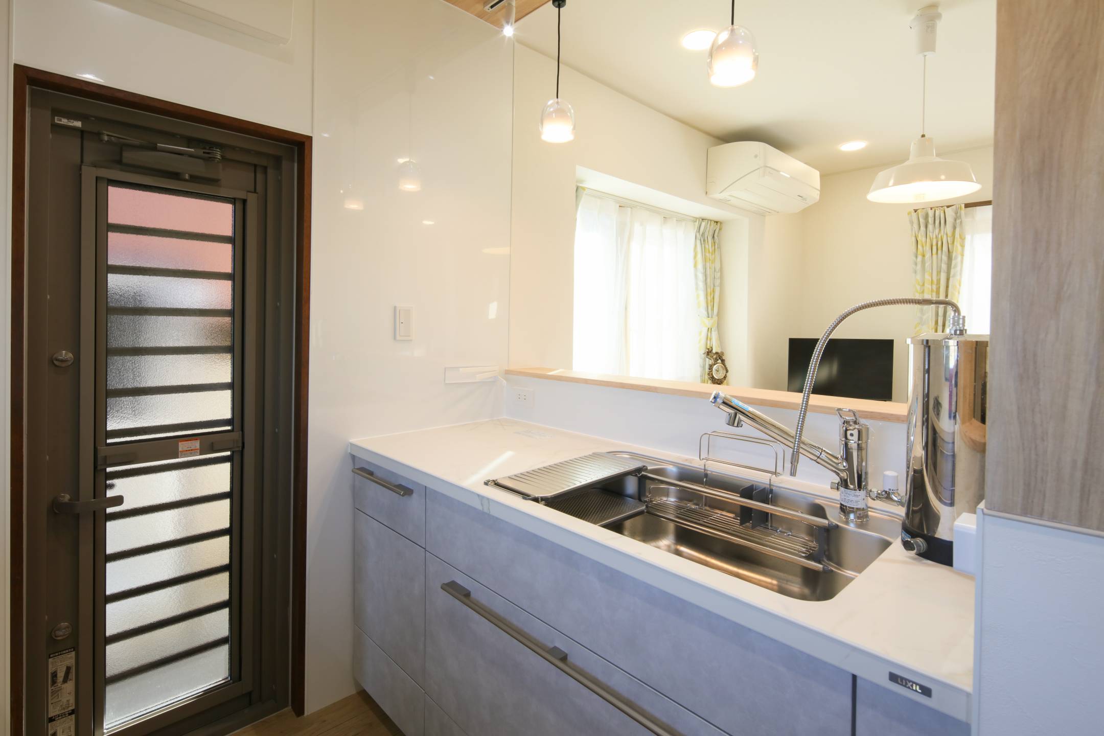 キッチンは壁付けから対面式の二列型に変更し、ご夫婦で作業しやすいよう寸法や動線を細かく調整。3Dパースを活用しながら、空間全体の色味バランスにも配慮しました。