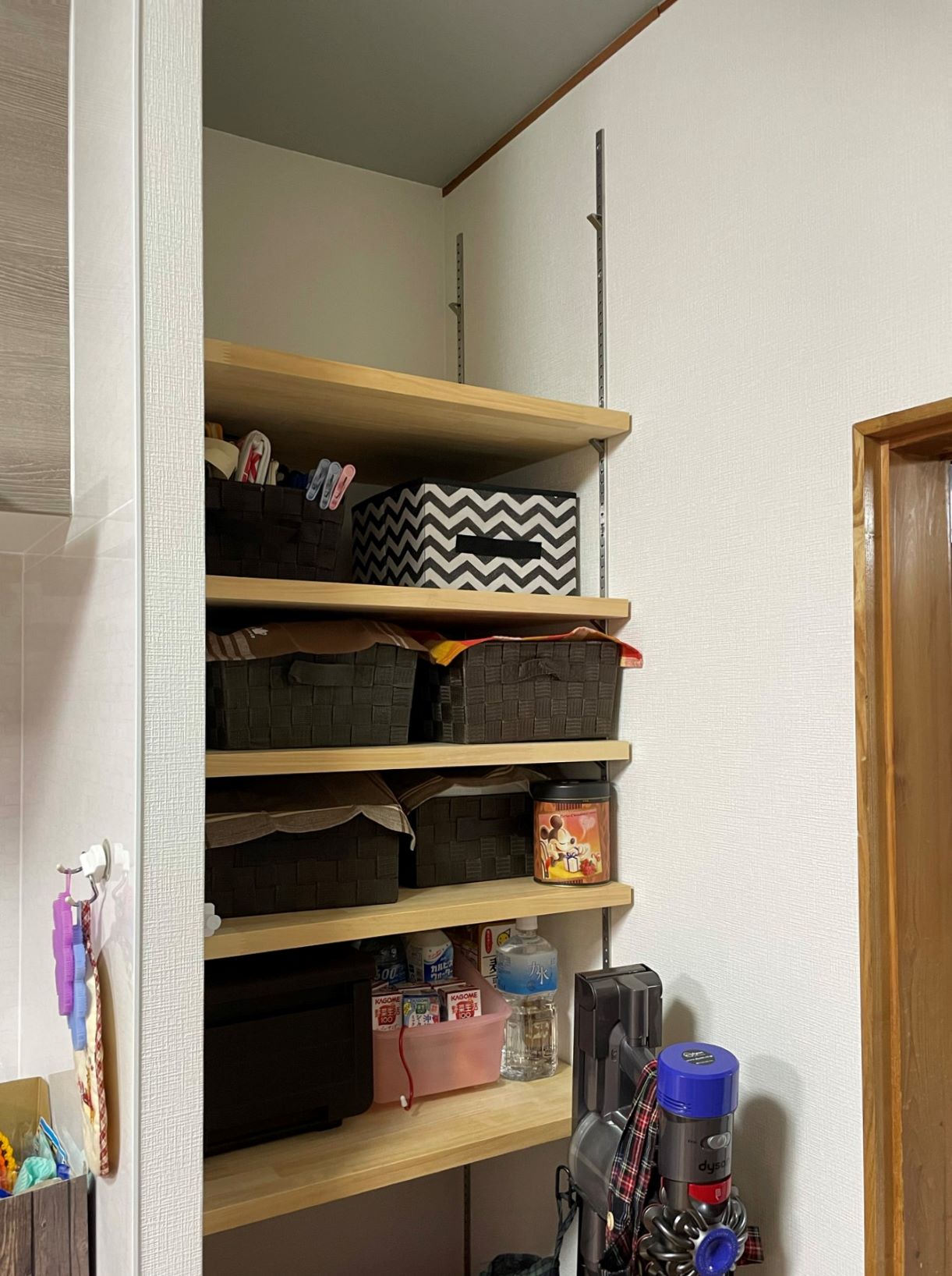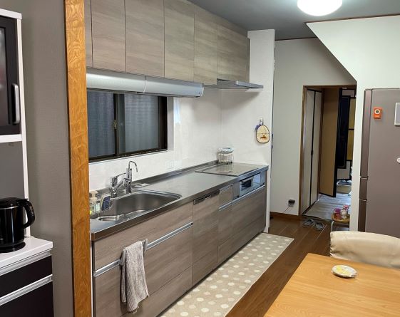 湿気に強く、カビもつきにくいステンレスキャビネットキッチンをご提案させていただきました。また、キッチン横にあった冷蔵庫スペースの壁を解体して可動棚を設置することで、大容量の収納スペースを確保しました。