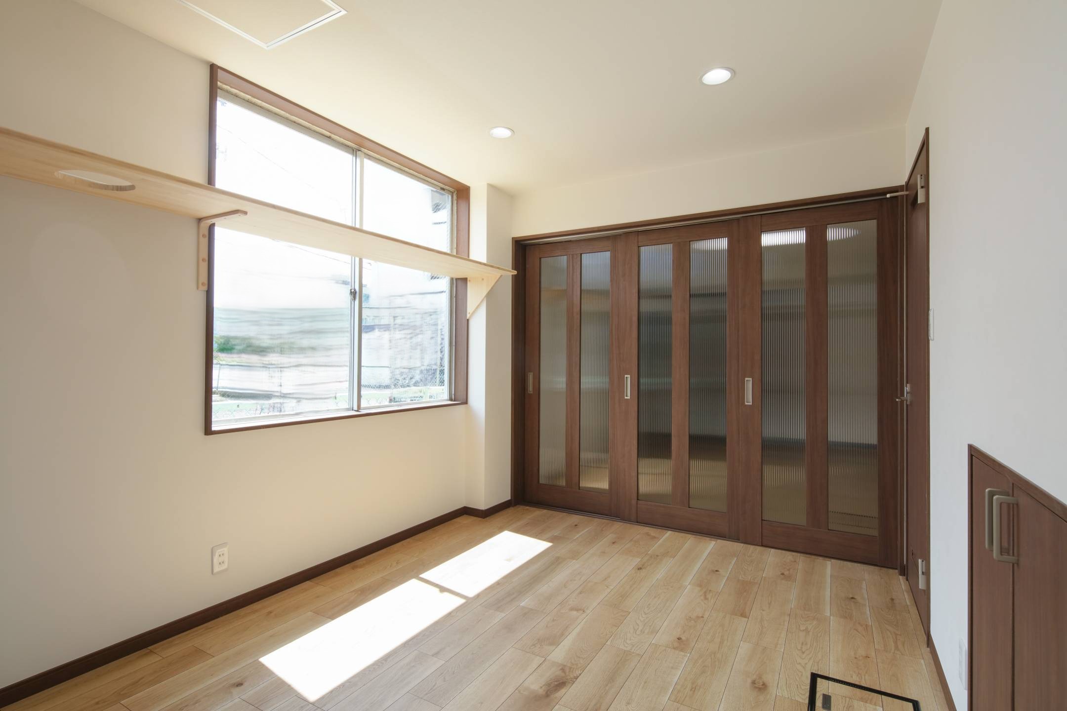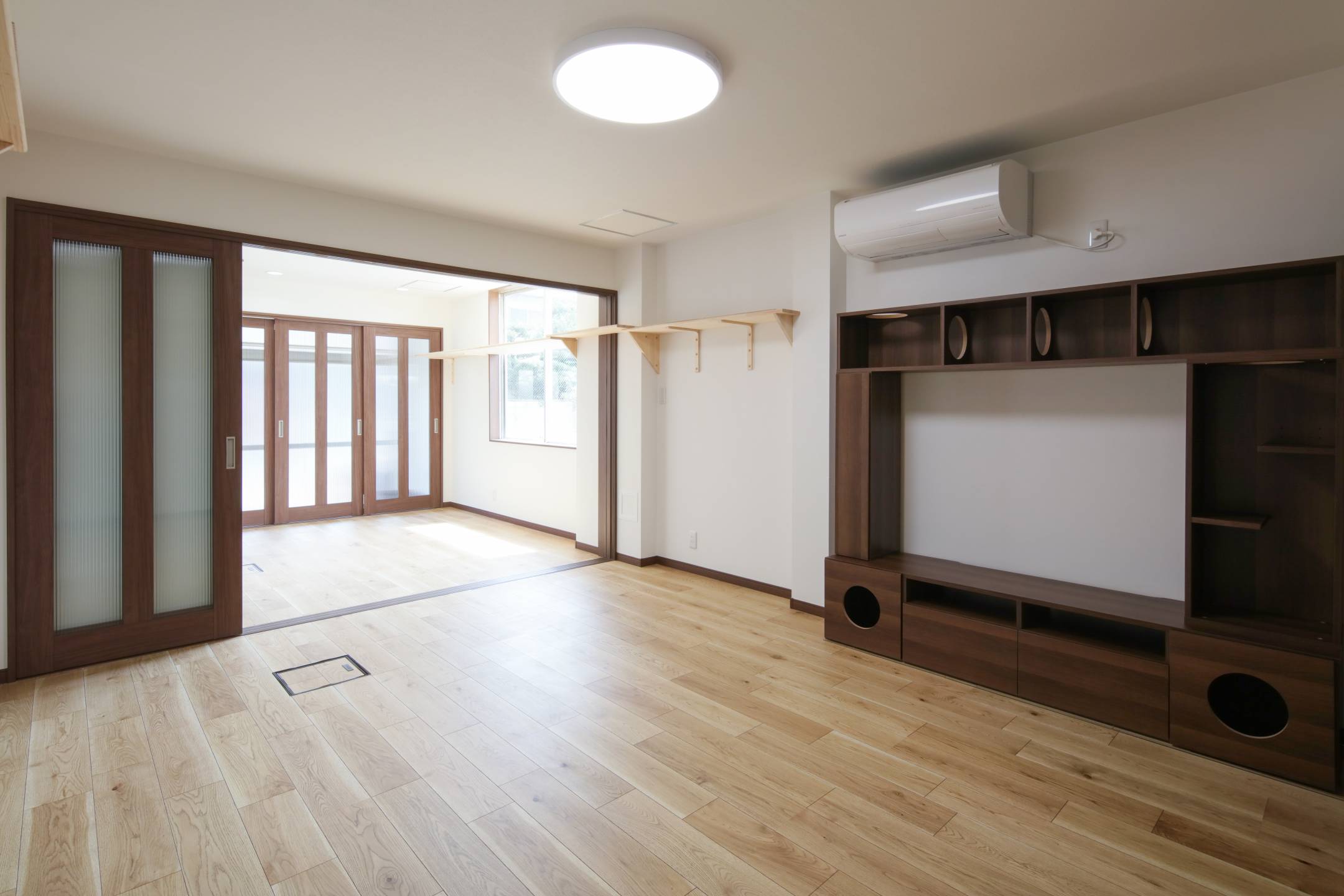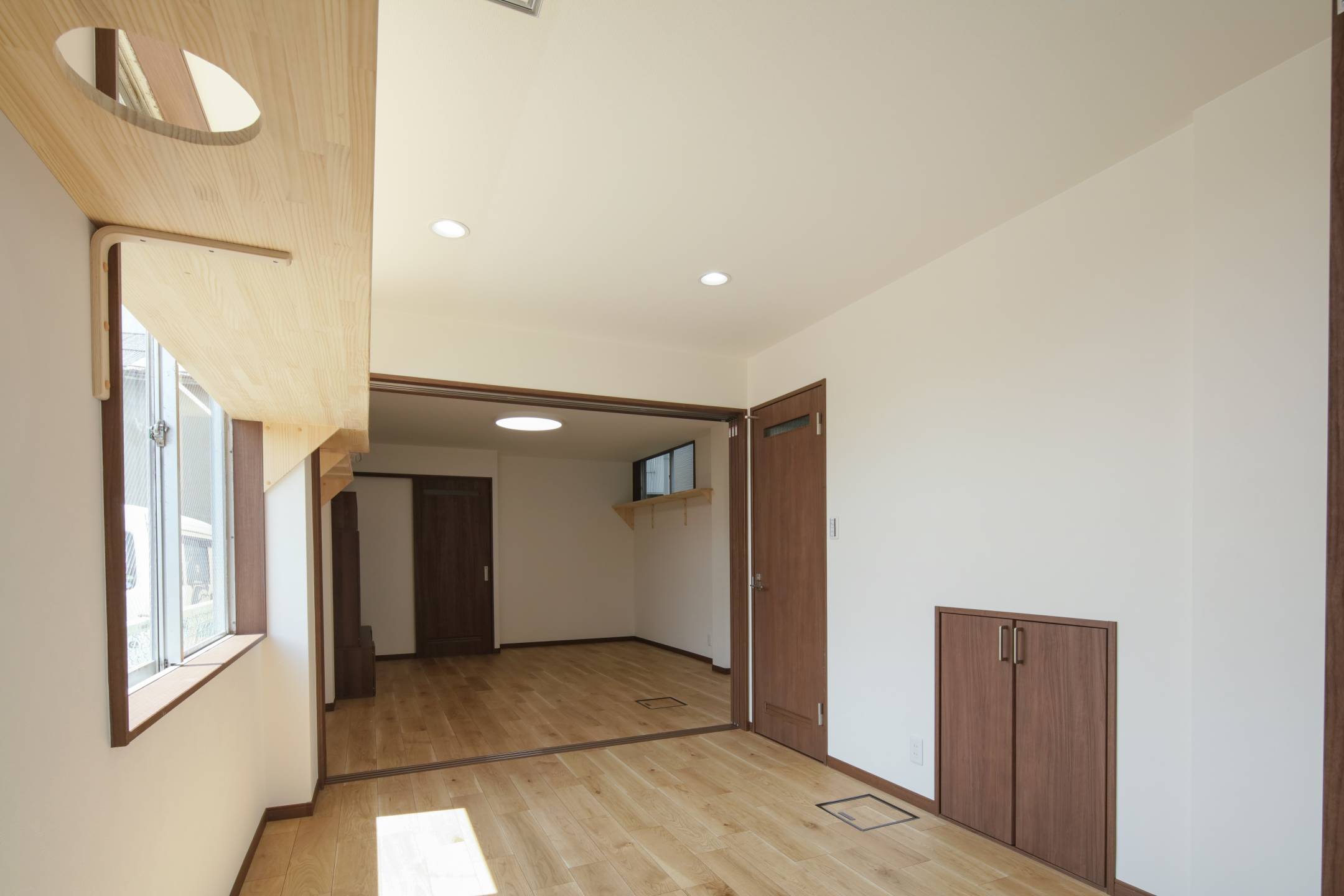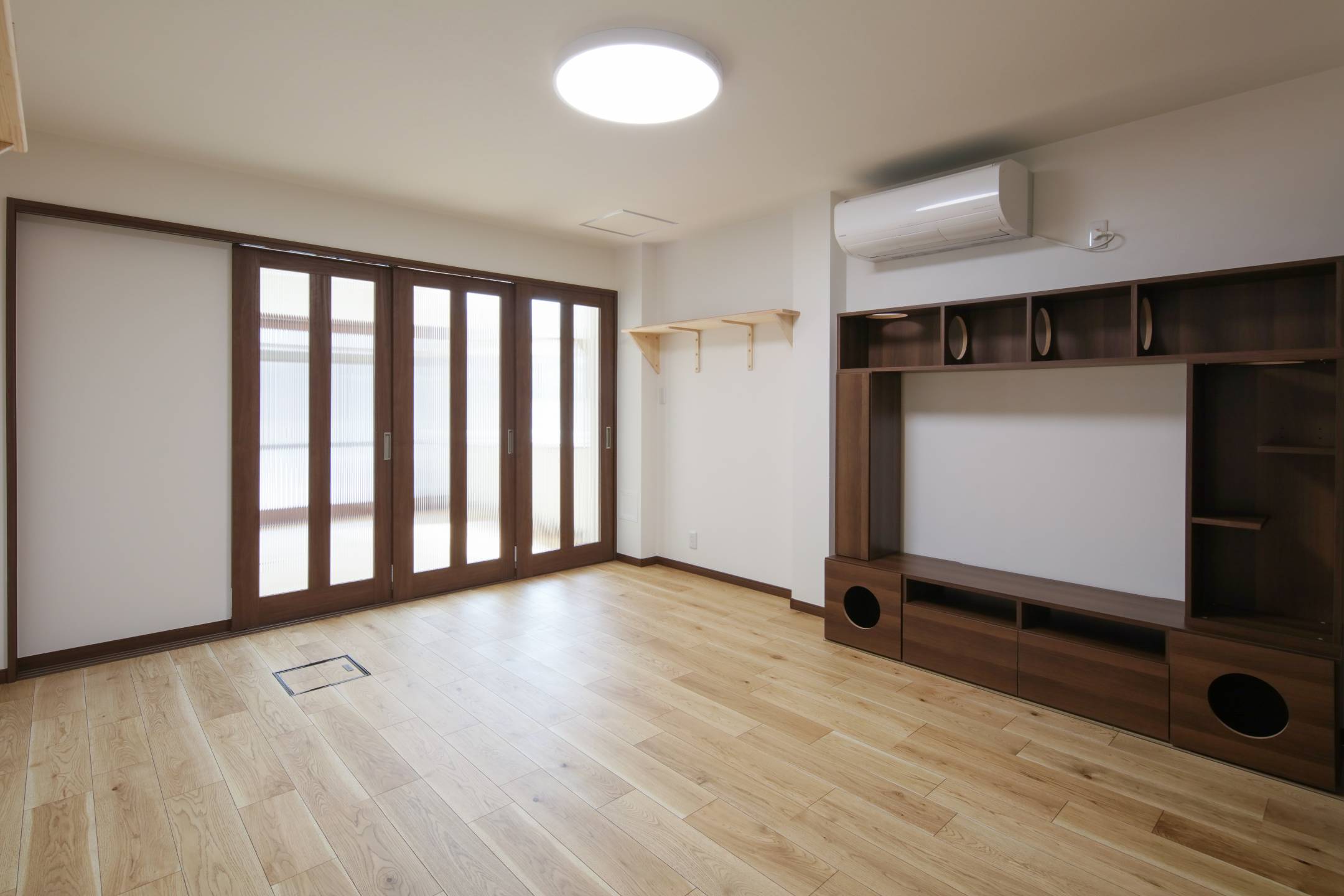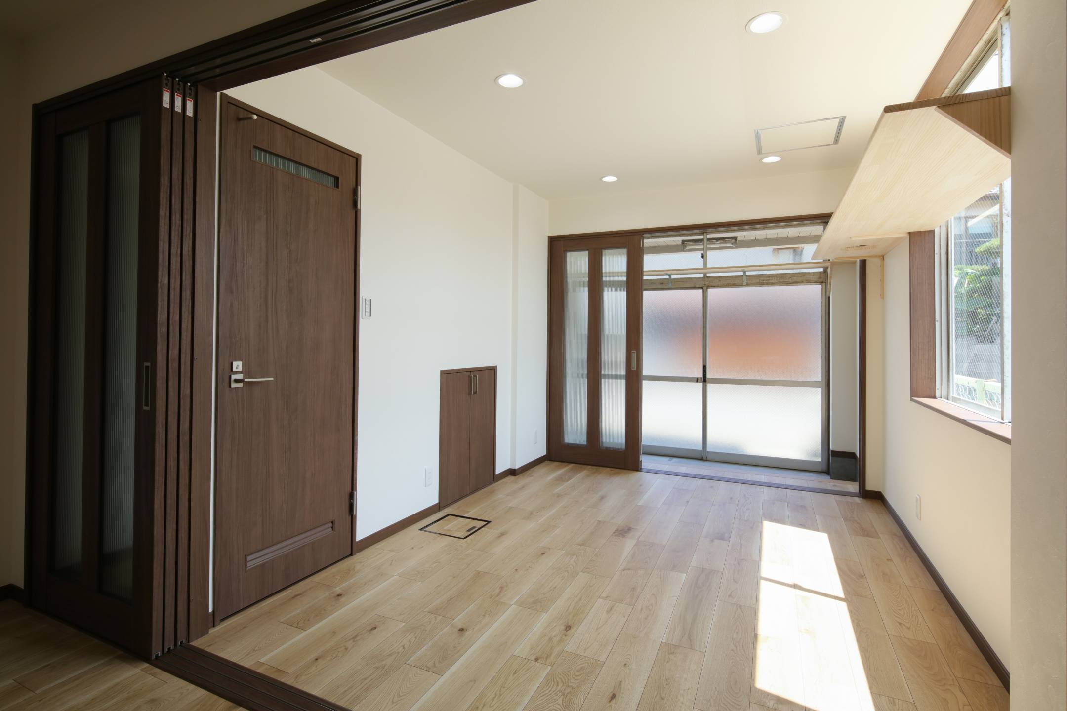 間取り変更(作業スペースを玄関・ホール・洋室に改修)、建具取付け、キャットウォーク取付け、照明設置、フローリング張り、クロス貼り