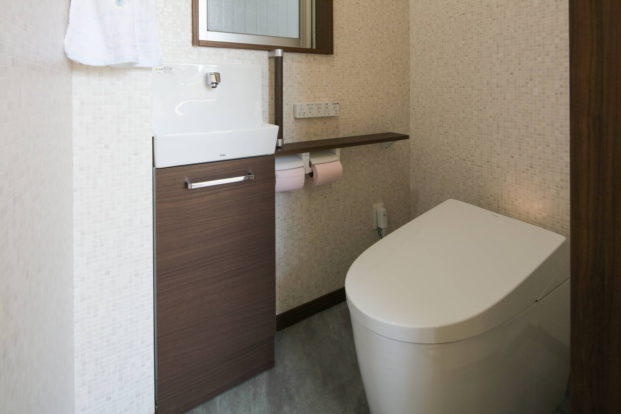 トイレはスペースが限られていたため、タンクレストイレの採用とスペースの拡張をご提案。