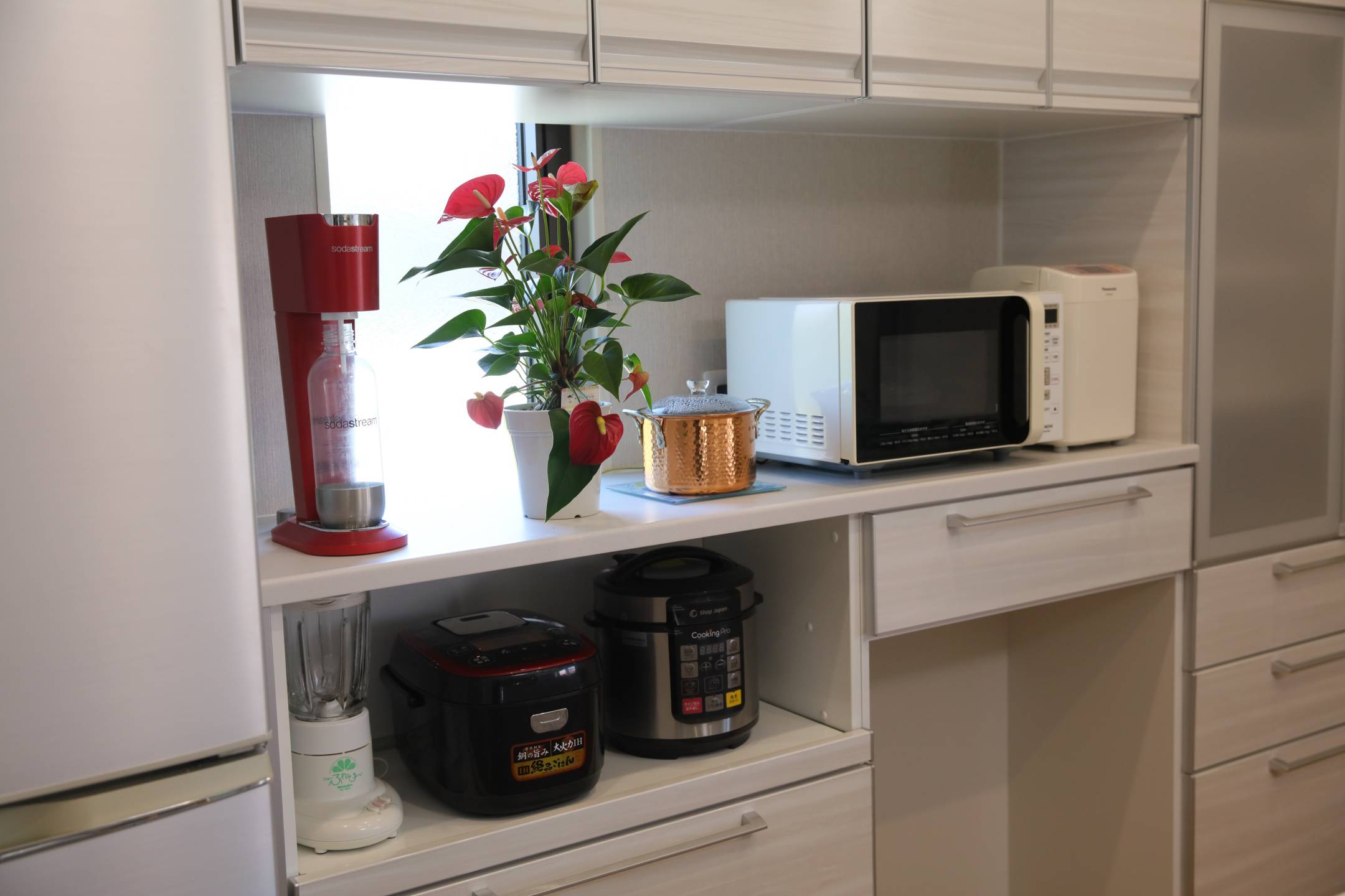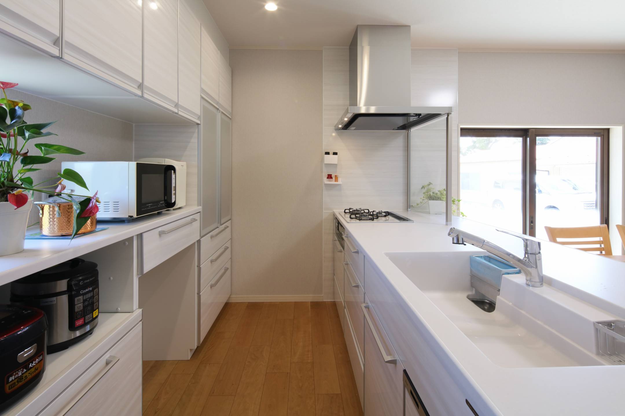 キッチンまわりの収納はシステムキッチンオプションのキャビネットを設置し、デザインの統一感を演出しました。