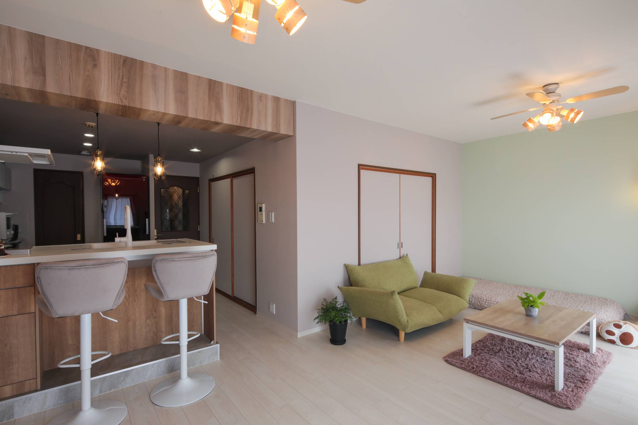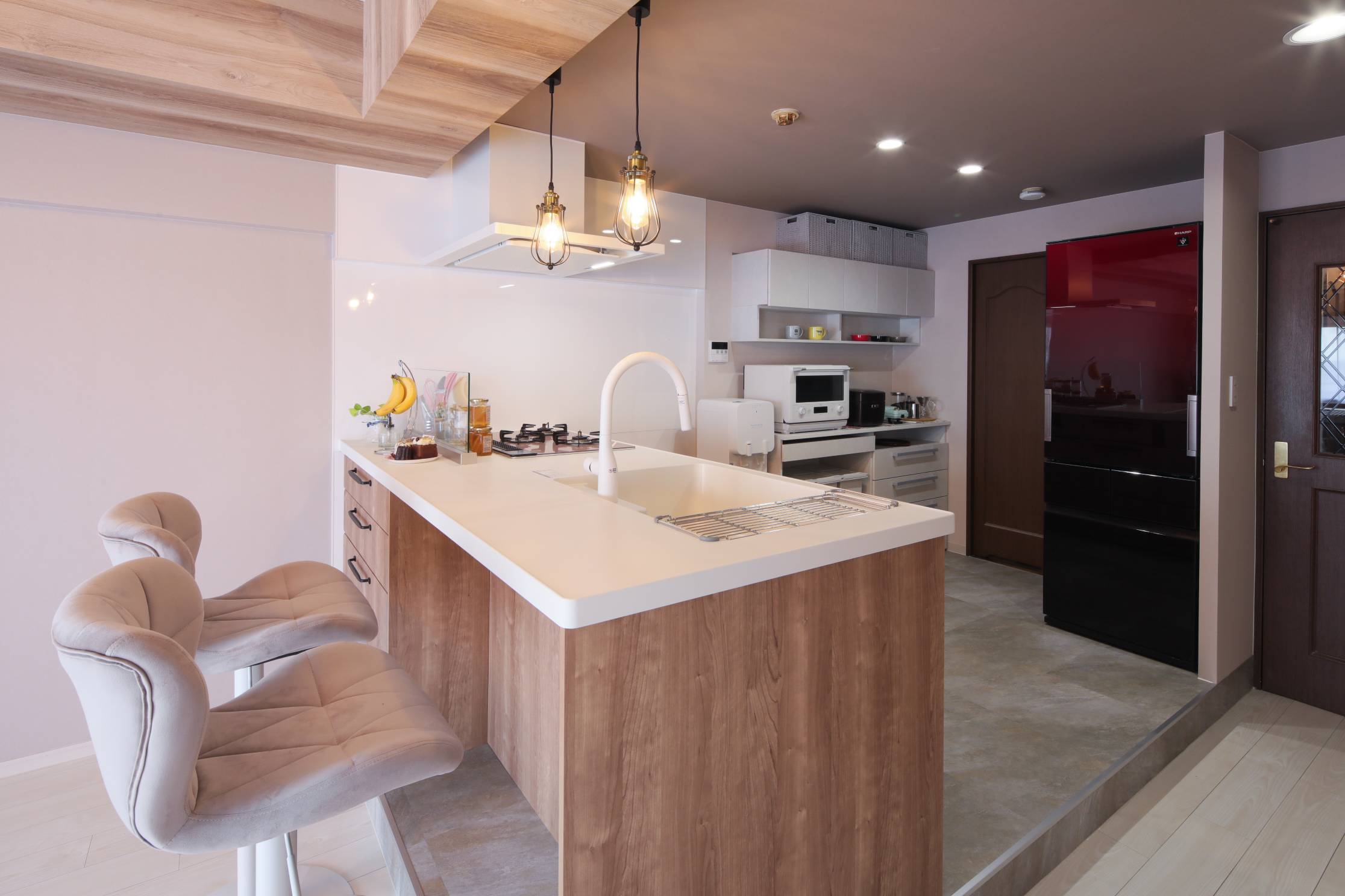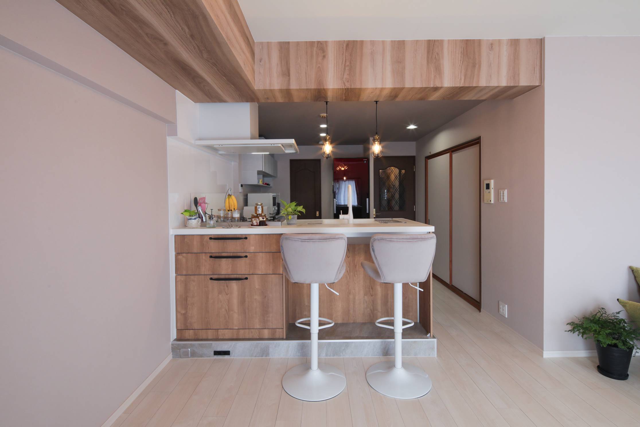 間取り変更(キッチンの間仕切り壁撤去)(寝室の間仕切り壁撤去)(壁付キッチンからぺニンシュラキッチンに改修)、カウンター設置、照明取替え、クロス貼替え、フロア張替え