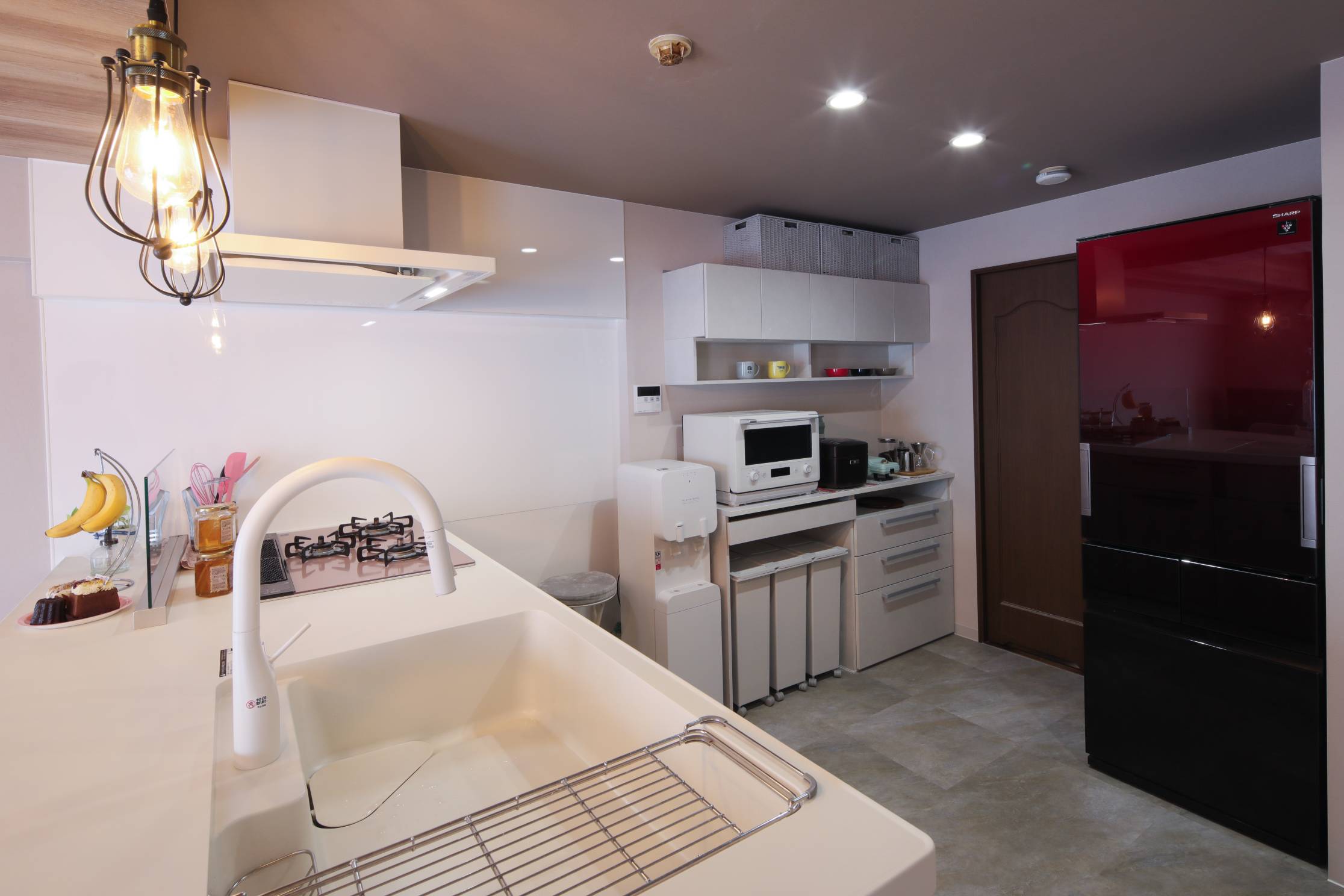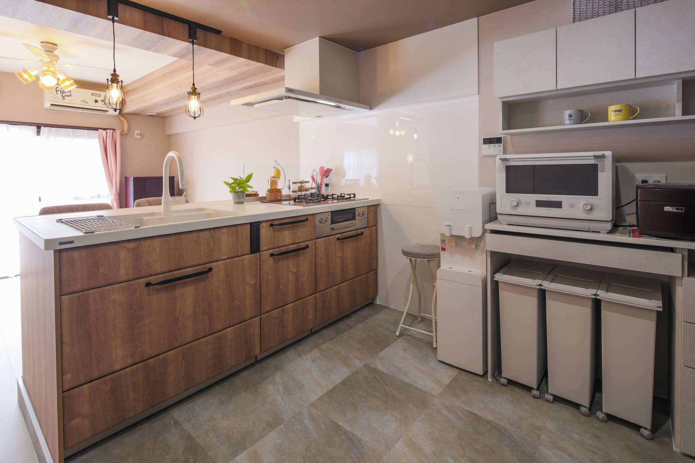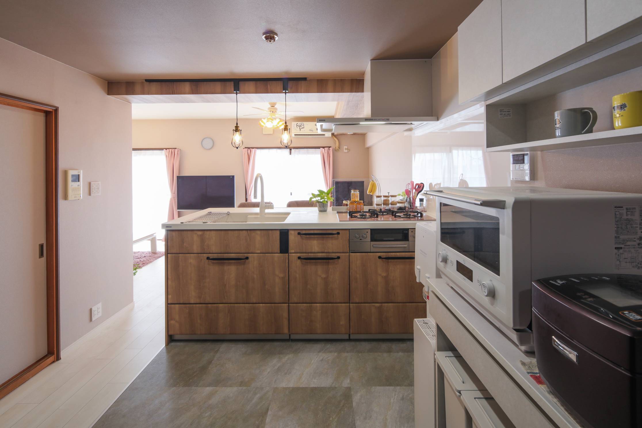 間取り変更(キッチンの間仕切り壁撤去)(寝室の間仕切り壁撤去)(壁付キッチンからぺニンシュラキッチンに改修)、カウンター設置、照明取替え、クロス貼替え、フロア張替え