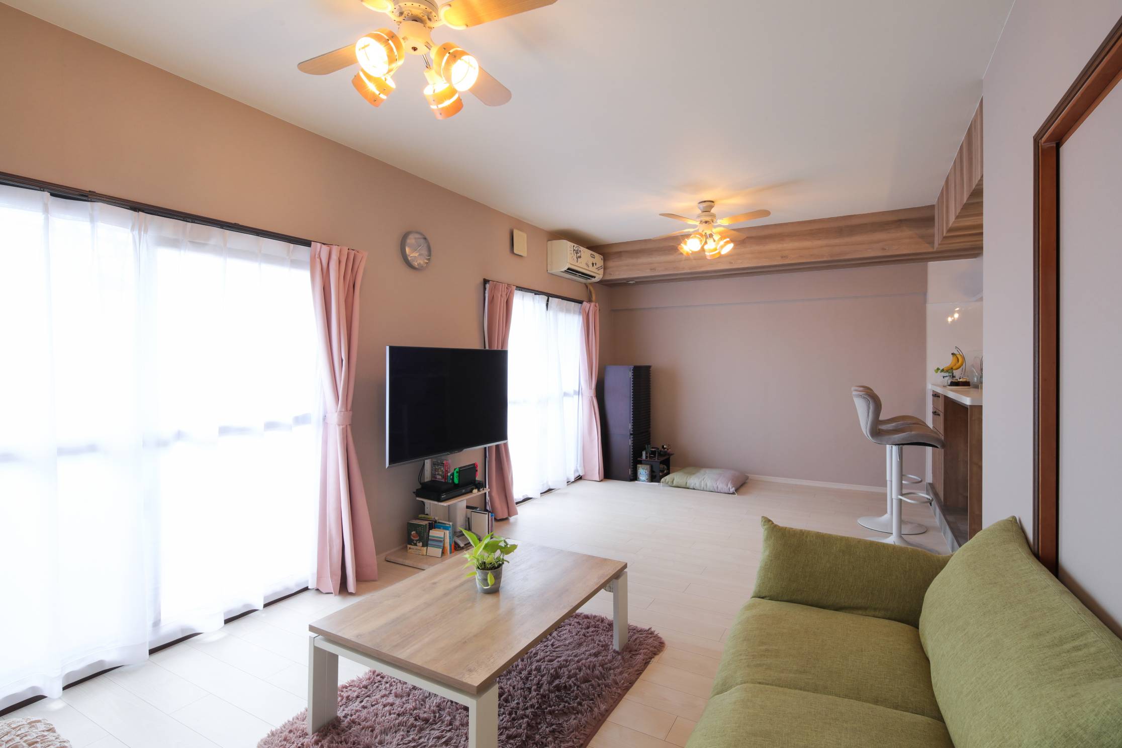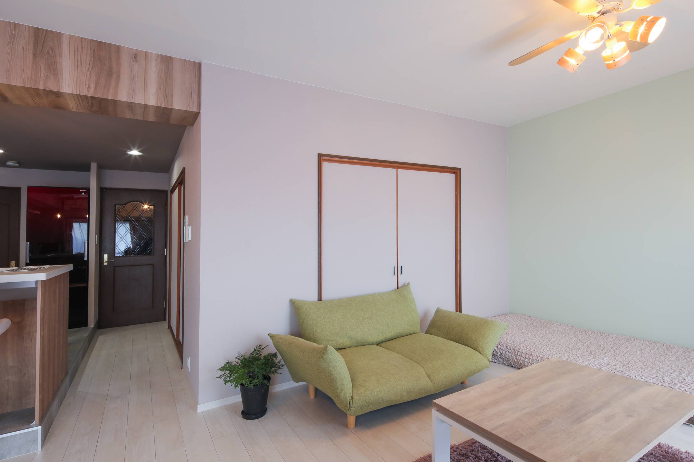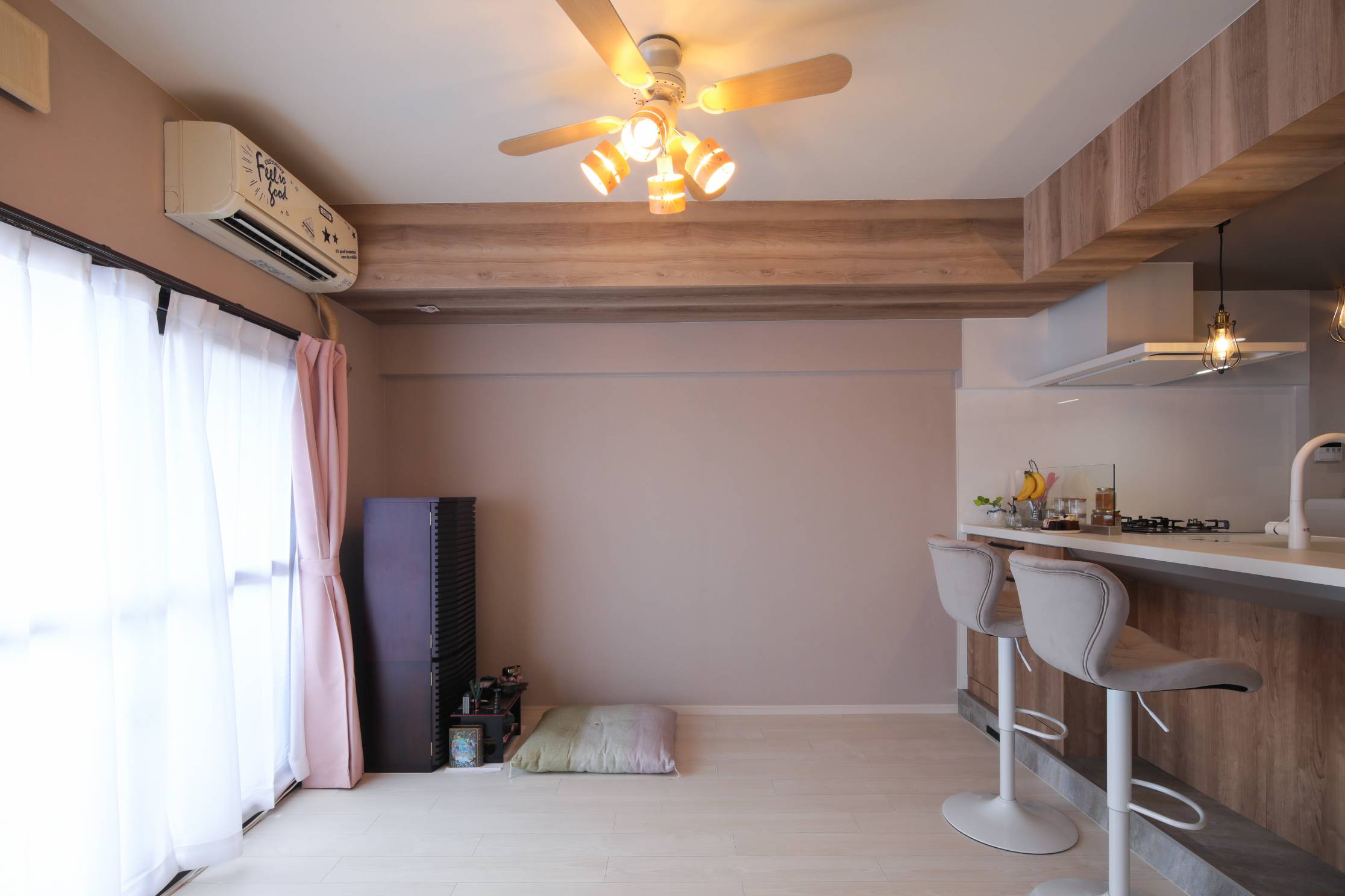 お客さまのご要望であったオープンキッチンと広々としたLDKを実現するため、キッチン・リビング・寝室を一体化したLDKへ間取りを変更。