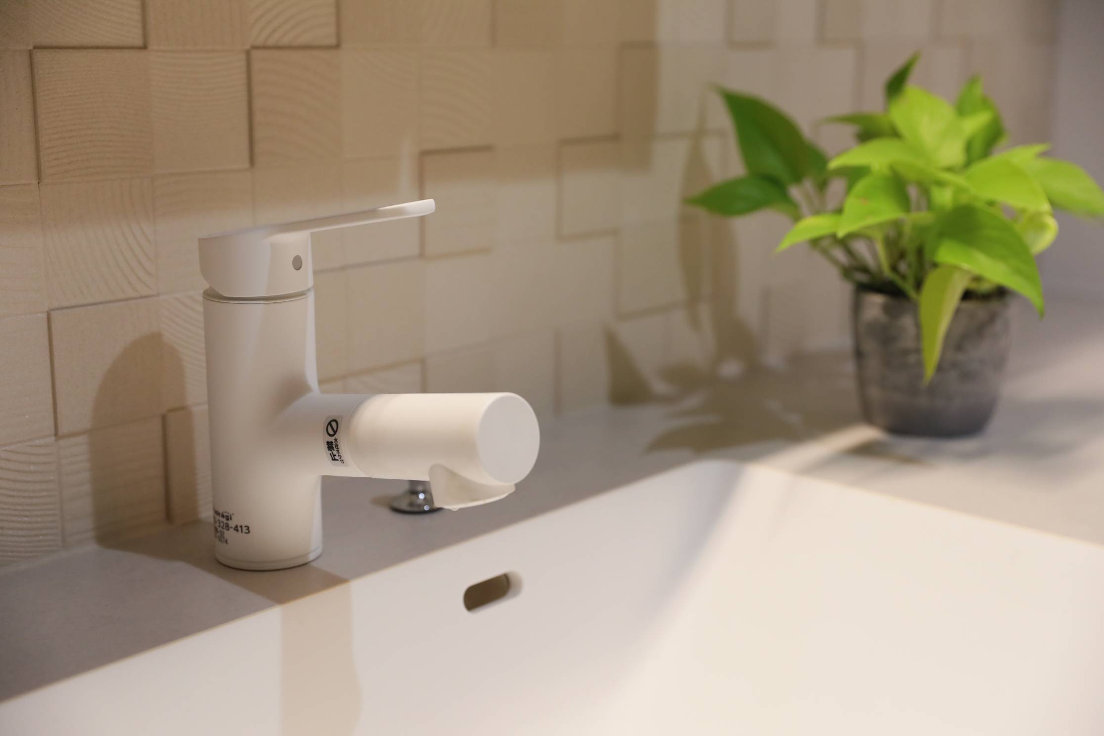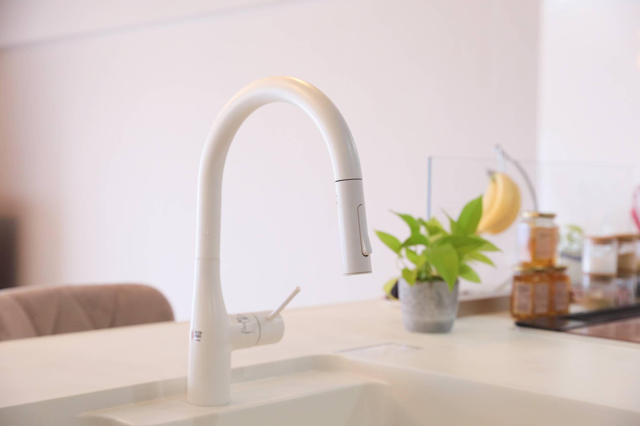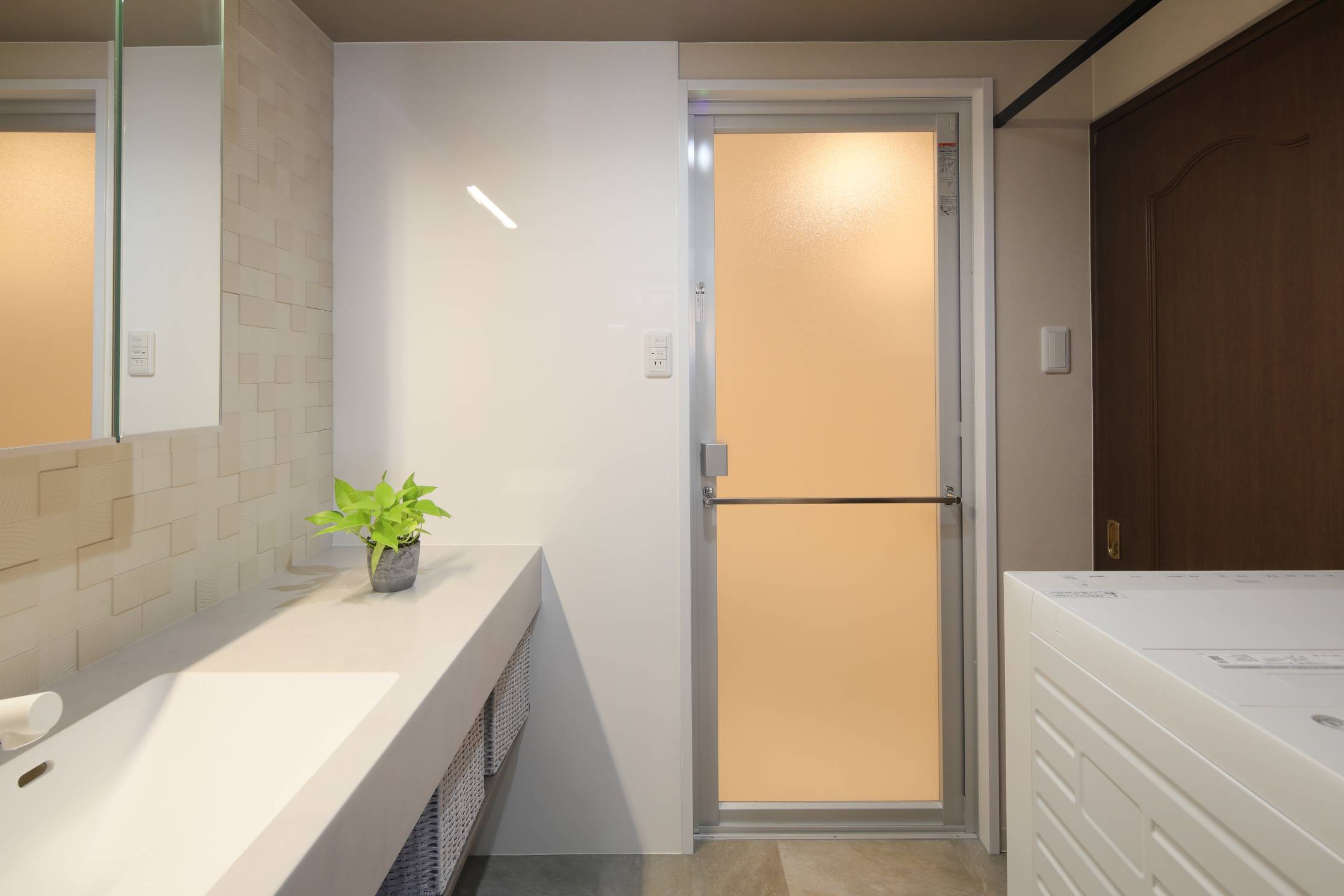 調湿効果のあるエコカラットと、キッチンと統一した白の水栓で上質な印象に。