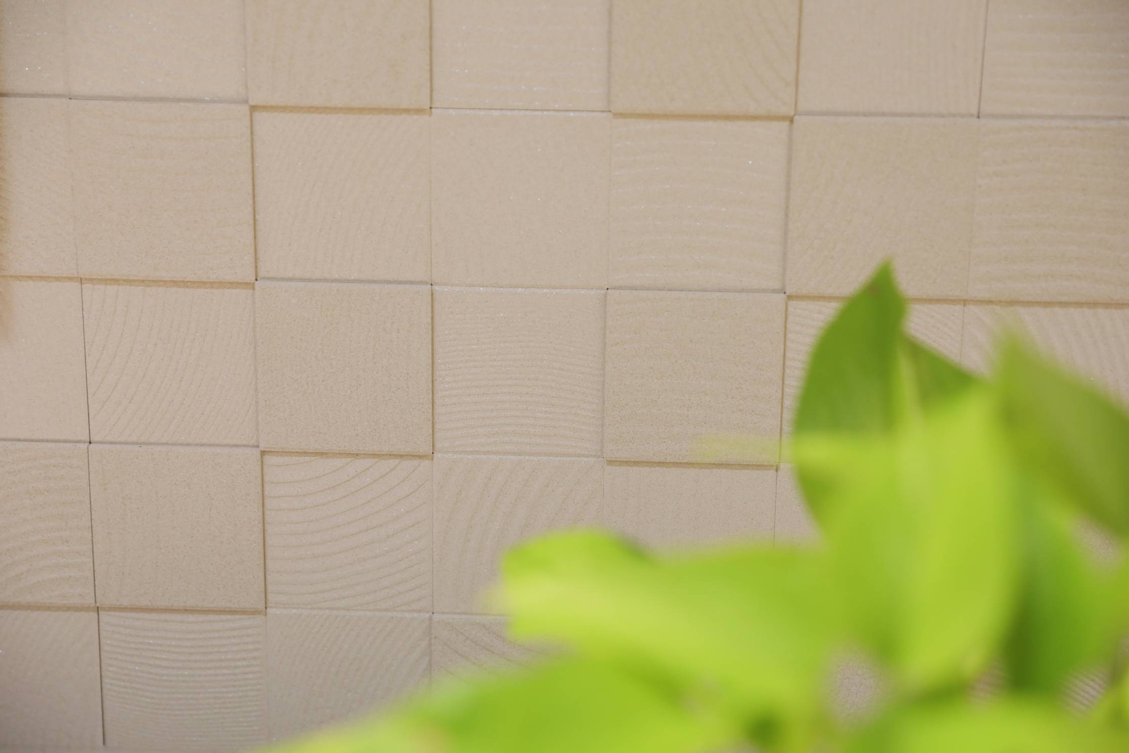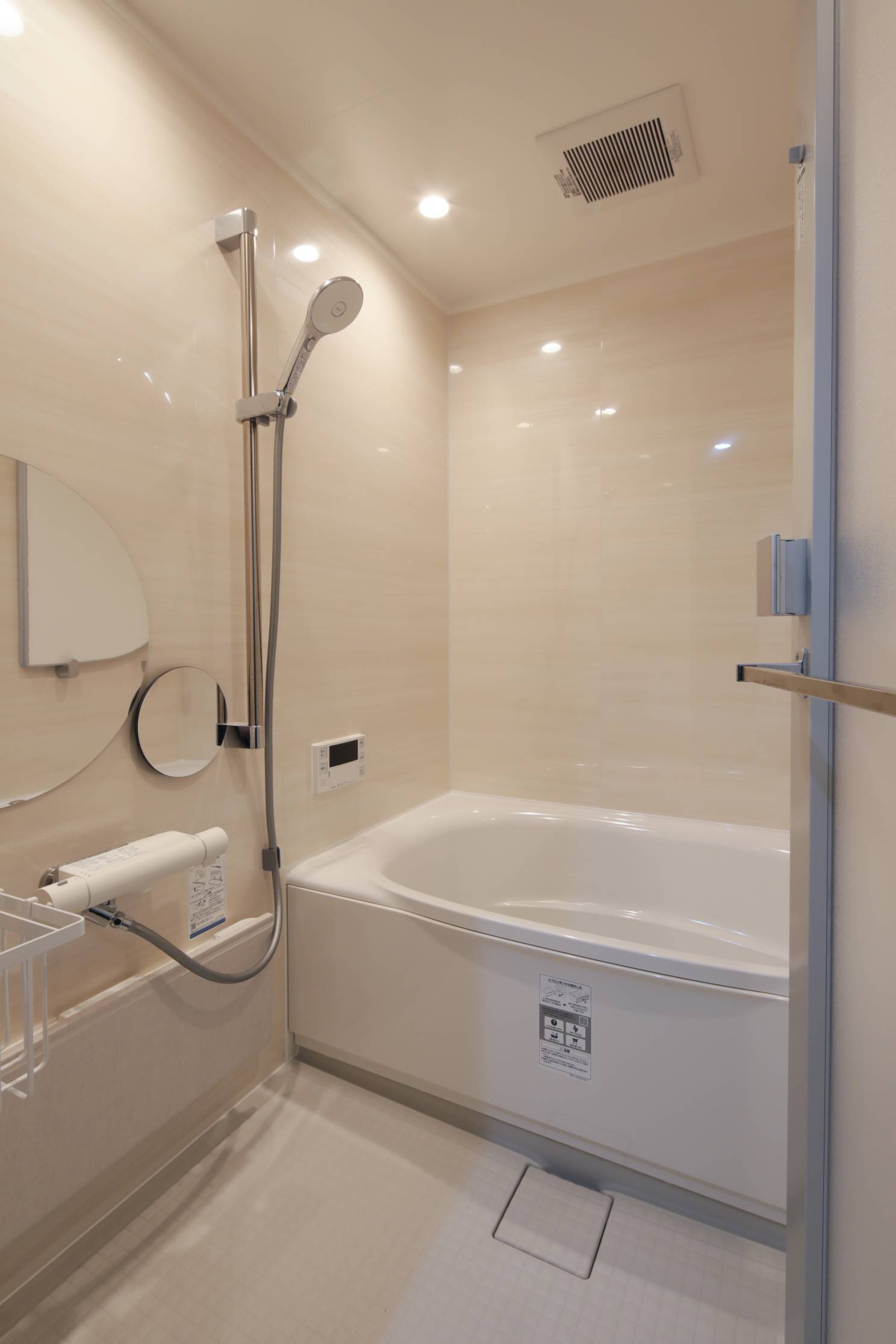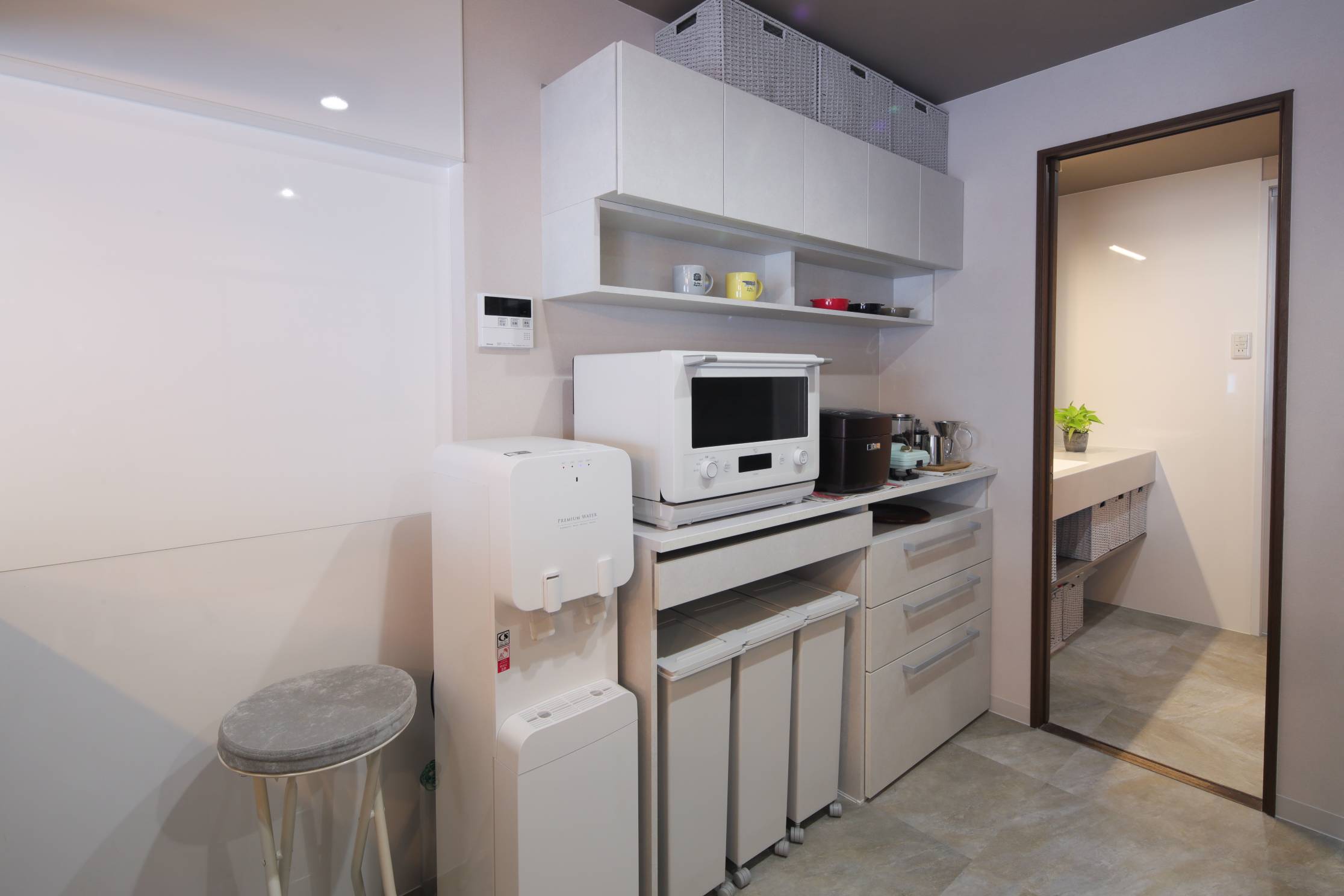 調湿効果のあるエコカラットと、キッチンと統一した白の水栓で上質な印象に。