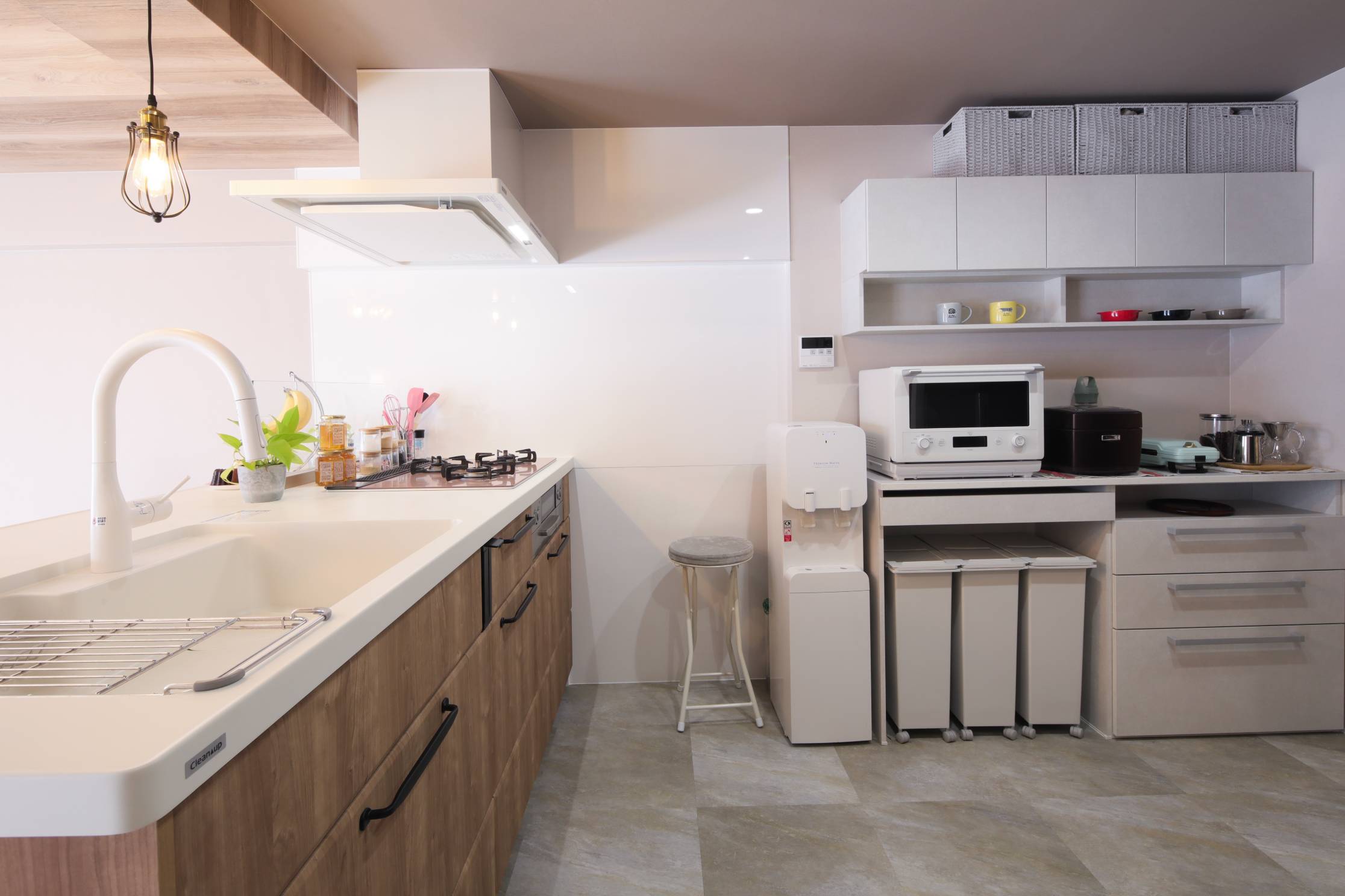 内装は木目とベージュで統一し、キッチンを中心に温かみのある空間に。