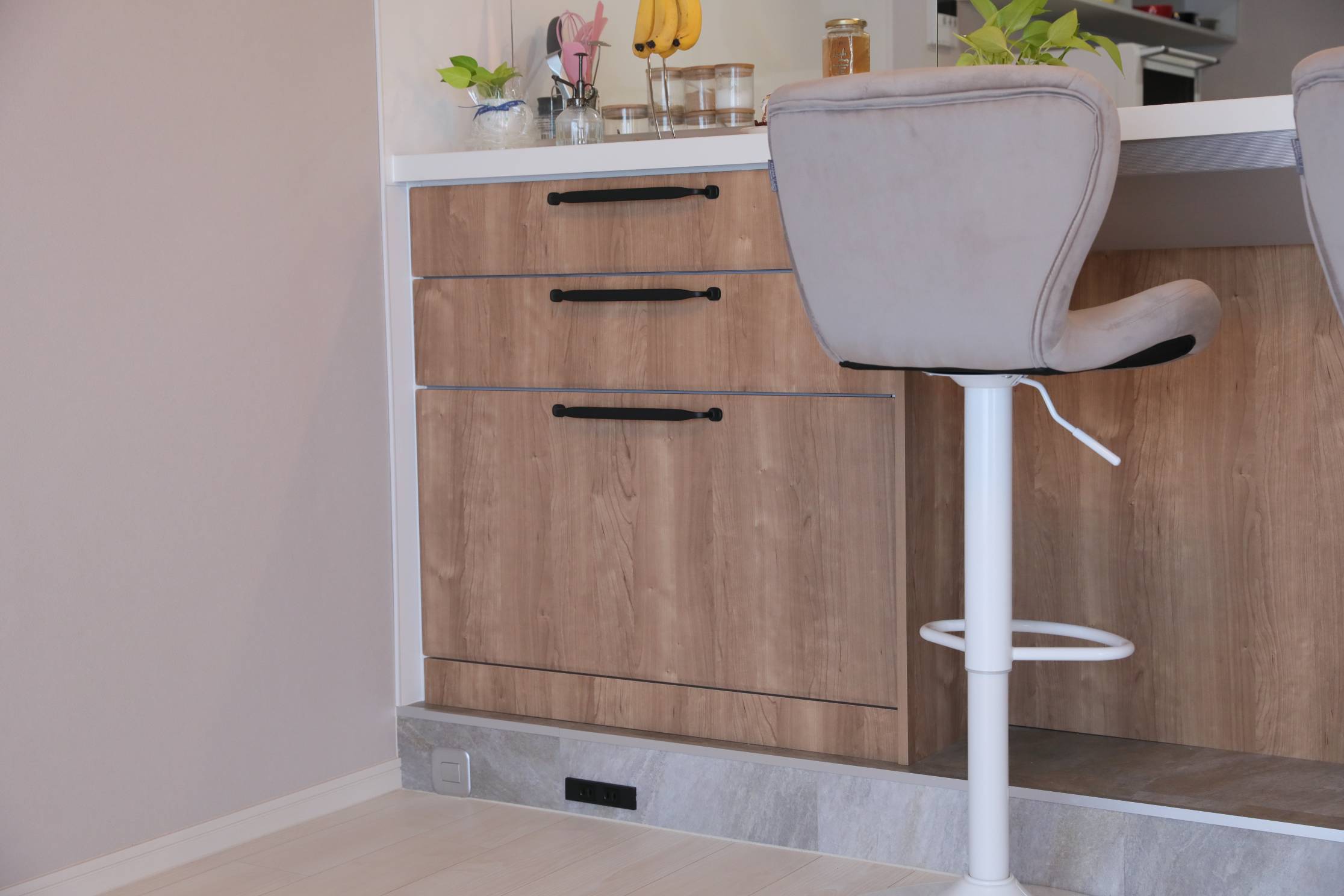 ペニンシュラ型キッチンの採用に伴い、配管ルートを確保するため浴室・洗面脱衣室と同じ高さまで床を上げて対応しました。