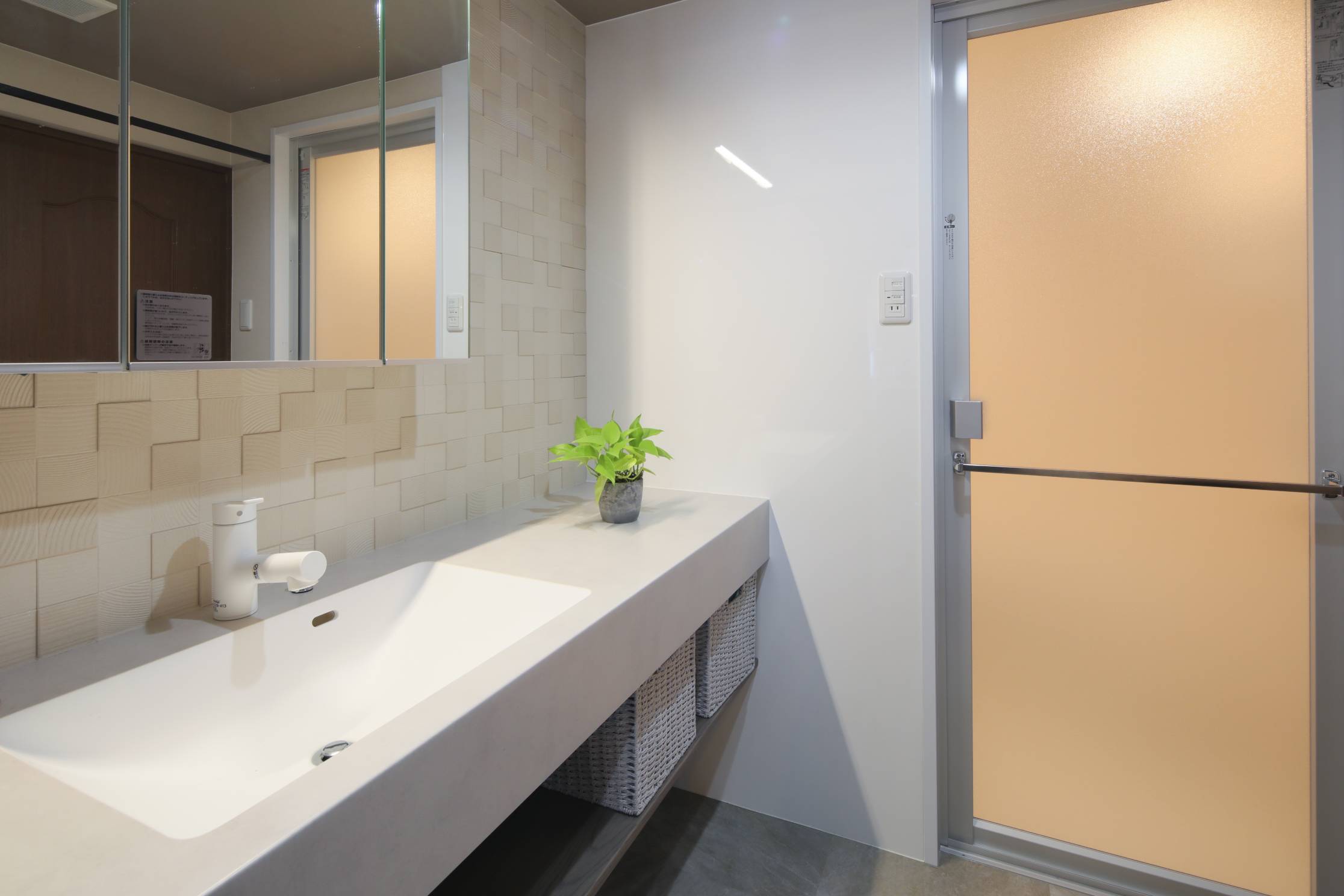 側面の壁にはお手入れのしやすい洗面パネルを設置して清掃性もアップしました。