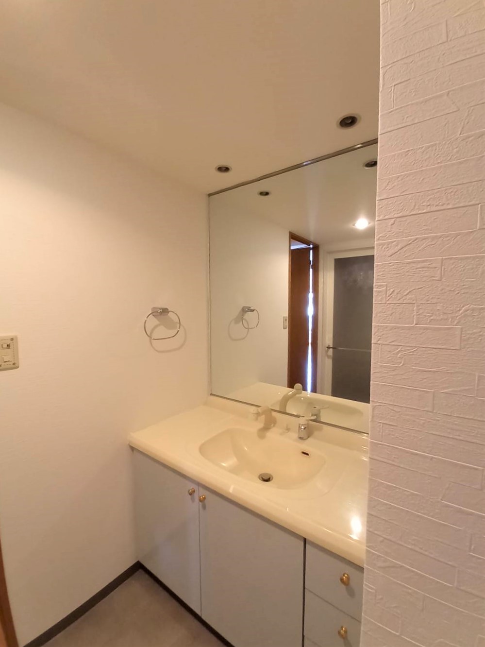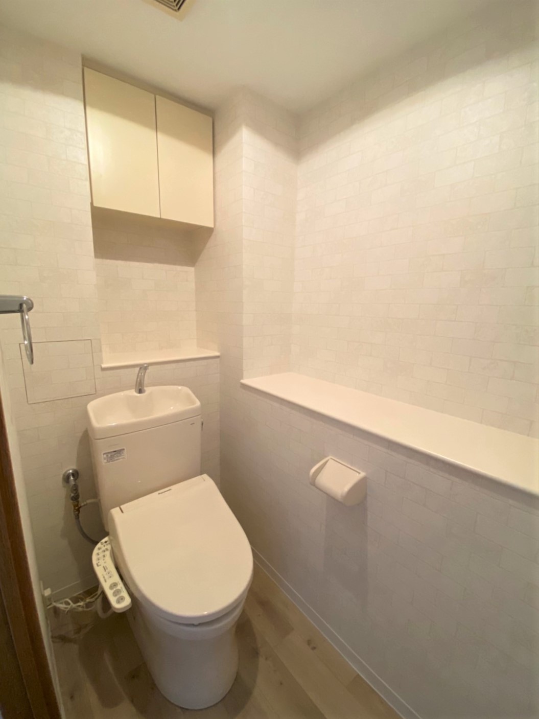 トイレはタイル調で優しい色合のクロスをご提案させていただき、清潔感があって広く感じられる空間となりました。洗面室は、ゆったりと落ち着いた雰囲気になるように、石目調のクロスにグレーのタイルフロアを合わせました。