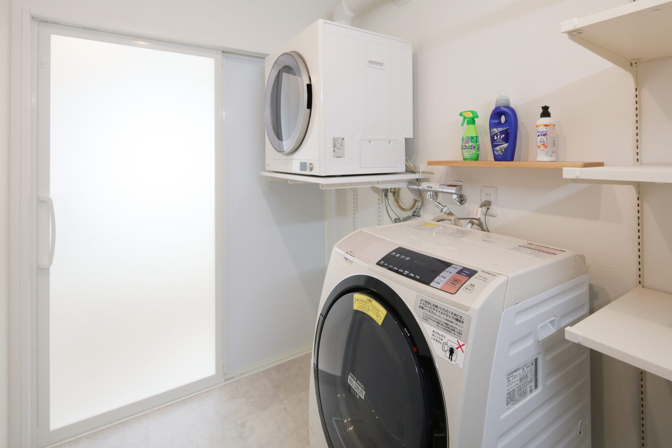 洗面化粧台取替え、可動棚設置、衣類乾燥機設置、室内物干し設置、クロス貼替え、フロア張替え