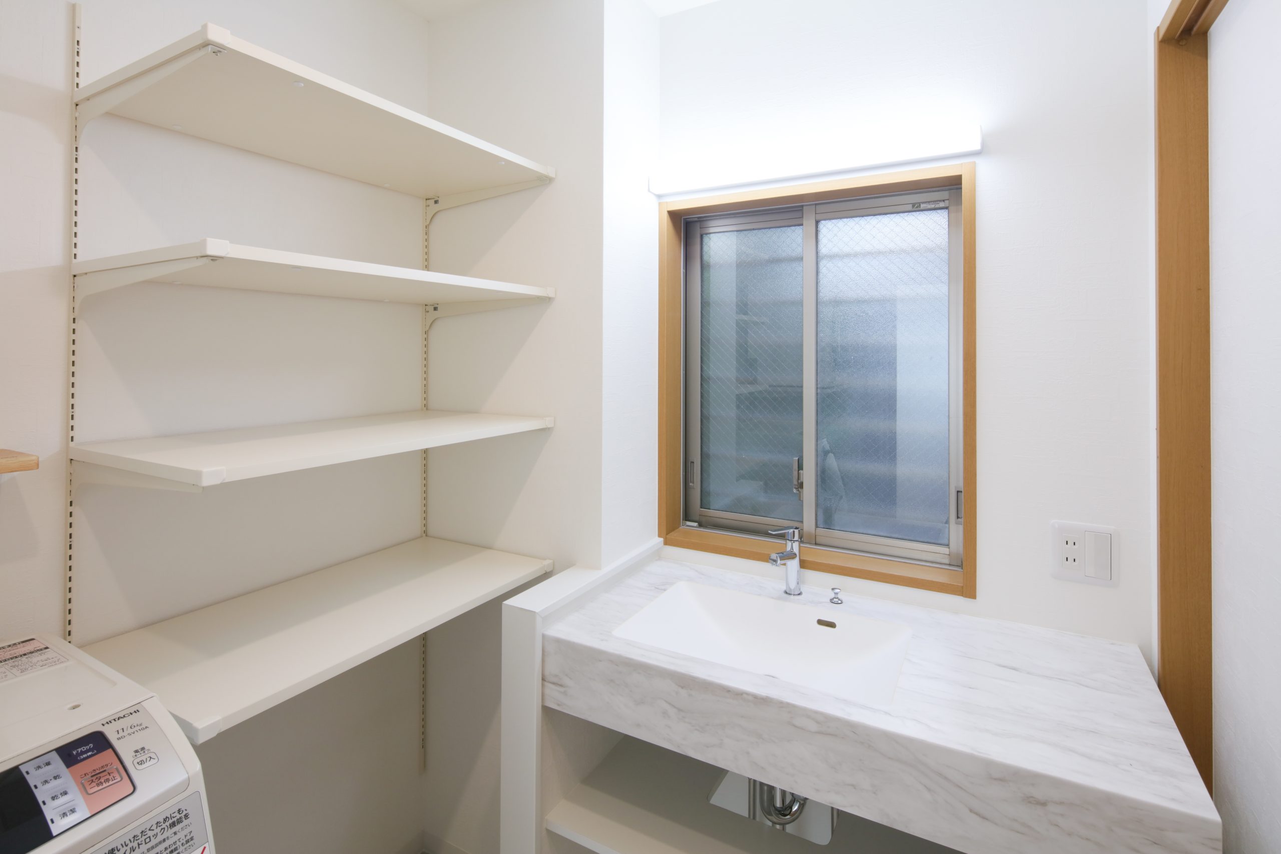 衣類乾燥機は洗濯機と横並びで配置できるようレイアウトを構成し、「洗う→乾かす→畳む→可動棚に収納」という動線がスムーズになるよう、洗面化粧台の位置を窓側へ変更。空いたスペースに可動棚を新設しました。図面と3Dパースを使い、具体的に家事動線がイメージができる形でご提案しました。