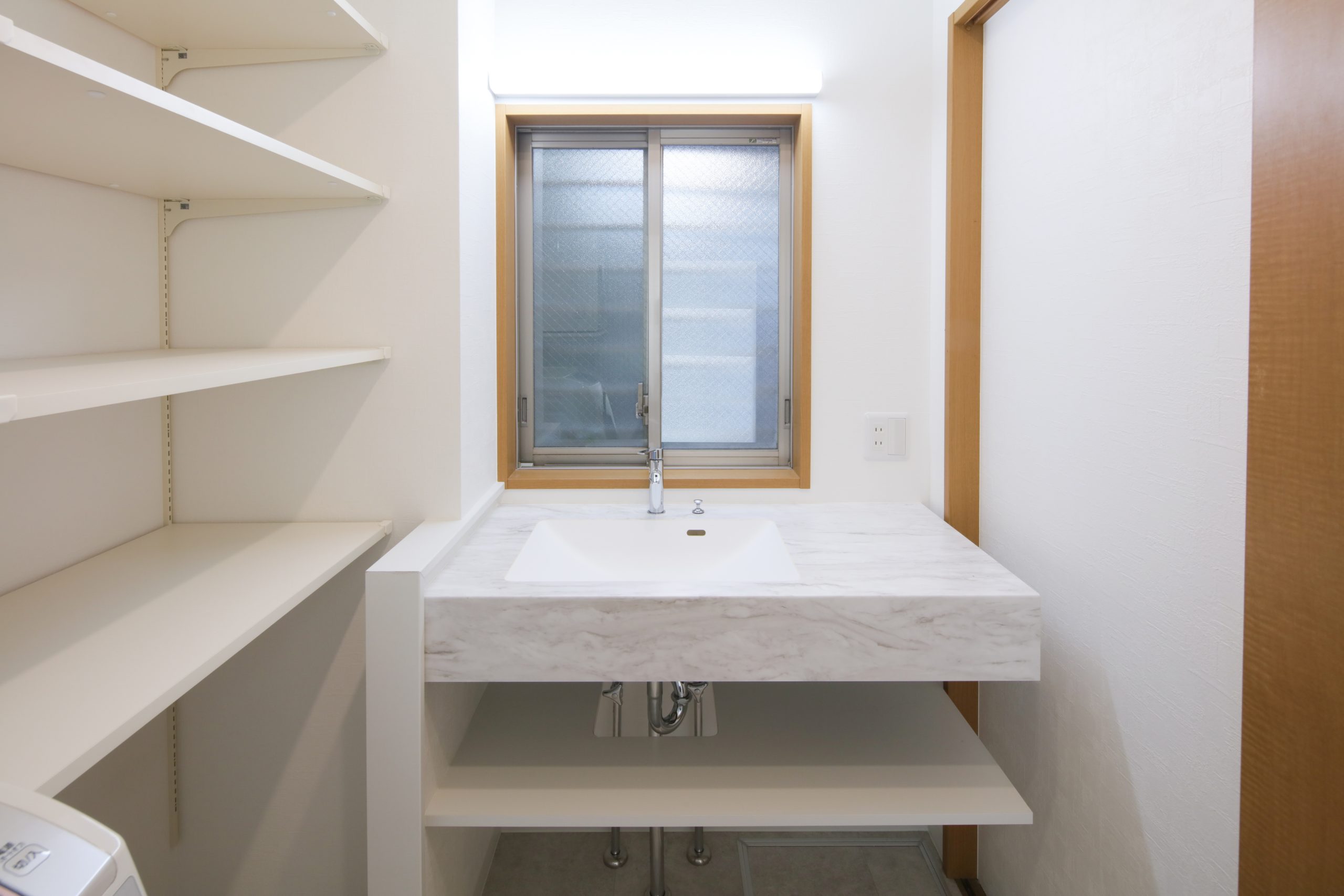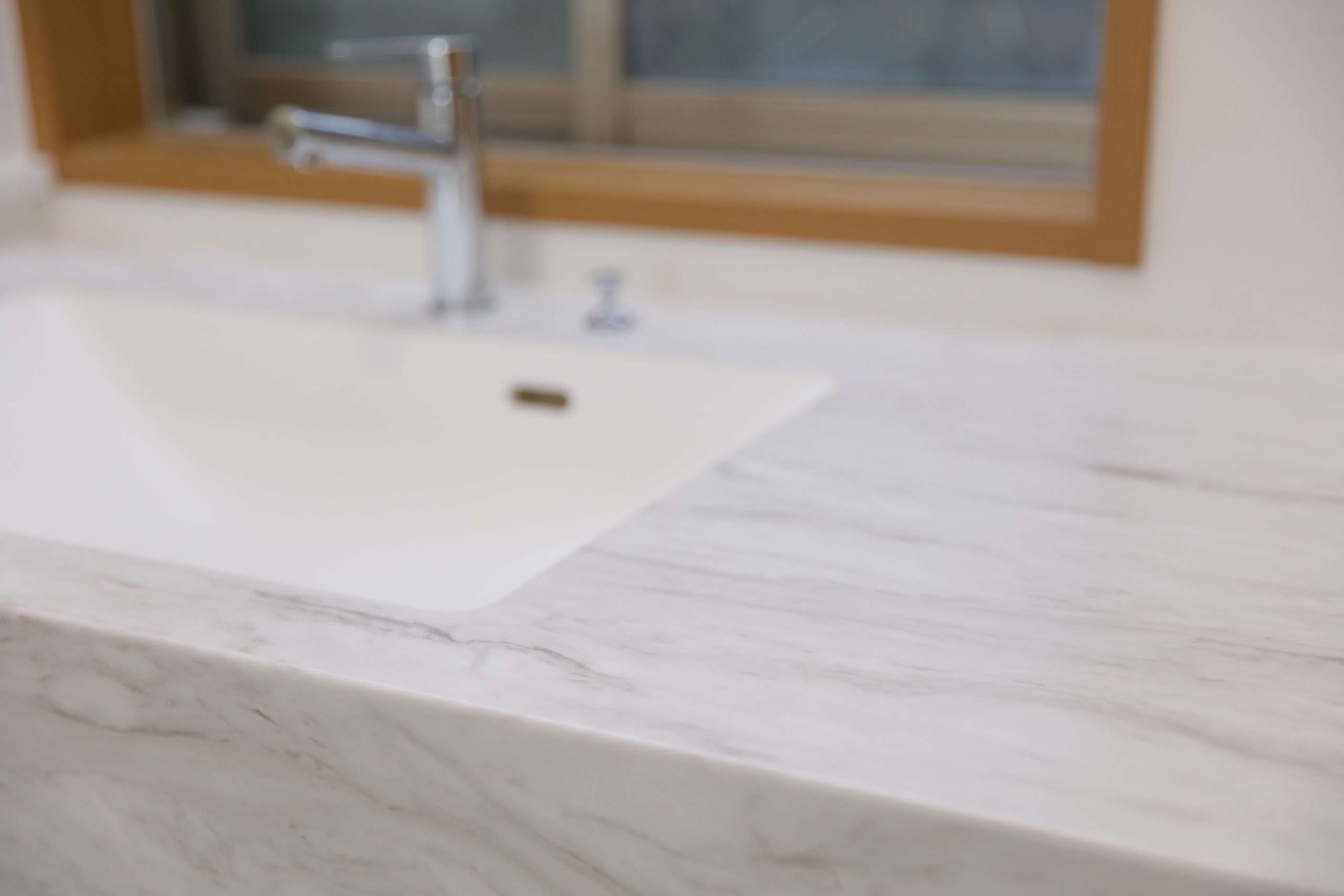 洗面化粧台にはアイカのメラミンポストフォームを採用しました。