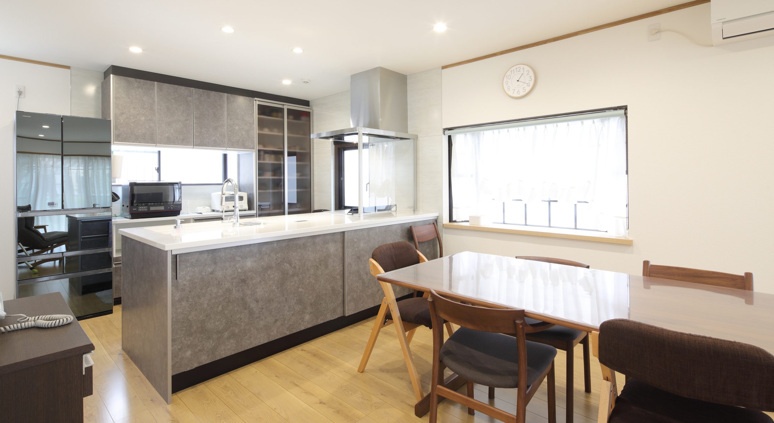 キッチンは、対面フラットタイプにすることで、部屋の端まで見渡せるようになり、会話を楽しみながら料理もできるようになりました。お客さまこだわりのキッチンの色に合わせて、床・クロスやカーテンをご提案させていただき、明るく爽やかなテイストの空間にまとめました。
