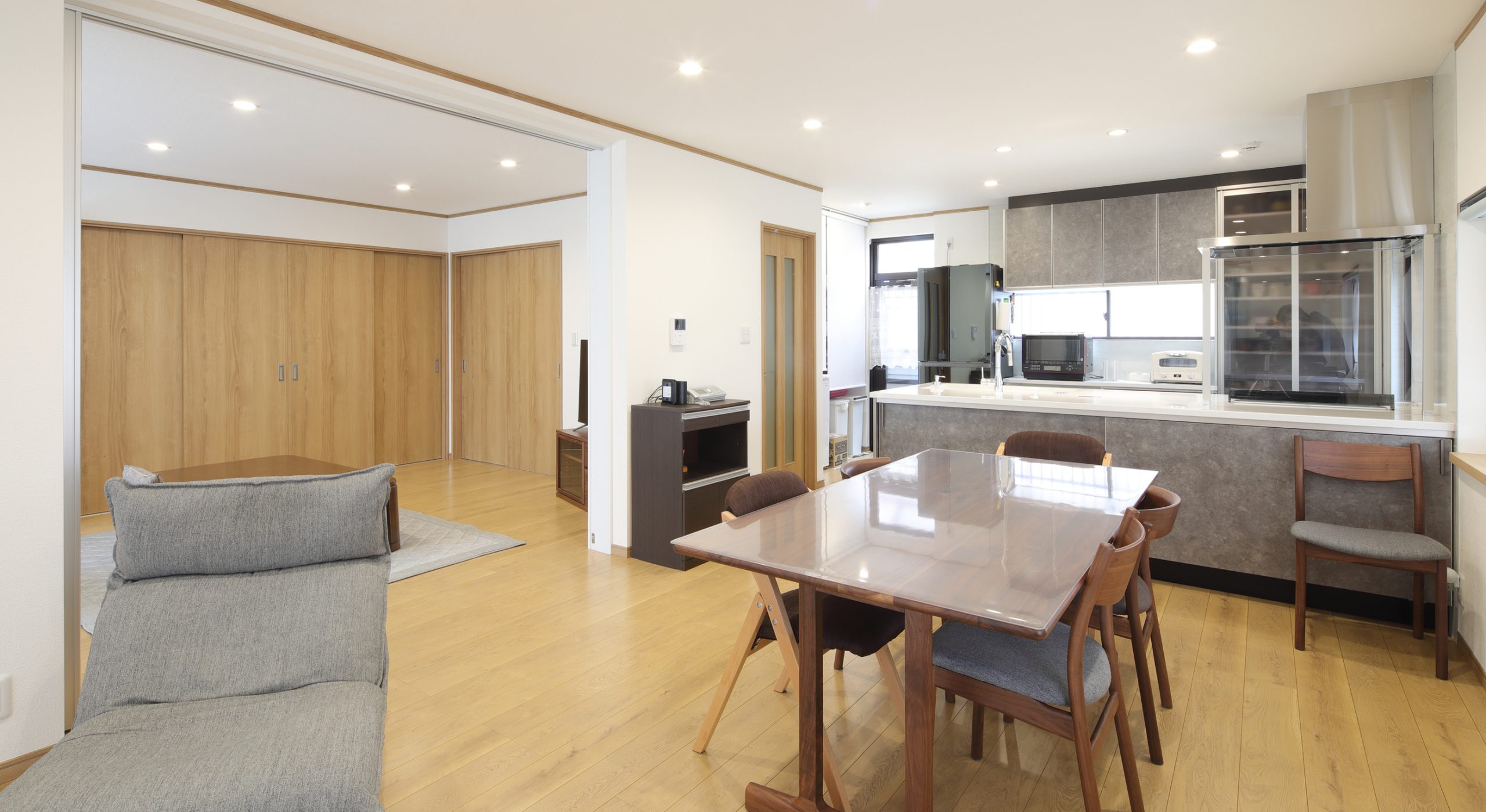リビングと和室との垂れ壁を無くし、和室を洋室に変えてリビングと一体化することによって、明るくて広々とした大空間のLDKをご提案させていただきました。また、二つの部屋を間仕切ってお使いいただくこともできるように、スライディングスクリーン(間仕切り開閉壁)を設置して、柔軟な間取りをご提案しました。