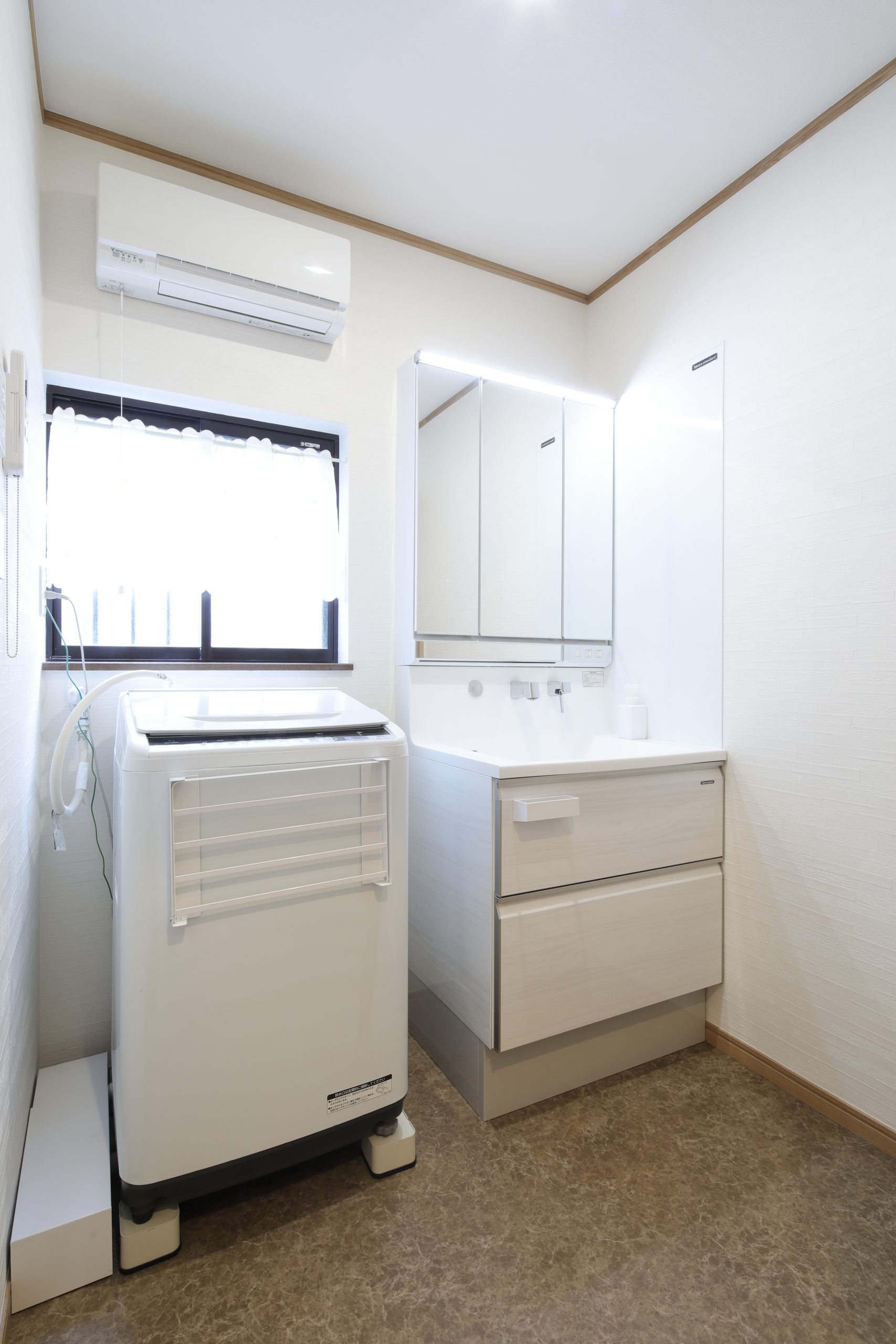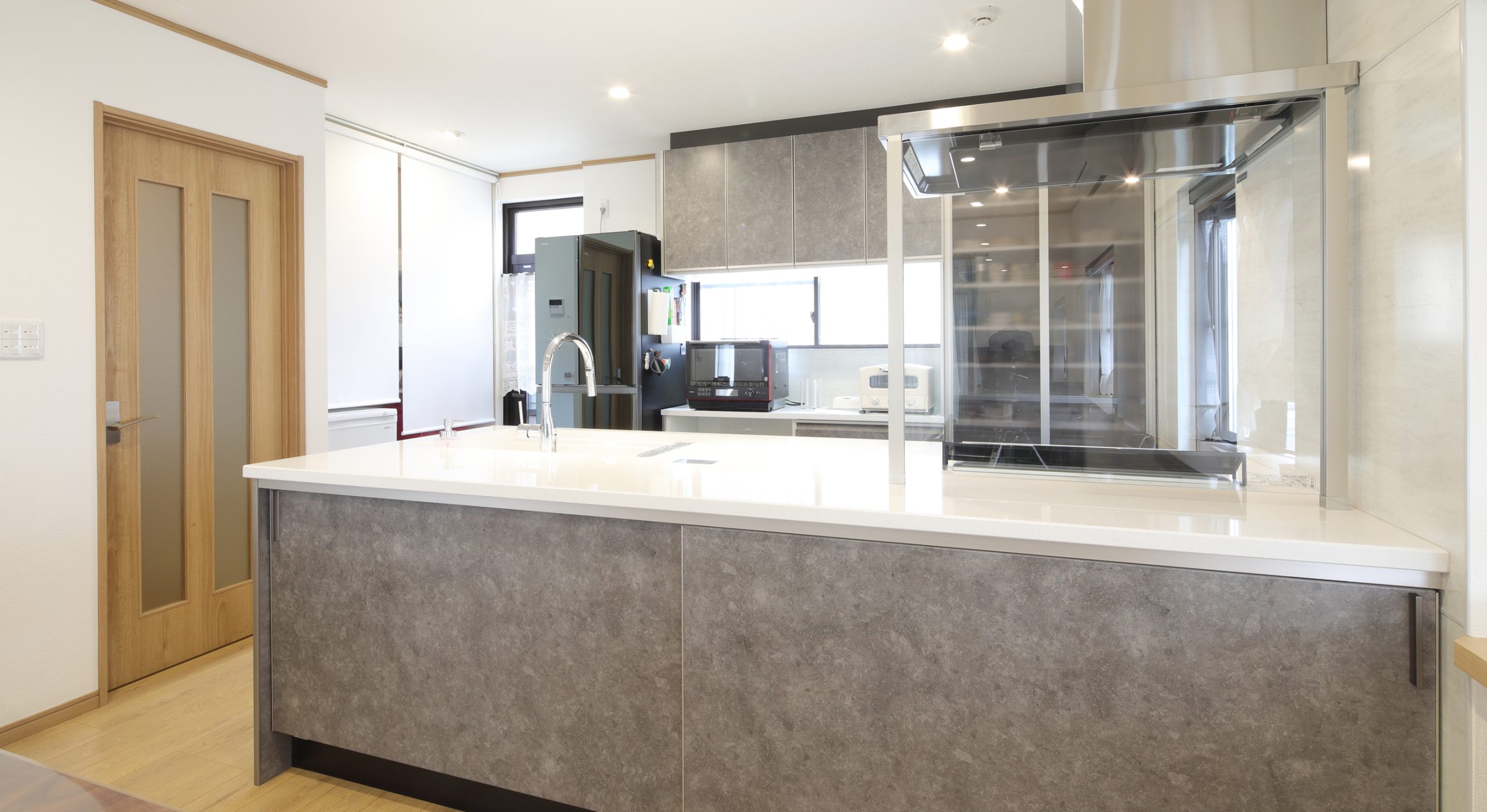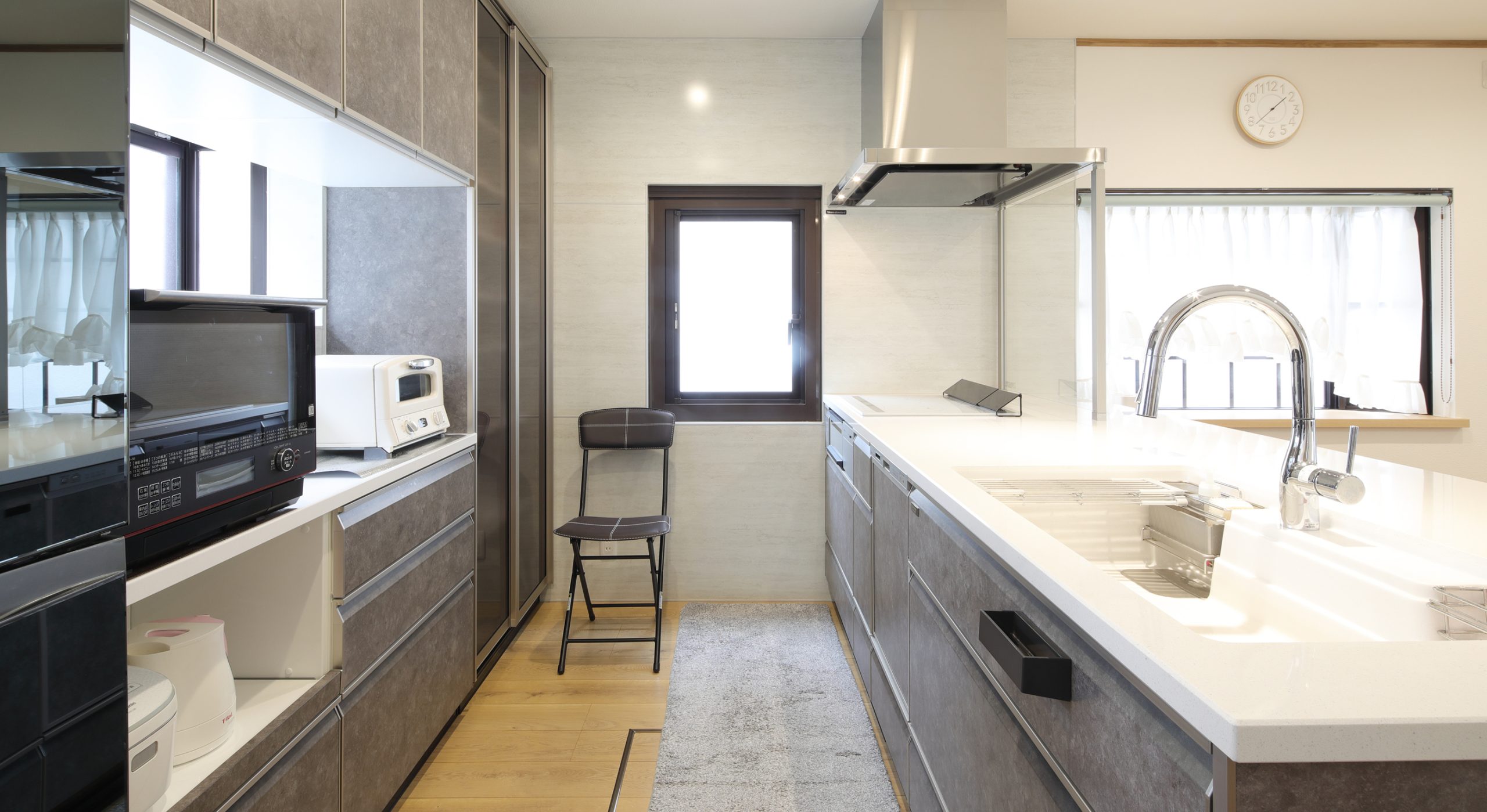 システムキッチン取替え、洗面化粧台取替え、フローリング上張り、和室から洋室に改修、スライディングスクリーン設置、内装建具取替え、玄関ドア取替え、勝手口ドア取替え、出窓取替え、パントリー可動棚設置、クロス貼替え、カーテン取替え -