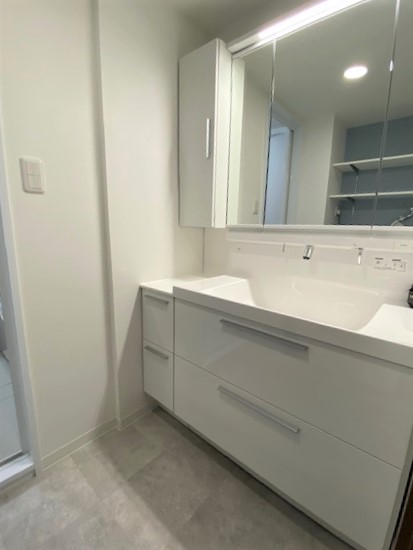 洗面室には、造作のオープン可動棚で使い勝手のよい収納スペースを設けました。また、洗面化粧台は使いやすくてお手入れもラクなハイバック仕様に取替えて、収納キャビネットも増やしてすっきり片付く空間をご提案をさせていただきました。