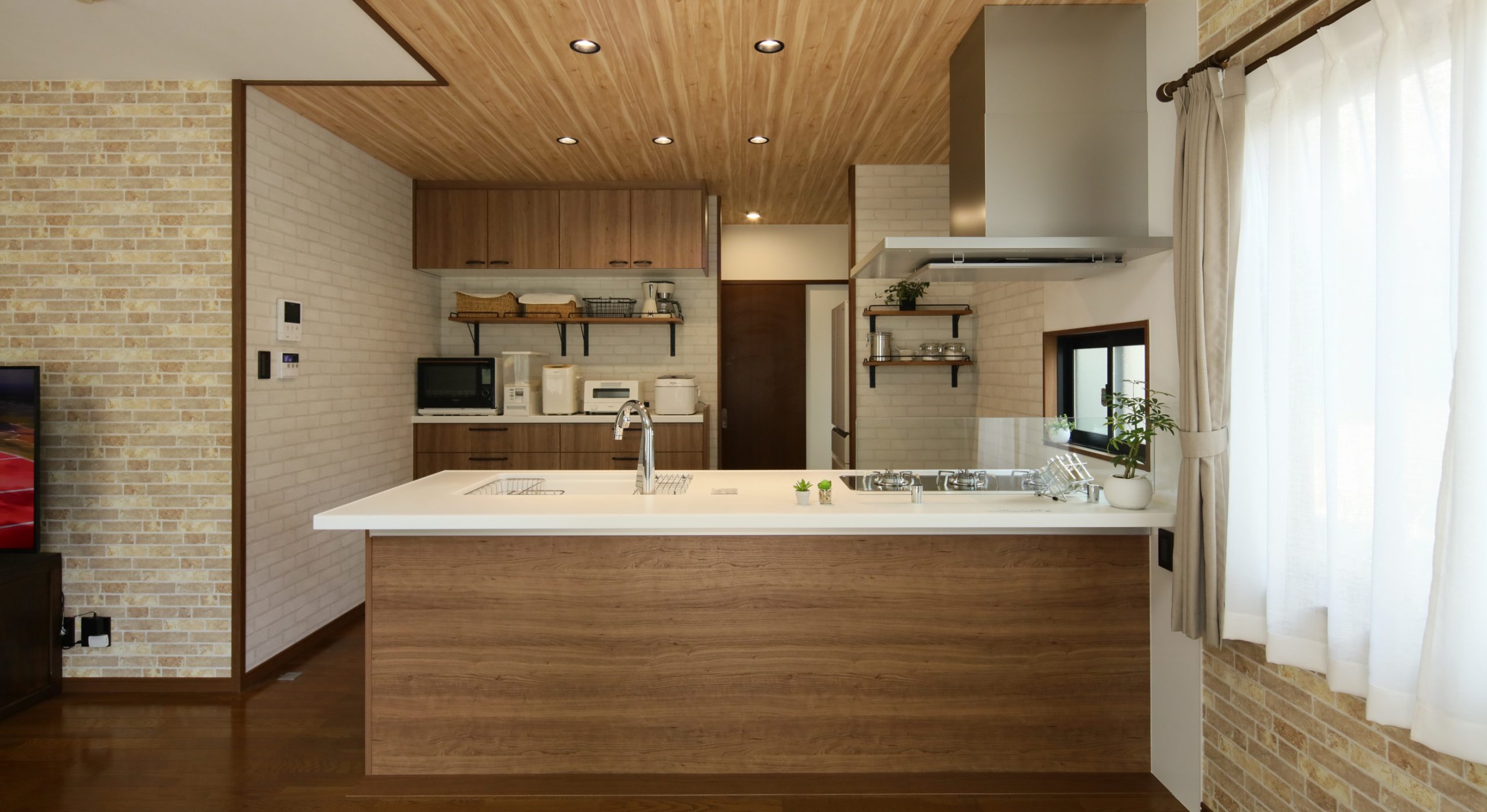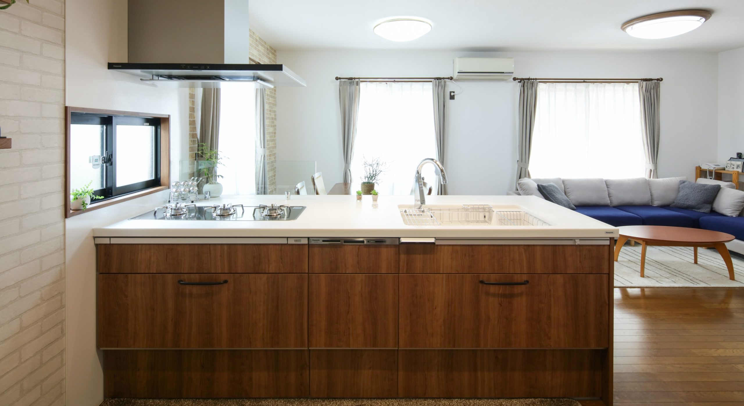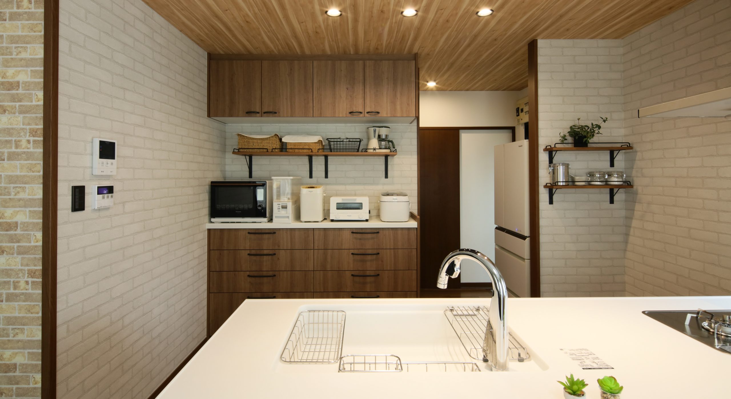 魅せるキッチンをコンセプトに、パナソニックのキッチンに合わせてキッチンエリアが目立つようにグレーのタイル調のクロスにWOODONEの無垢材の棚を取り付けました。