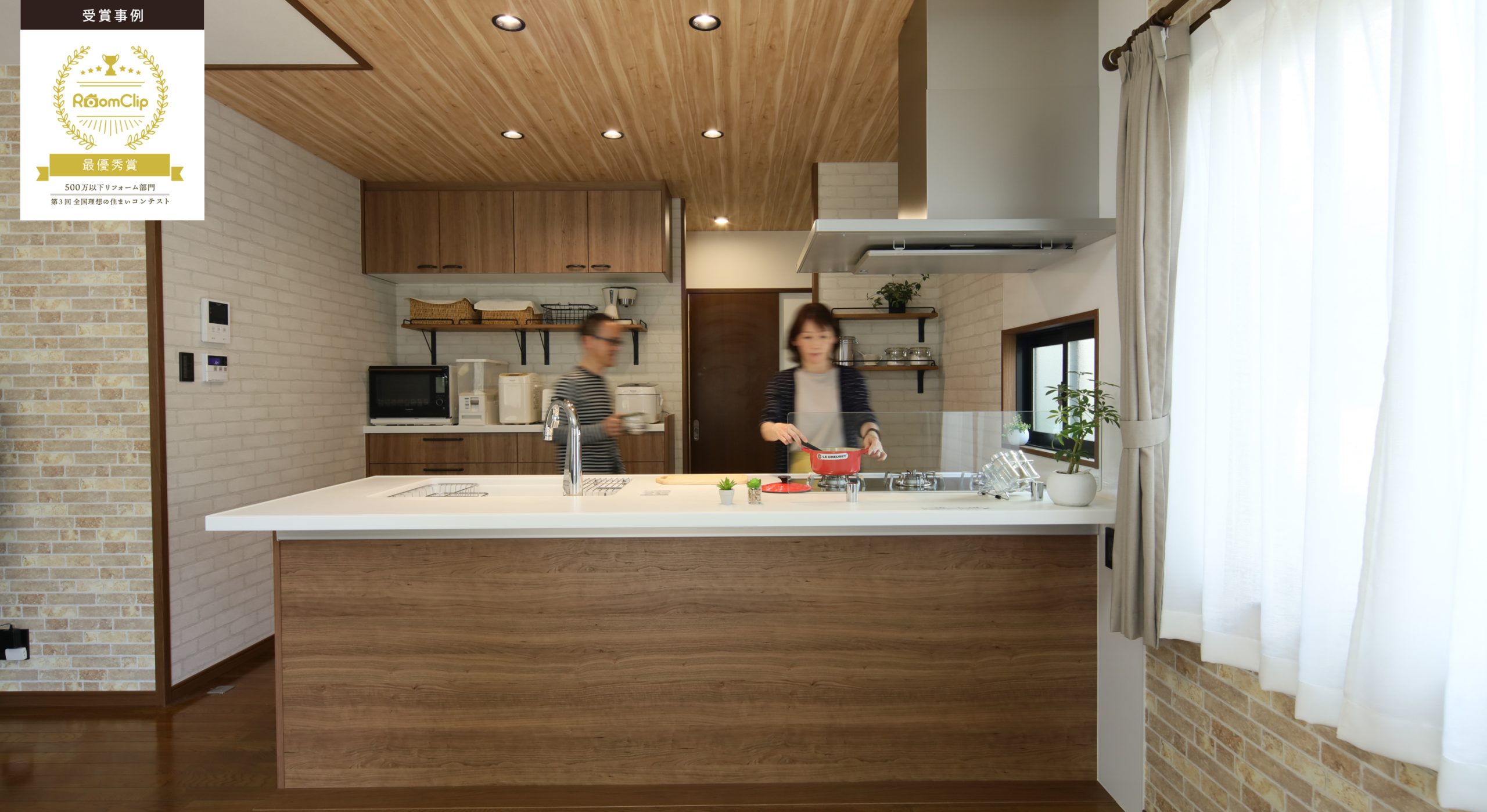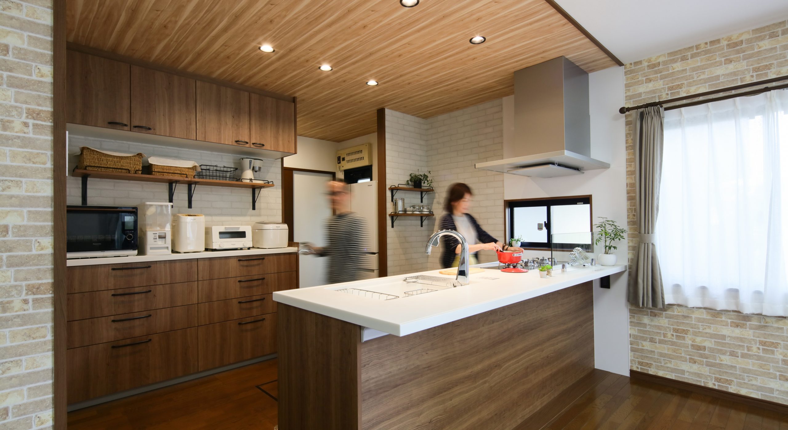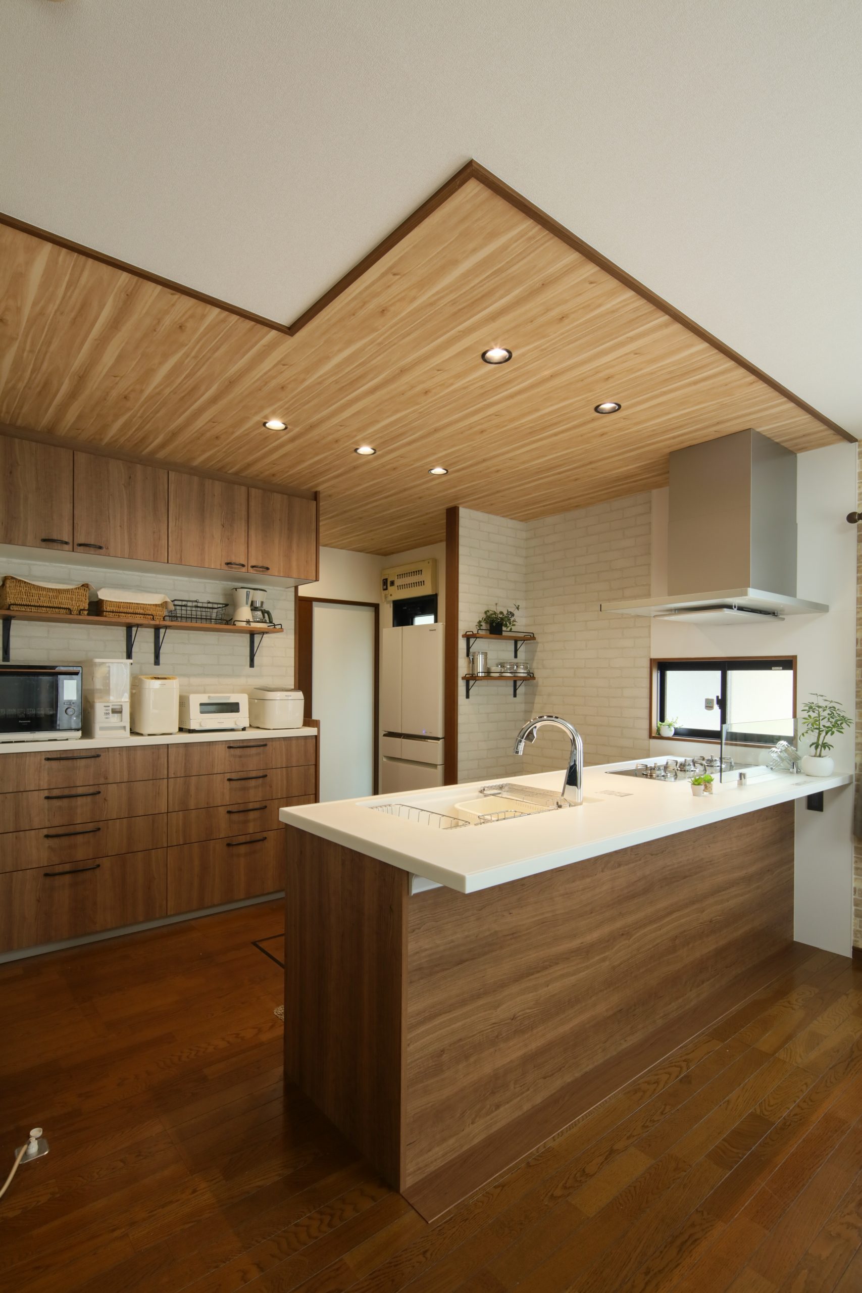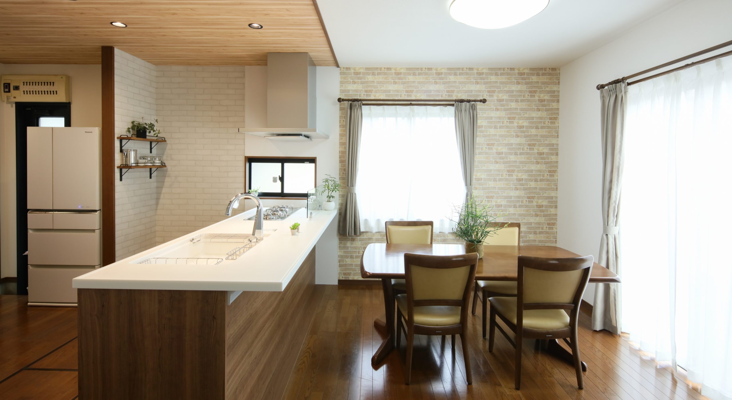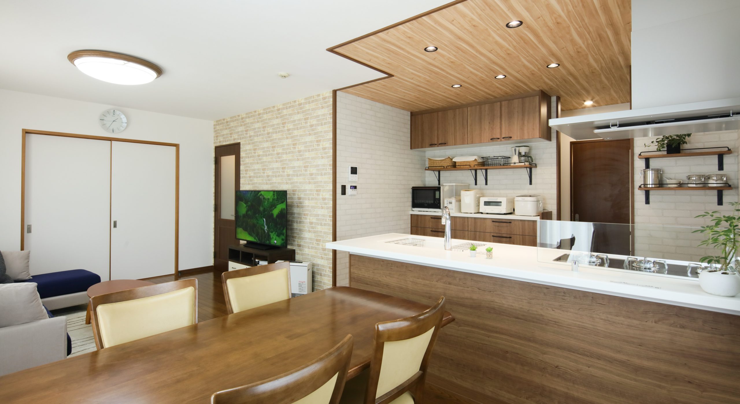 天井には奥行きが出るように明るい木目調のクロスを縦貼りに。ダウンライトで明かりの取り方も工夫しました。色味は完成イメージ図を作成し、お客さまと一緒にイメージしながら決めさせていただきました。