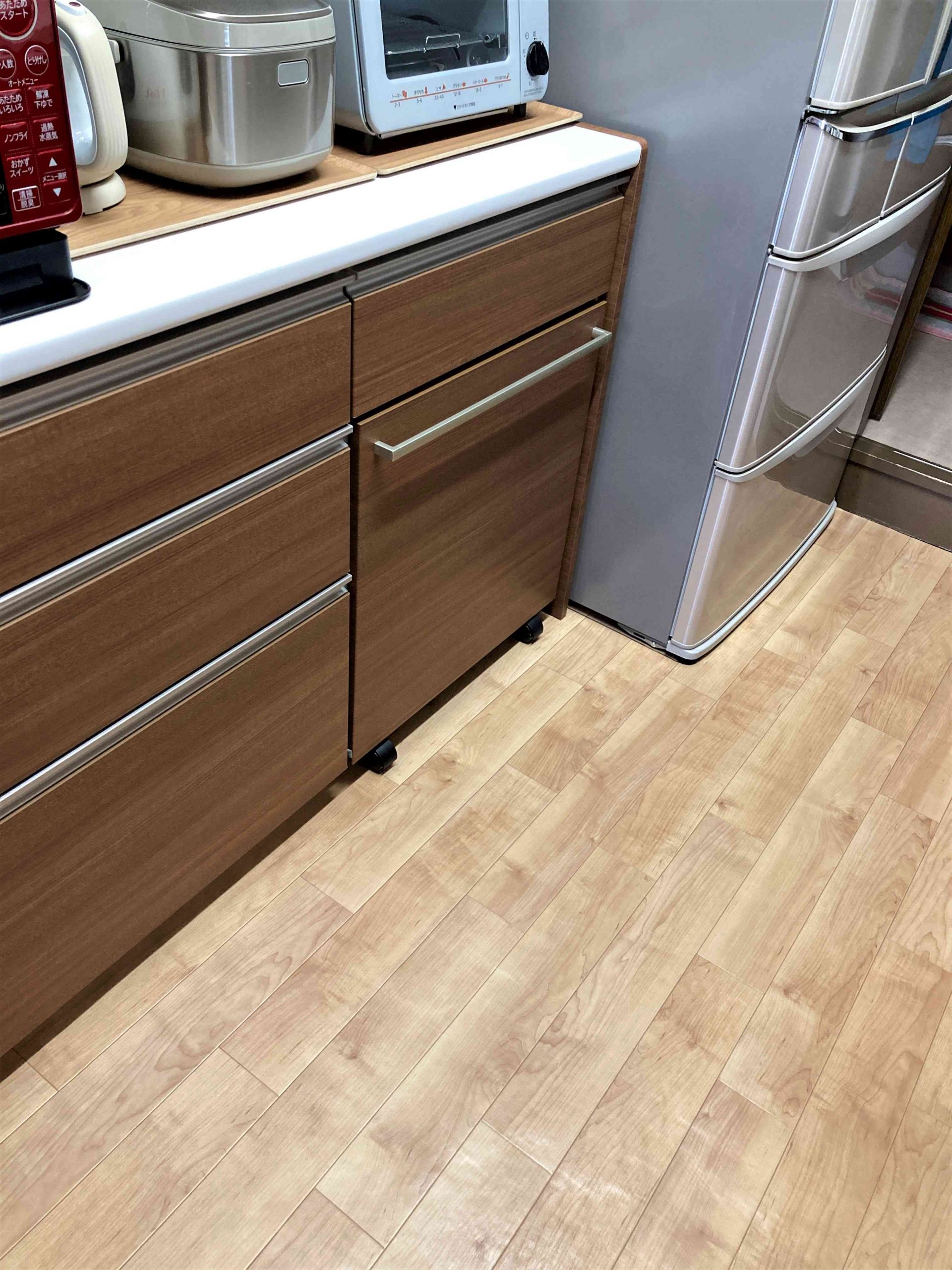今回は、キッチンのカップボード下に収まるダストボックスワゴンをご提案させていただきました。カップボードと同じ面材なので外から見てもゴミ箱があるとは分からず、キッチンがすっきり片付きました。見た目だけでなく、キャスター付きなのでゴミ箱の出し入れもスムーズになり使い勝手もよくなりました。