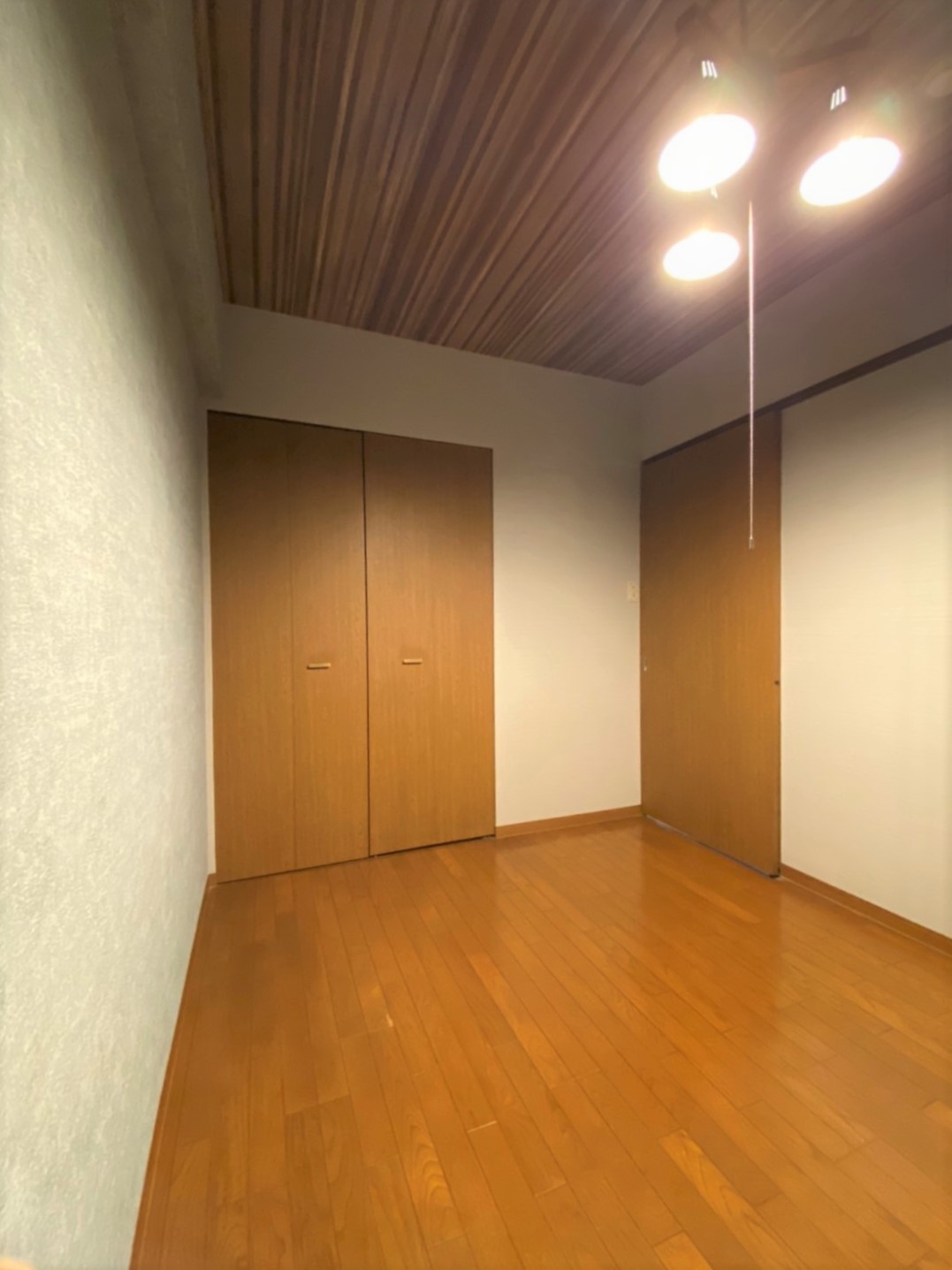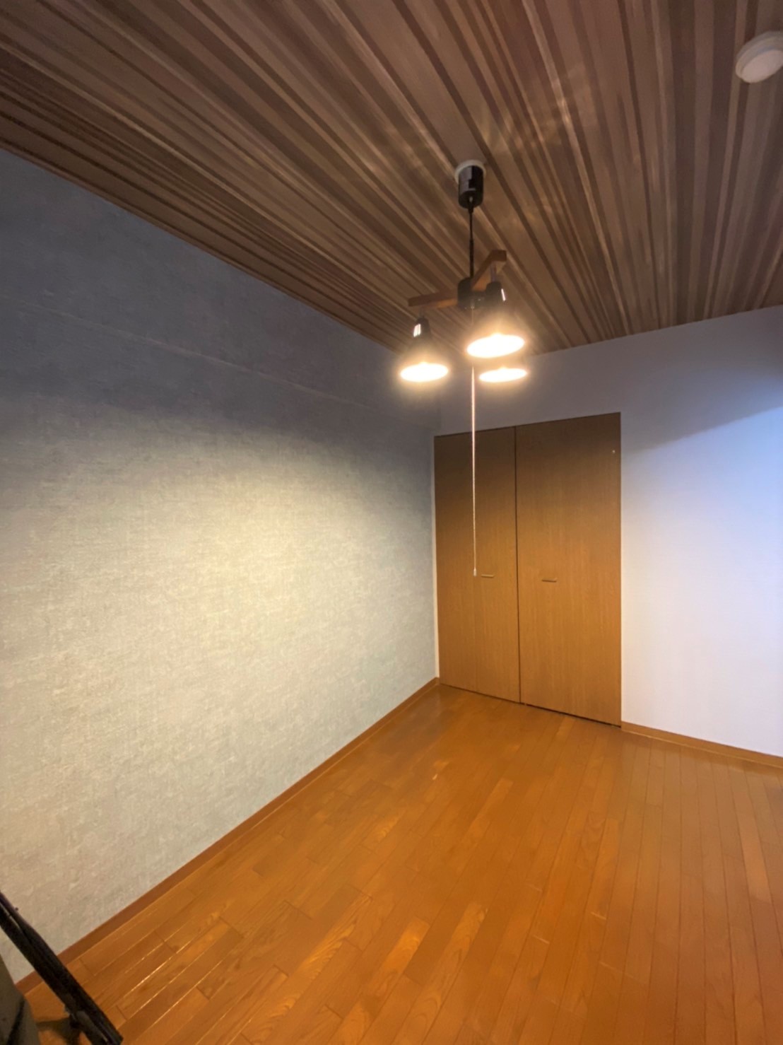 洋室は、いずれ奥さまのお部屋としてお使いになるとのことでした。そこで、奥さまのお好きなテイストをお伺いして、ヴィンテージ感のあるインダストリアルな雰囲気で3パターンほどご提案させていただきました。ベースクロスはグレーでまとめて、アクセントクロスに奥さまのお好きな色味をお選びいただき、天井は落ち着いた木目調にして、重厚感の中に洗練された雰囲気のある空間に仕上げました。